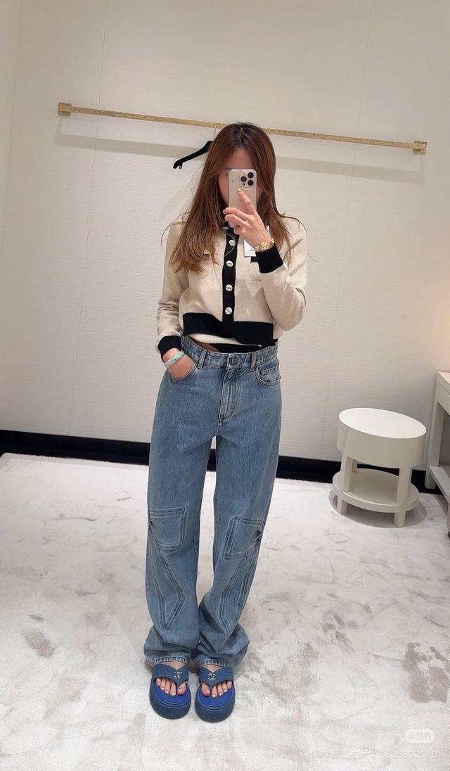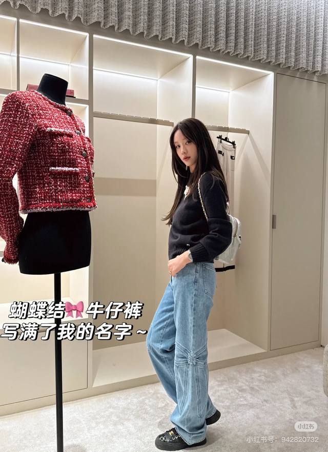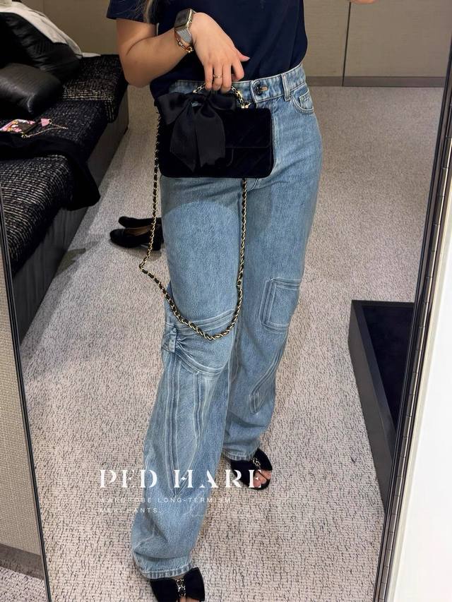 Chane* New High-End Custom Washed Denim Cotton Fabric, Oversized Bow Double C Logo Buttons, High-Waisted Versatile Straight Leg Jeans! Blue, Sizes 36, 38, 40. Size 38: Waist 70cm (non-stretch), Length 105cm. (DDD)