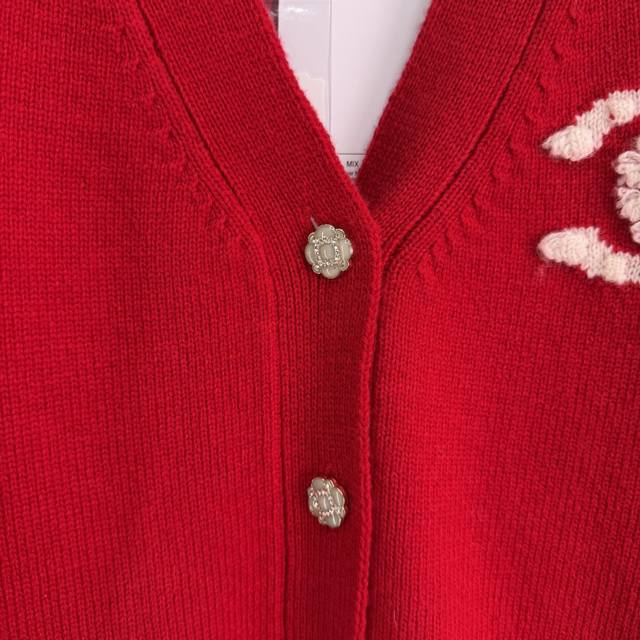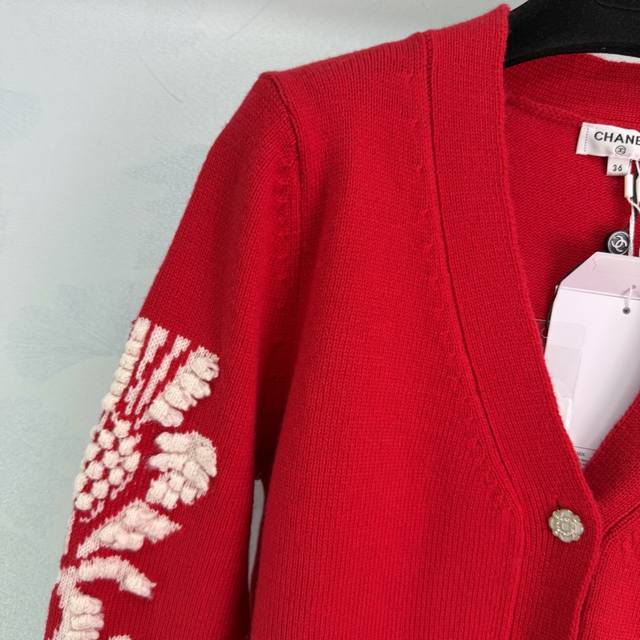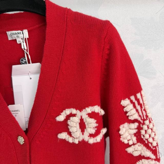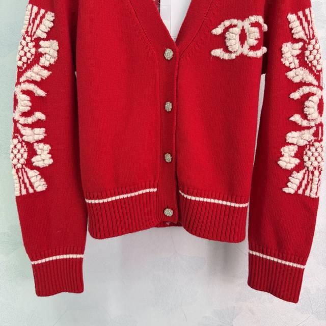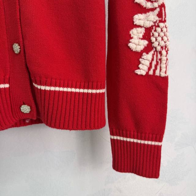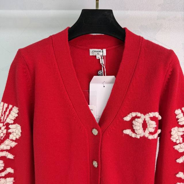 Chane*2025 Autumn/Winter New Camellia V-Neck Knit Cardigan, custom-made with Yb cashmere yarn, fine knit, clear embroidered crochet texture, soft and comfortable against the skin. V-neck, button-down, cardigan cut. The front is adorned with rhinestone flower-shaped round buttons that reflect light, creating a luxurious and elegant look. The elbows are decorated with three-dimensional embroidery of camellia flowers, complemented by contrasting stripes at the hem and cuffs, enriching the design and creating a casually chic and relaxed style! 3 colors, 3 sizes: S, M, L, T226B, DDD