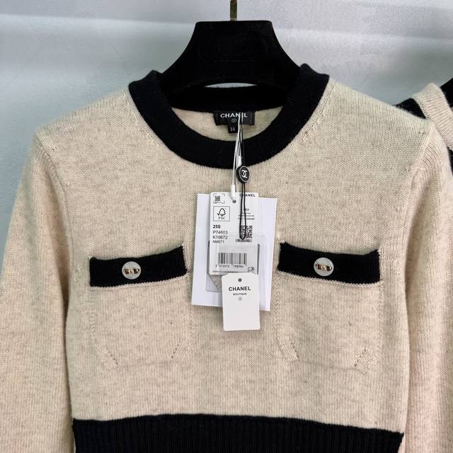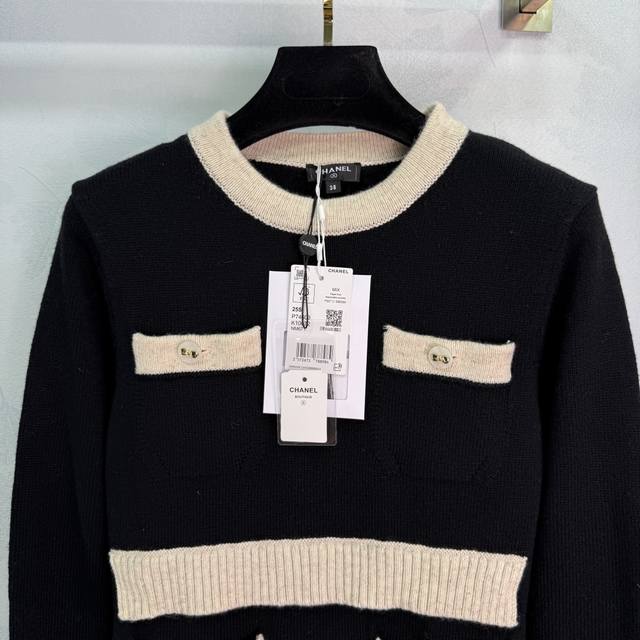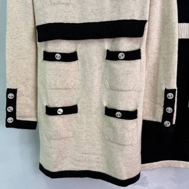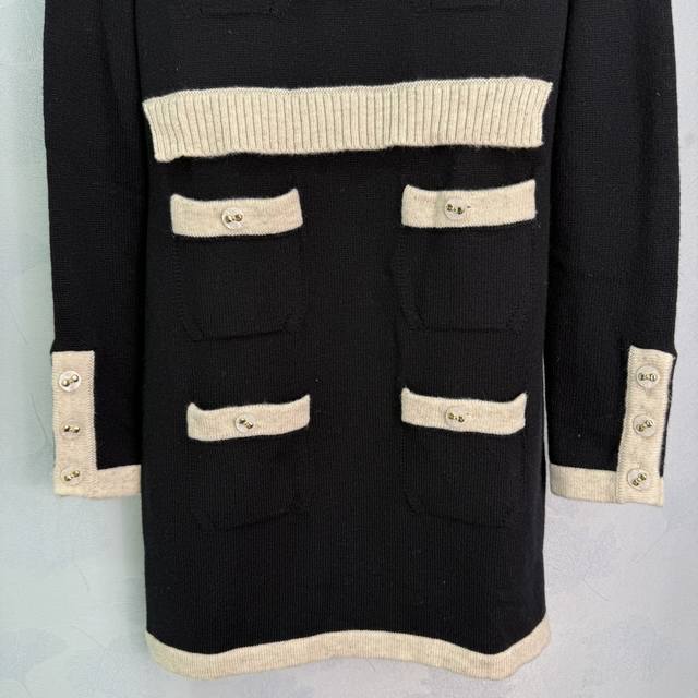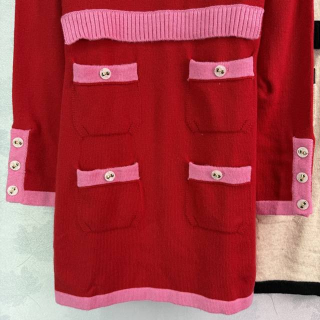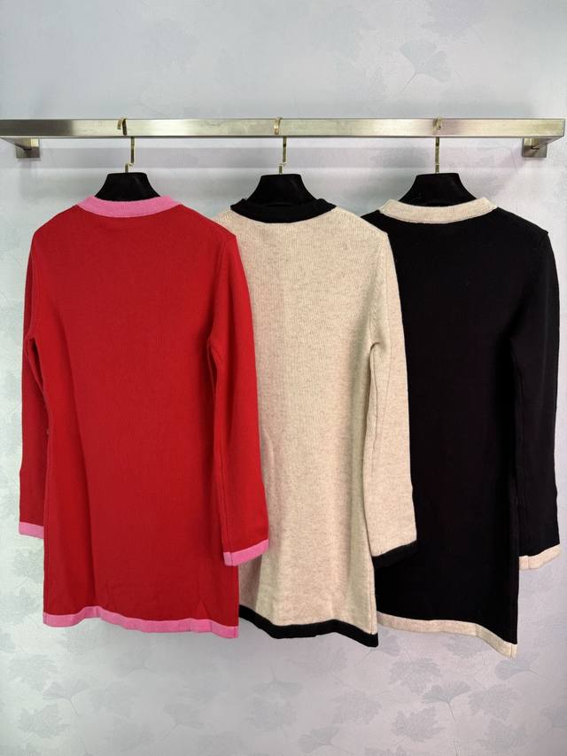 Chane*2025 Early Fall new style knit dress with contrasting pockets. Custom-woven YB cashmere yarn for a lustrous, soft, and skin-friendly look. Round neckline, relaxed yet stylish. Straight shoulders for a fitted silhouette. Contrasting hem, multiple pockets at the top, complementing the overall look. Elastic thread closure, round buckle, and lustrous logo accents enhance the look. Waist, cuffs, and hem details complement the elegant silhouette. Available in 3 colors and 3 sizes. Sml