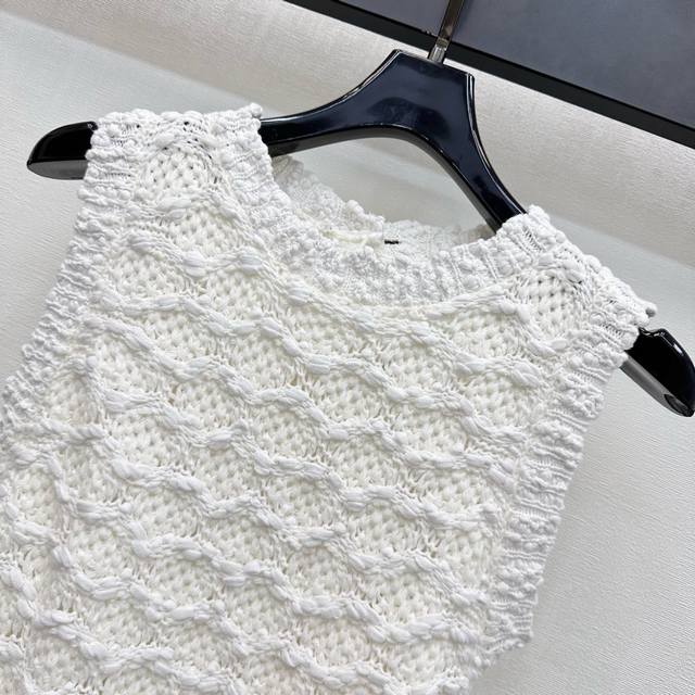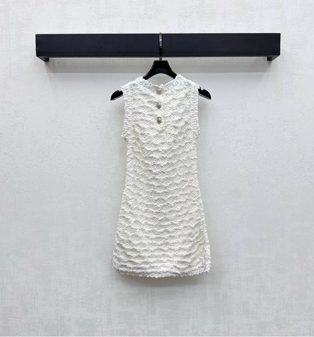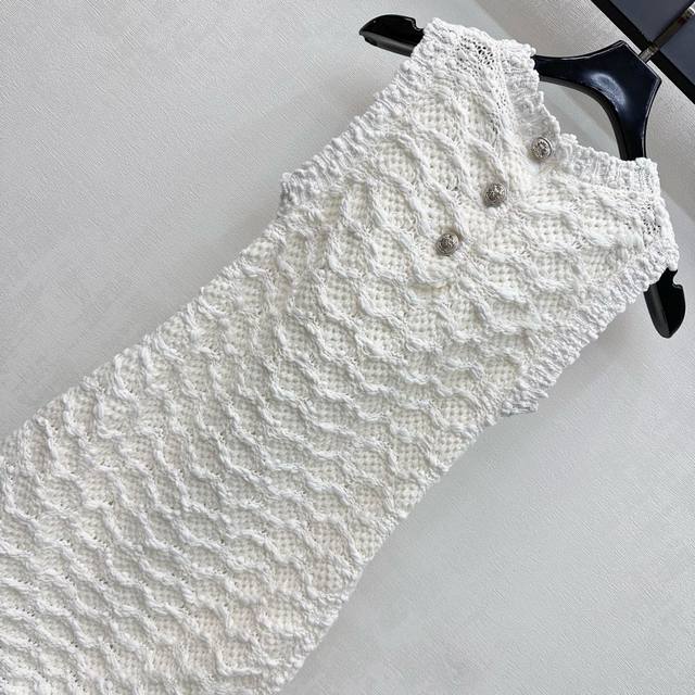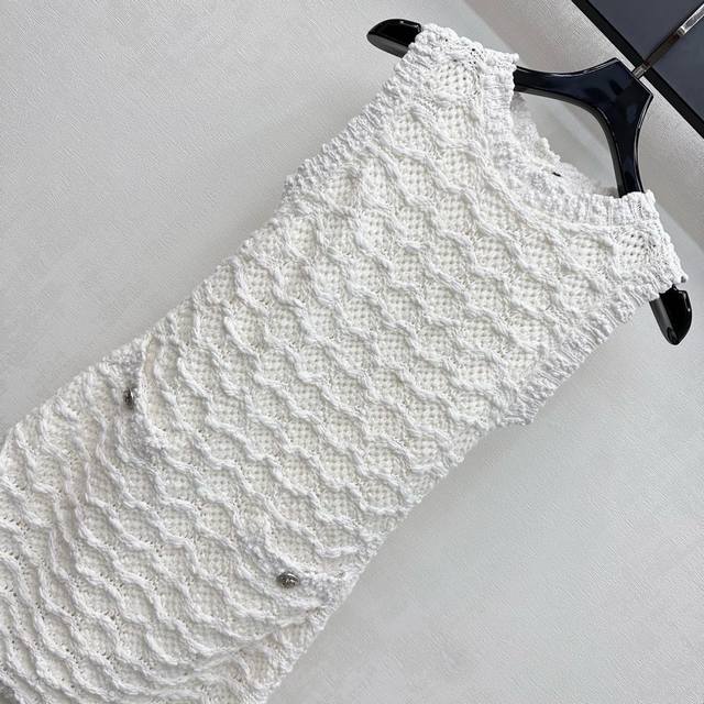 Chane*2025 New Arrival: 3D crocheted vest dress. Custom-made YB imported knit material, comfortable, soft, and stretchy. Fully 3D crocheted pattern accentuated by hemming details, adding dimension. Half-open placket at back, buttoned, and embossed with the iconic logo, the logo and symmetrical pockets complement the brand's signature design. Round neck, sleeveless dress cut for everyday wear. High-end, slimming, and stylish. Available in sizes 36, 38, and 40.