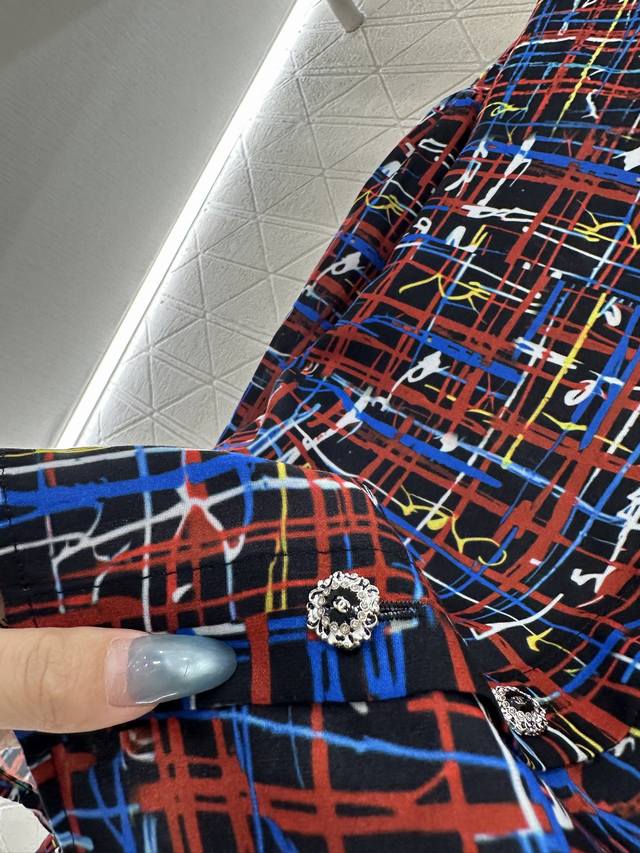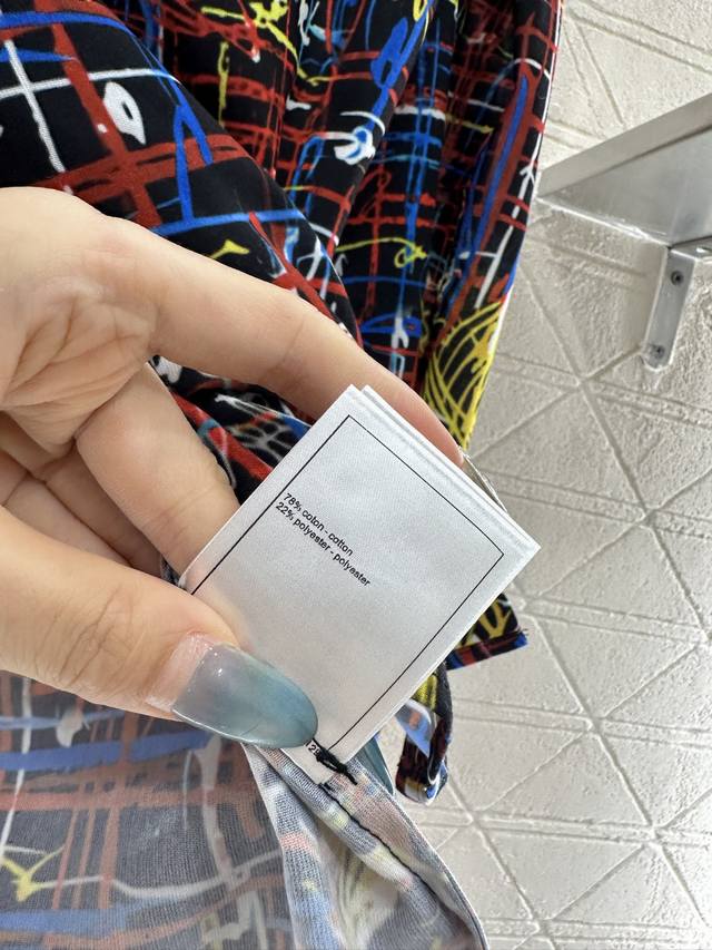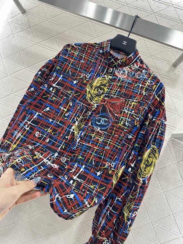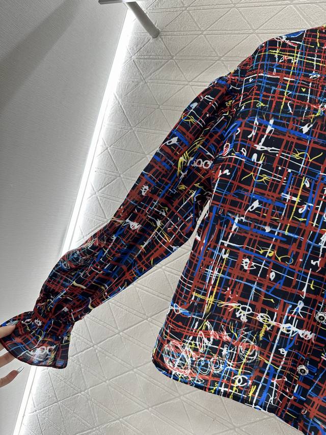 Chane*2025 New Arrival DDD Active Print Lantern Sleeve Shirt DDD Custom Yb imported silk cotton material, textured and lustrous, drapes smoothly and stylishly. Stand collar, long sleeve shirt design, all-black base, all-over colorful double C hand-painted graffiti lines, embellished with Chanel element patterns, enhancing brand recognition and bringing a strong resort vibe. Court lantern sleeve design, cuffs are cinched to resemble an inverted flower bud, adorned with delicate rhinestone double C buttons, highlighting the design and making it more fashionable and stylish. It is slimming and flattering, and its lightness breaks the dullness of autumn and winter, bringing a brand new experience to early spring vacations. It also pairs perfectly with fur. Custom fabric and accessories, look for high-version 36 38 40. DDD