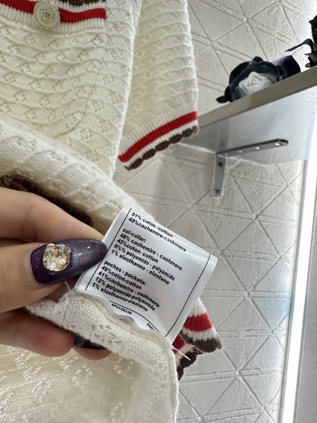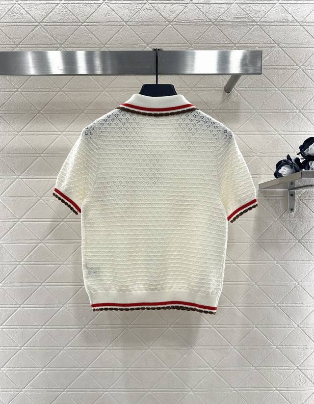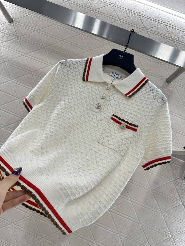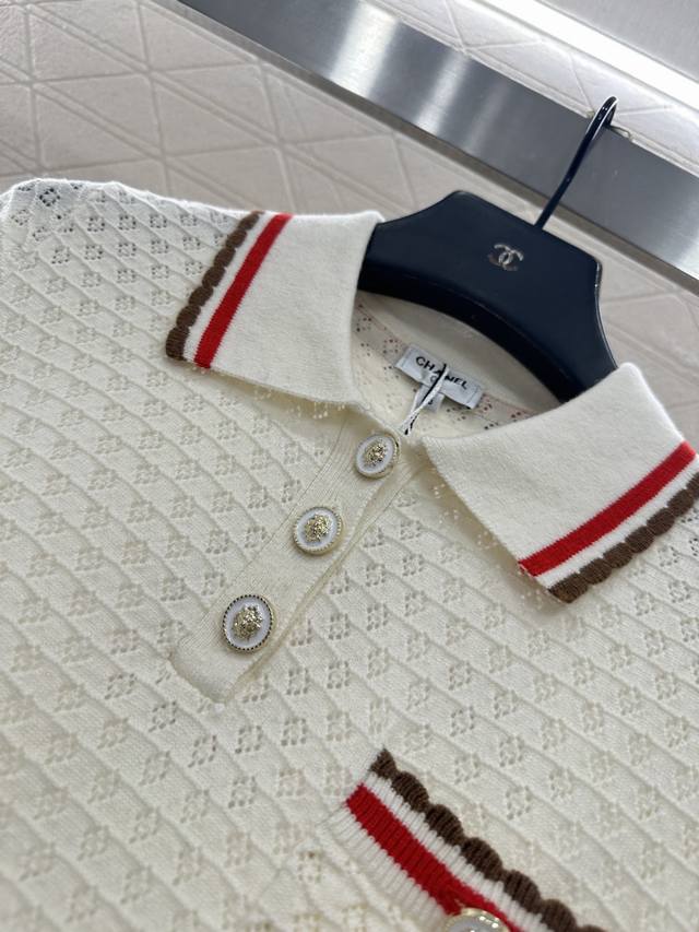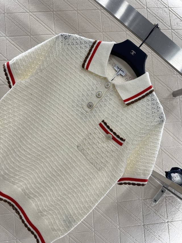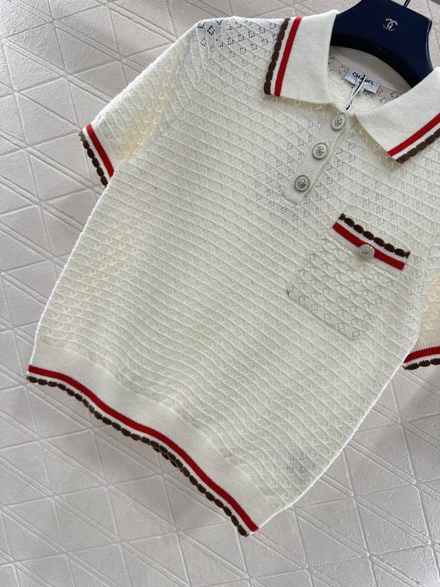 Chane*2025 New Arrival DDD Color-blocked Collared Knit Short-Sleeve T-Shirt DDD Made with custom Yb cashmere yarn, fine-density knit, soft and comfortable against the skin. Features a collared, half-open collar, horizontal openwork crochet texture, and camellia-shaped round buttons for an elegant look. The color-blocked trim extending from the collar and front to the hem and cuffs, along with matching pocket edges, adds depth and a stylish touch. Comes with a subtle diamond-patterned dust bag. High-quality custom fabrics and accessories. Available in black and white. Sizes: 36, 38, 40. DDD