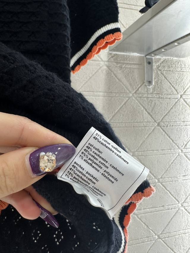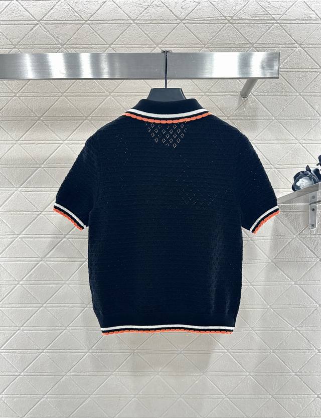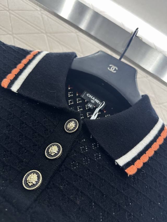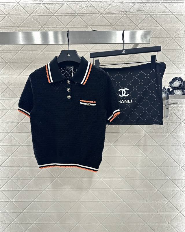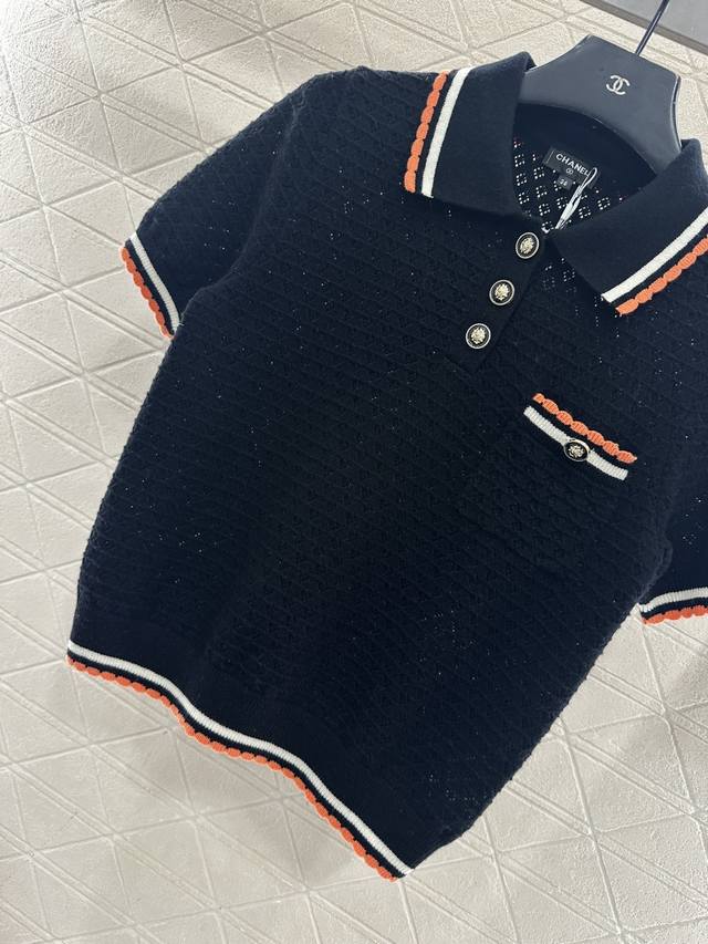 Chane*2025 New Arrival DDD Color-blocked Collared Knit Short-Sleeve T-Shirt DDD Made with custom Yb cashmere yarn, fine-density knit, soft and comfortable against the skin. Features a collared, half-open collar, horizontal openwork crochet texture, and camellia-shaped round buttons for an elegant look. The color-blocked trim extending from the collar and front to the hem and cuffs, along with matching pocket edges, adds depth and a stylish touch. Comes with a subtle diamond-patterned dust bag. High-quality custom fabrics and accessories. Available in black and white. Sizes: 36, 38, 40. DDD