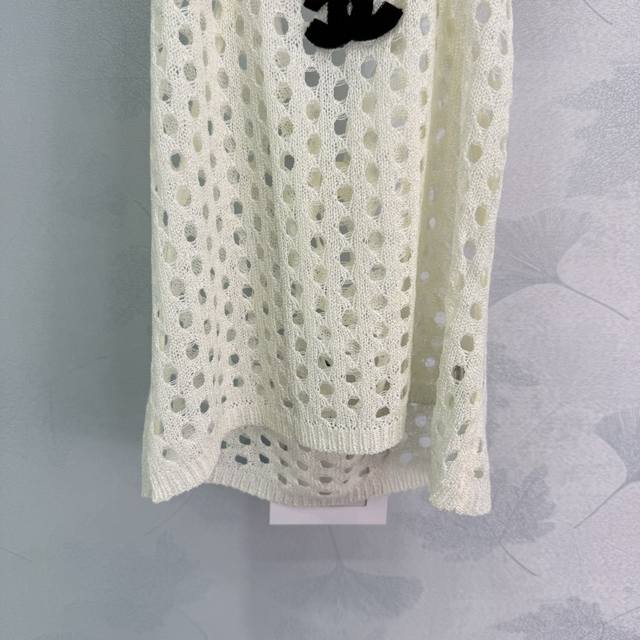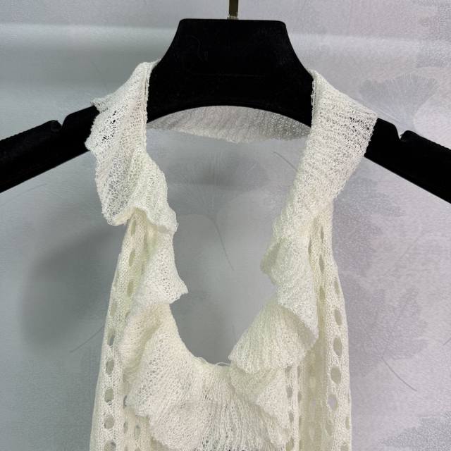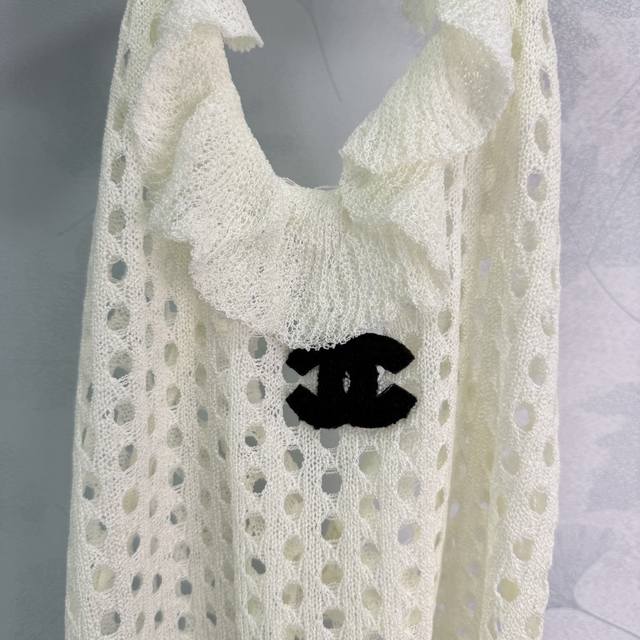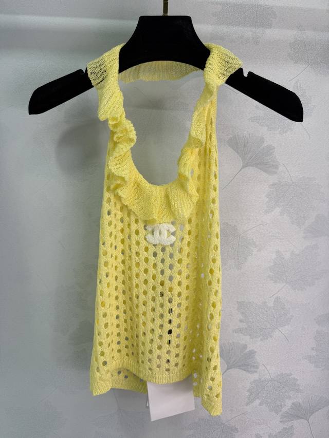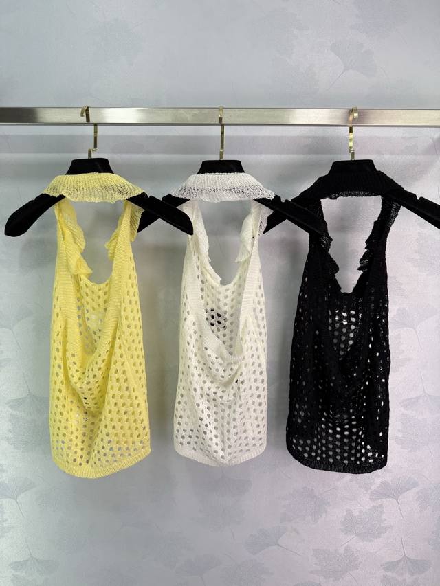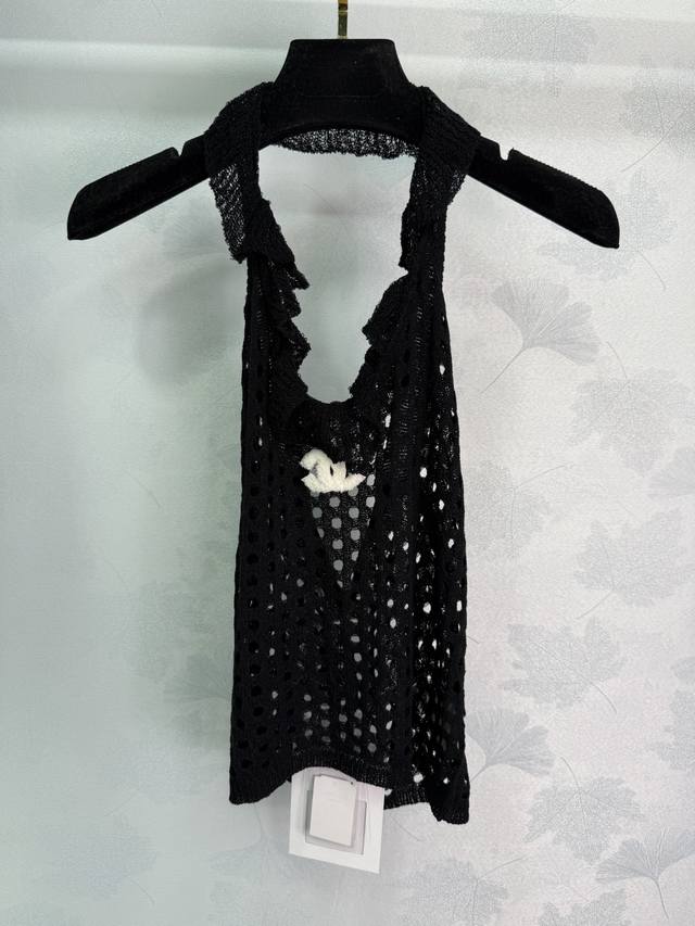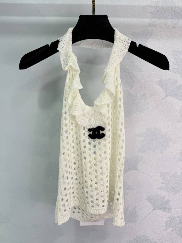 Chane*2025 New arrival Halter neck lace hollow knitted vest Customized Yb wool yarn weaving Elasticity Comfortable breathable and easy to wear Halter neck knitted vest Cut moderately revealing skin Hollow and transparent effect Beautify the head and shoulder ratio and make you look thinner The chest is decorated with plush double C letter logo Retro hot girl style Strong slim fit Matching collar edge Three-dimensional pleats Fungus lace edging Texture style Playful age-reducing layered effect More rich and fashionable Customized surface and auxiliary materials Look for the high version 3 colors 3 sizes Sml T226B