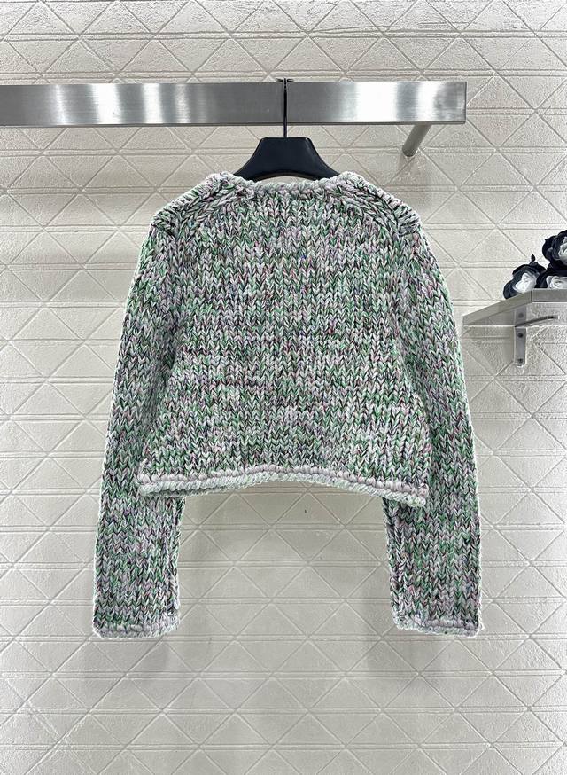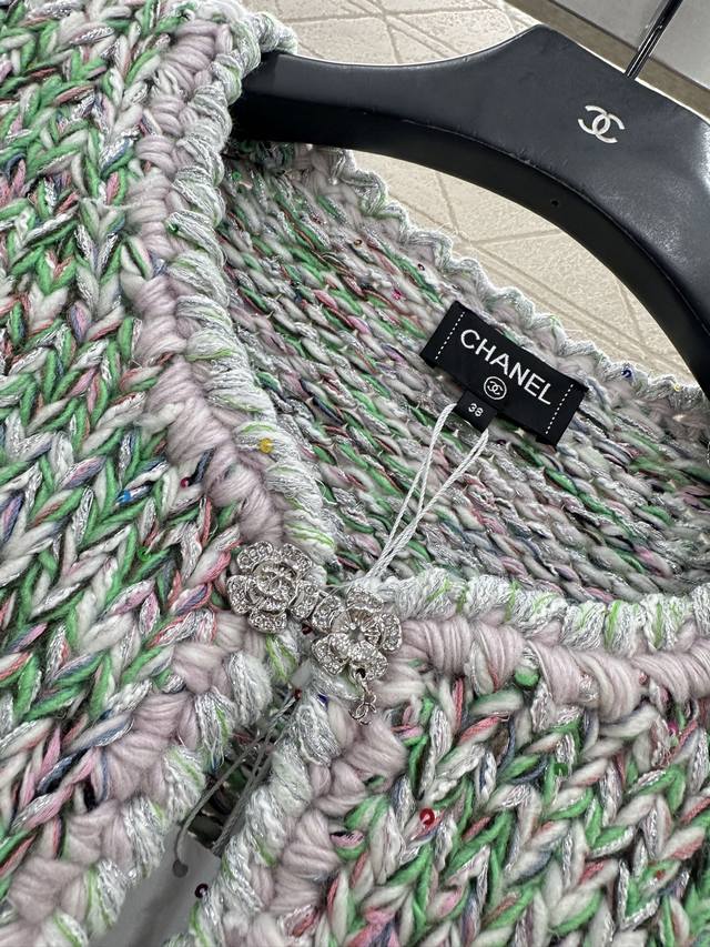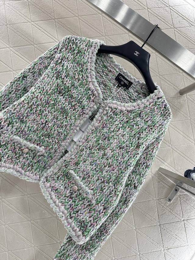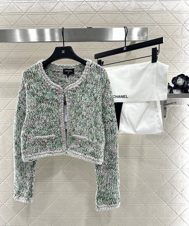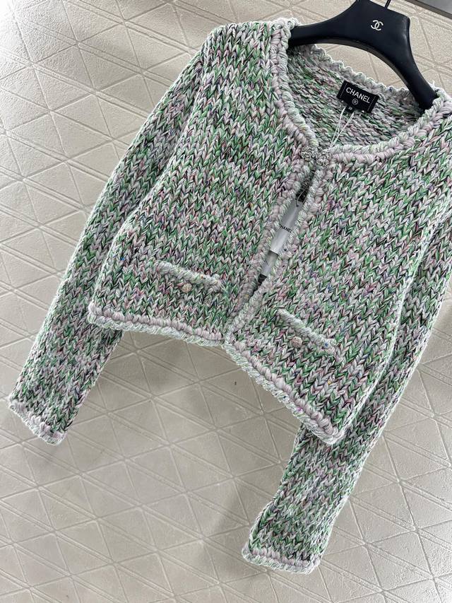Chane*2025 New Arrival DDD Hand-knitted Cardigan with Crocheted Edges DDD Crafted with custom Yb cotton yarn, this cardigan is comfortable, soft, and delicate. It features a round neck and long sleeves, adorned with crocheted edges, symmetrical pockets, a camellia logo on the placket, and matching buttons, creating a rich and luxurious look that reflects the brand's style. The garment boasts a dense crocheted texture with a refreshing green polka dot pattern, exuding a gentle and sophisticated vintage style. Perfect for dates or commuting, this hand-crocheted cardigan perfectly replicates the original quality, easily surpassing other versions on the market. Comes with a delicate dust bag and custom fabrics. High-quality version available. Sizes 36, 38, and 40. DDD
