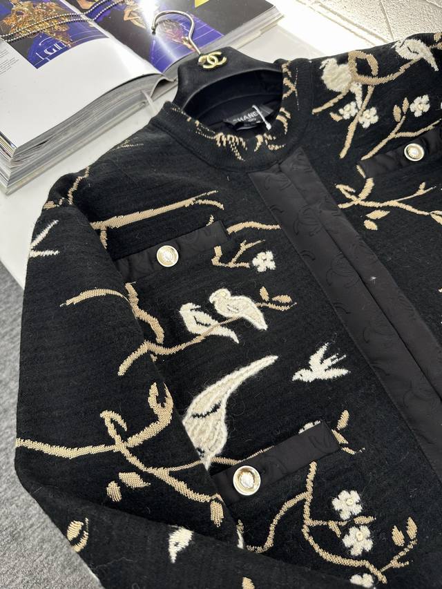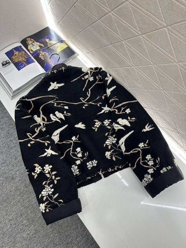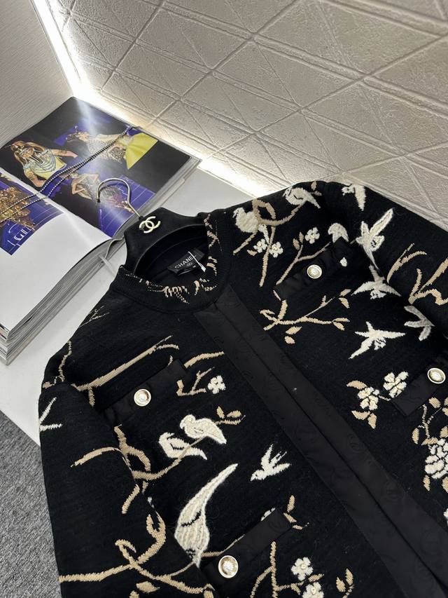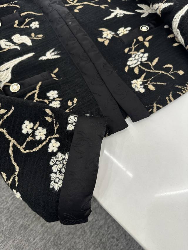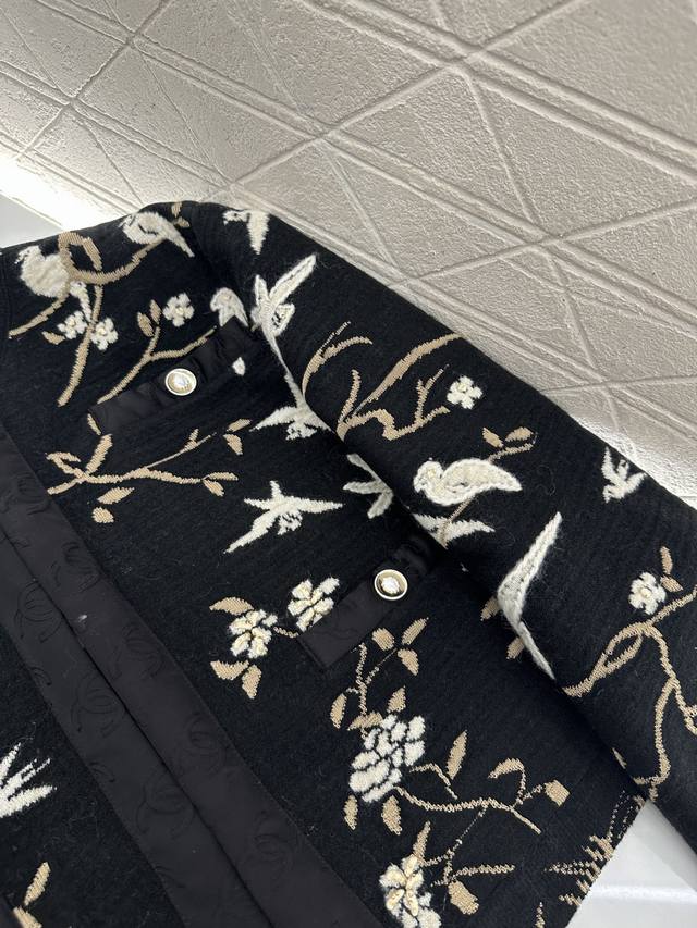 Chane*2025 New Arrival Ddd Heavy Embroidered Jacquard Jacket Ddd Custom Yb Silk and Wool Yarn Woven with High-Quality Texture, Stylish and Versatile. Features a round neck and structured shoulders knit design, adjustable hook-and-loop closure, and an all-over embroidered floral and bird motif. Jacquard trim on the front, cuffs, and upper pockets adds rich detail and exudes a refined, tranquil, and modern Chinese artistic style. Yb's top-tier heavy-duty jacquard double-C lining, custom fabrics and accessories. High-quality version available. Black. Sizes 36, 38, 40 DDD