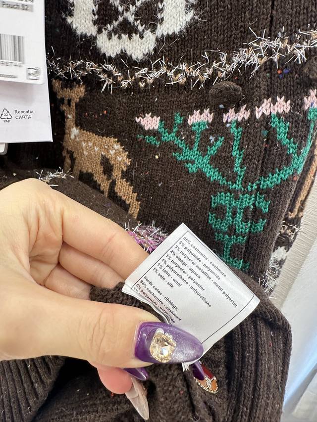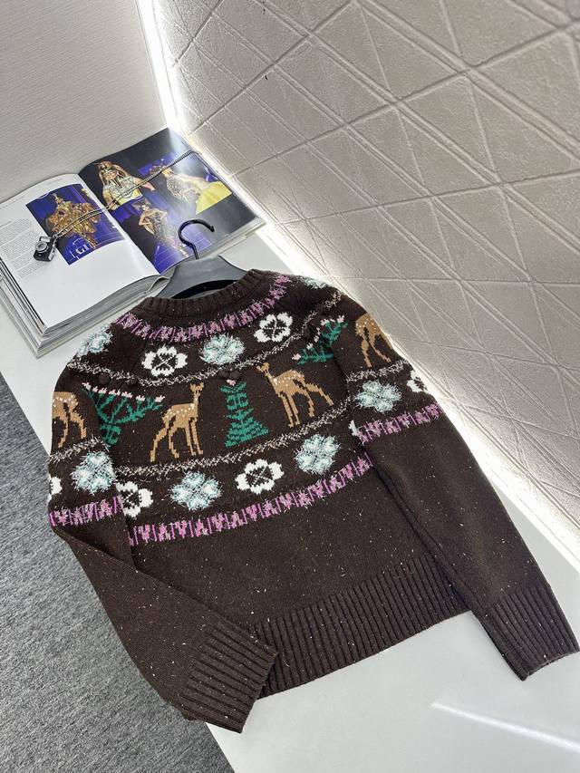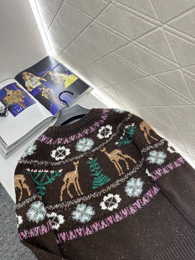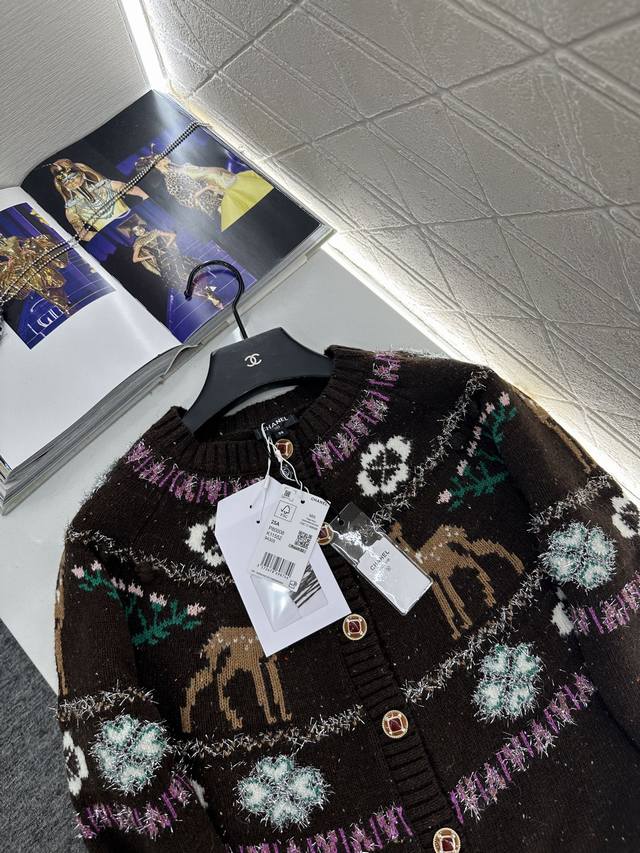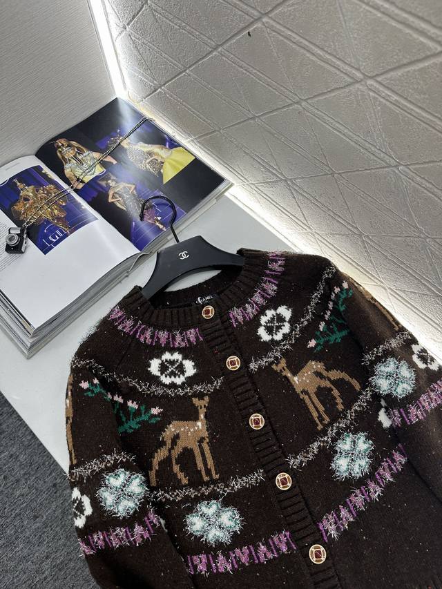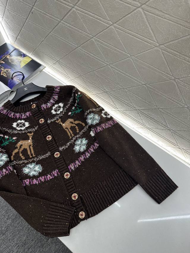 Chane*2025 New Arrival DDD Heavy-duty Crochet Crew Neck Knit Cardigan DDD 25Coco Christmas Ski Series# Custom Yb cashmere knit material, high-quality texture, comfortable and soft, crew neck knit cardigan, button-down design, ribbed trim on the neckline and cuffs echoing the hem, adorned with Fair Isle Nordic style crochet pattern interspersed with deer motifs, exquisite details showcasing the brand's style, cashmere knit fabric, warm and comfortable, regular fit, stylish and fashionable, the first choice for various holiday seasons, sure to make you the center of attention. Custom fabric and accessories, look for the high-quality version, 3 colors 36 38 40. DDD