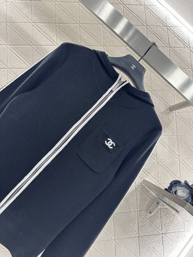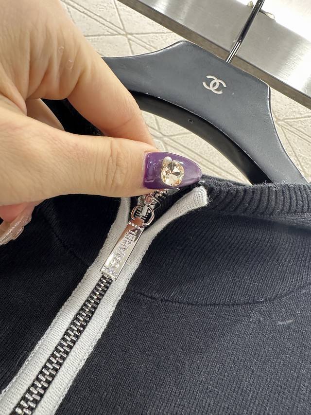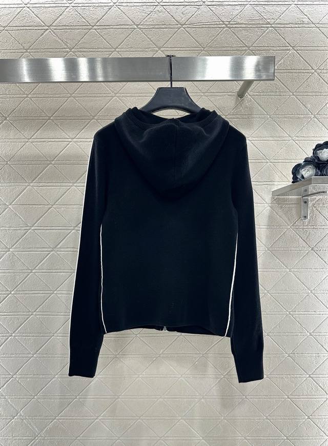 Chane*2025 New Arrival DDD Hooded Knit Zip-Up Jacket DDD 25Coco Ski Series# Custom Yb wool yarn weave, delicate texture, comfortable to wear. Hooded zip-up lightweight jacket cut, narrowed with elastic ribbed trim. Double C logo contrasting decoration on the chest pocket. Striped details on the outer side of the shoulder and sleeve extensions echo the front placket, creating a ribbon effect. The overall shape is slimming and stylish. Armholes secure the thumb position for better warmth and prevent shifting. A fashionable choice for layering or wearing alone in autumn and winter. Custom fabric and accessories, high-quality version. 2 colors, sizes 36, 38, 40. DDD