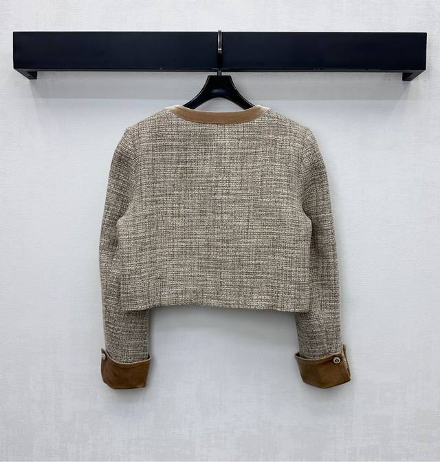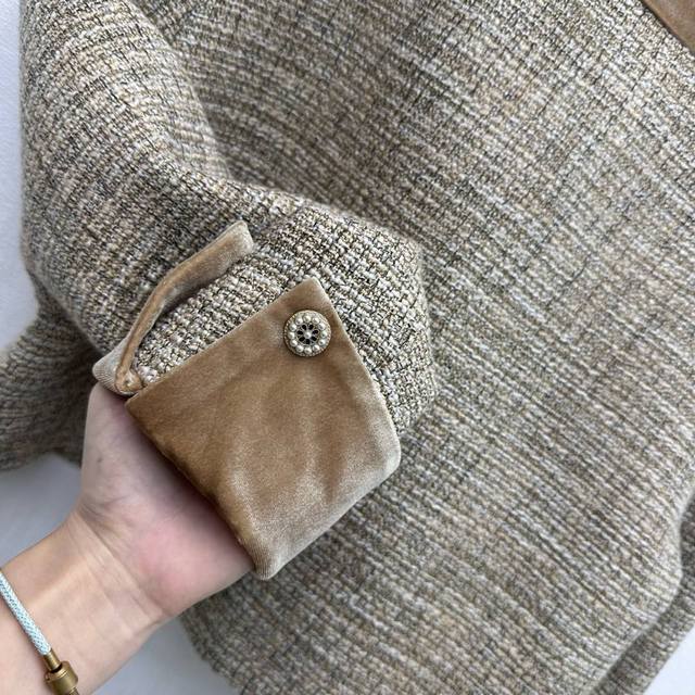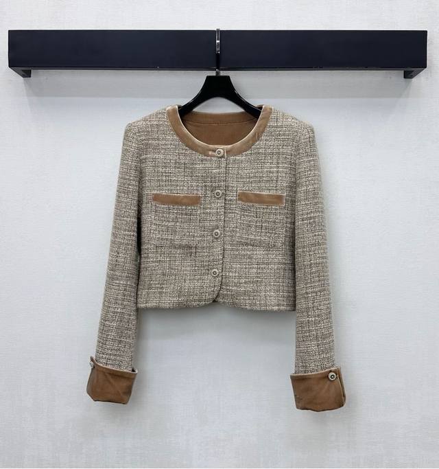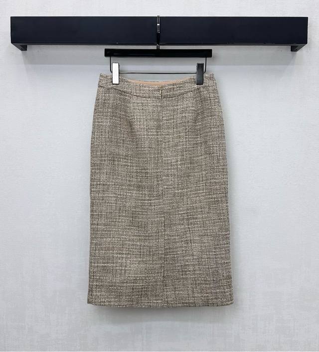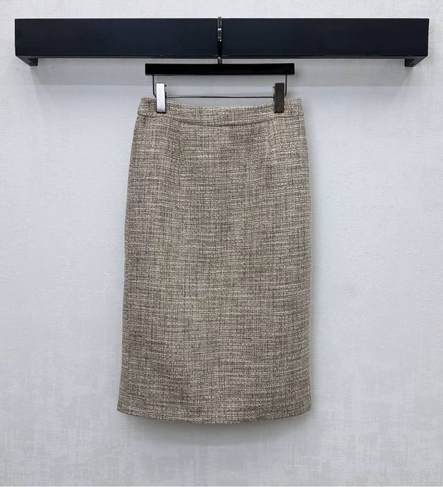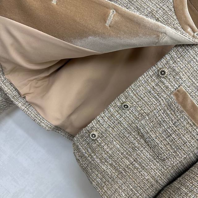 Chane*2025 New Arrival: Round Neck Dress Jacket and Skirt Set, Custom Made with Imported Coarse Textile Material. The collar, cuffs, and pocket edges feature corduroy trim for added style and depth. The heavy-duty pearl button detail on the front highlights the brand's signature style. The round neck dress jacket is paired with a matching straight skirt for a chic and sophisticated look, perfect for commuting or dates. High-quality versions available in sizes 36, 38, 40, and 42.