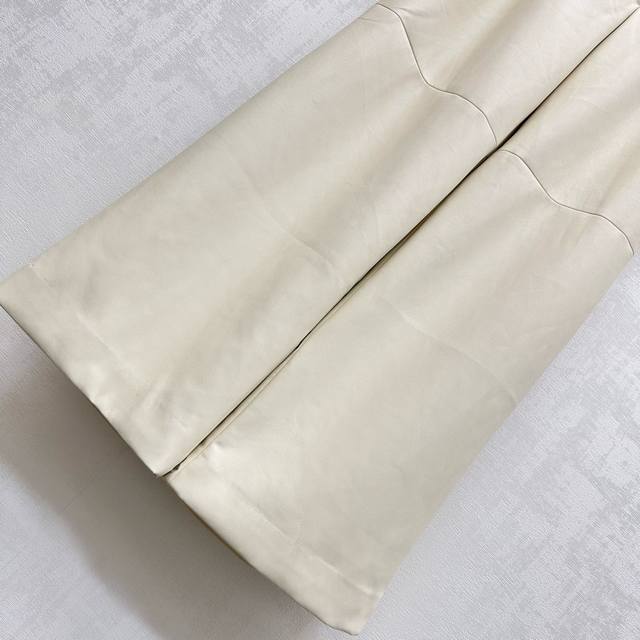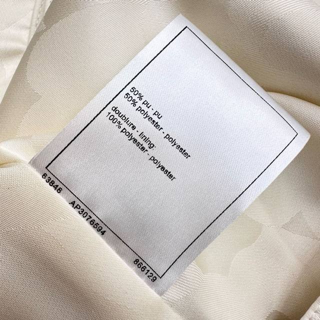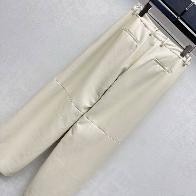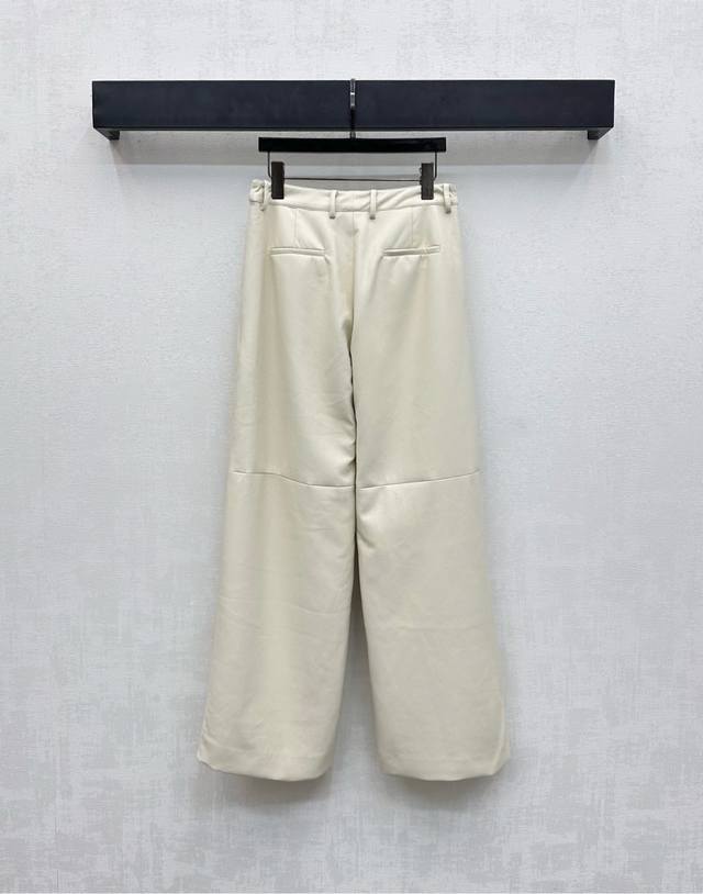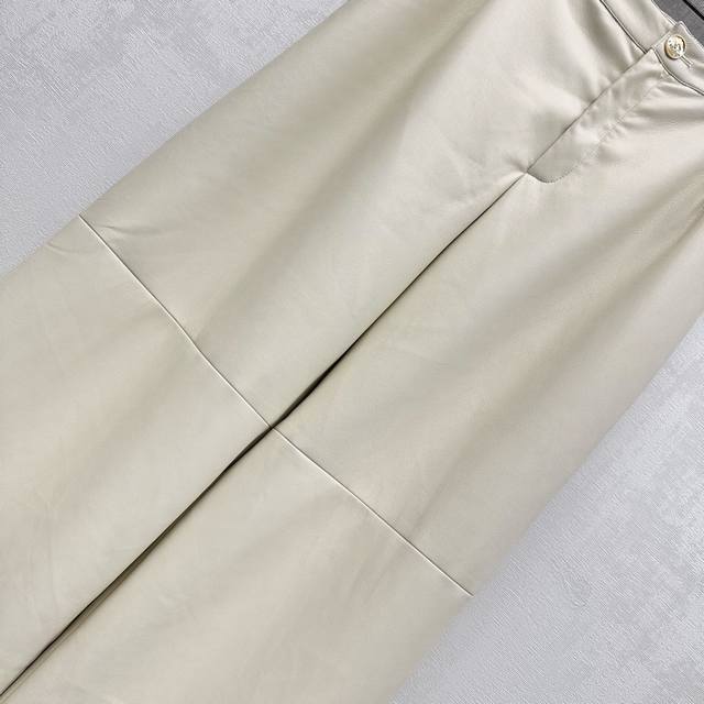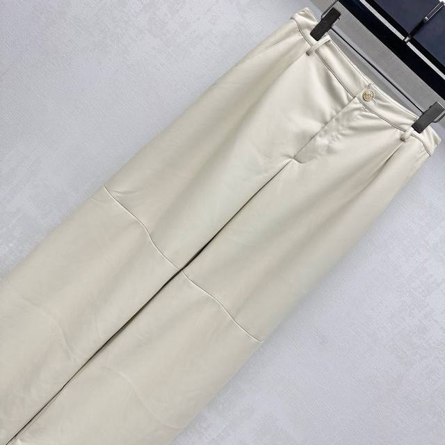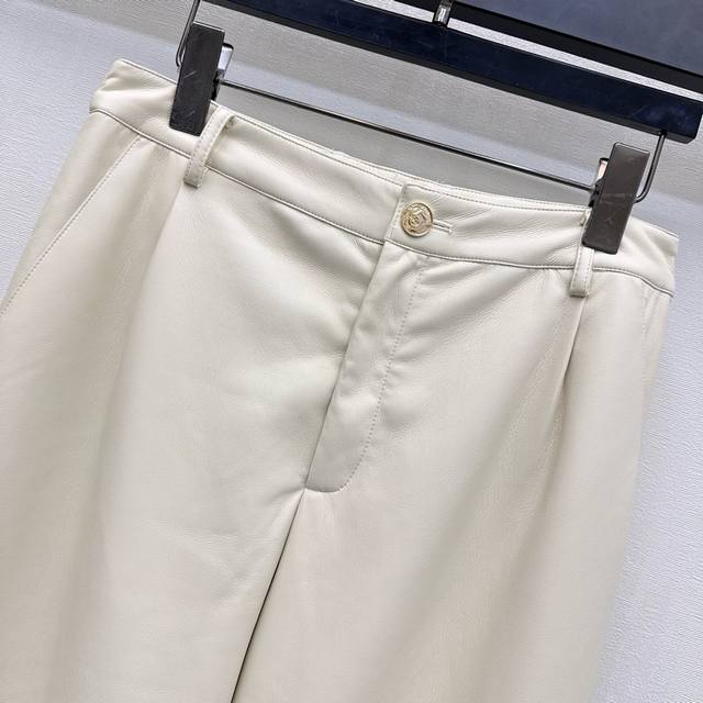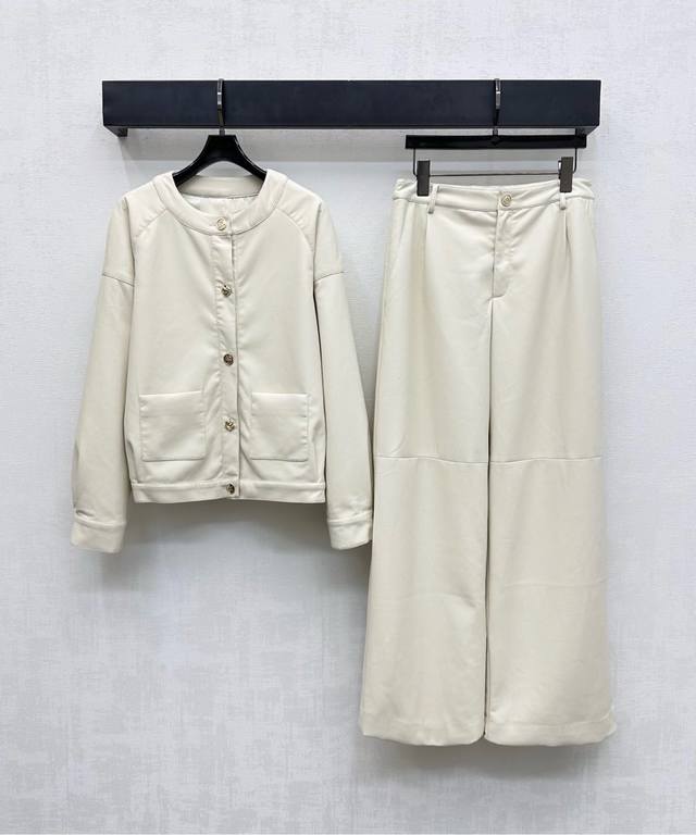Chane*2025 New Arrival. Round-neck leather jacket, custom-made from imported YB leather. Smooth, sheen. Knee splits, symmetrical pockets on the hips add layered styling. Double C engraved at waistband. Adjustable buttons highlight the brand's signature fabrics. High-waisted, wide-leg trousers. Pair with the same jacket for a complete outfit. Premium