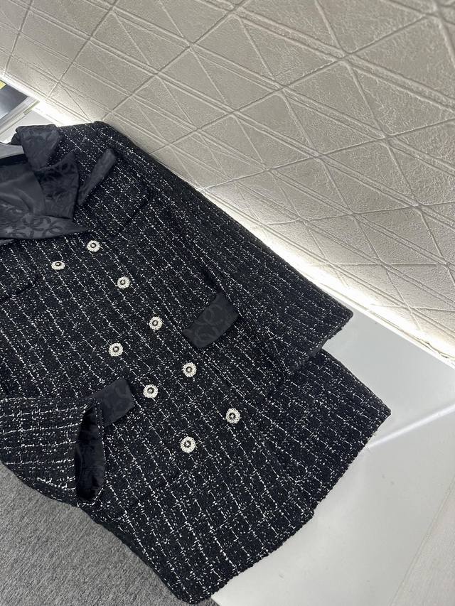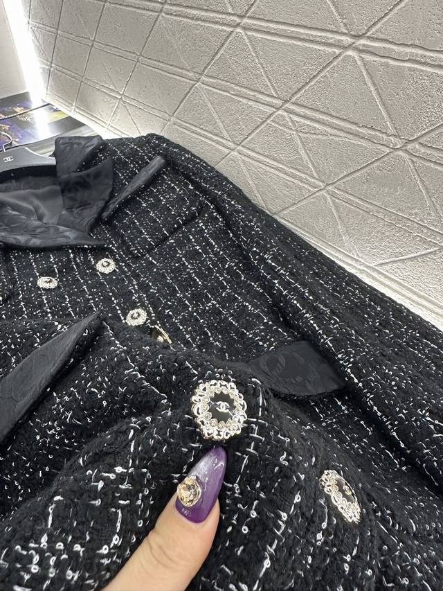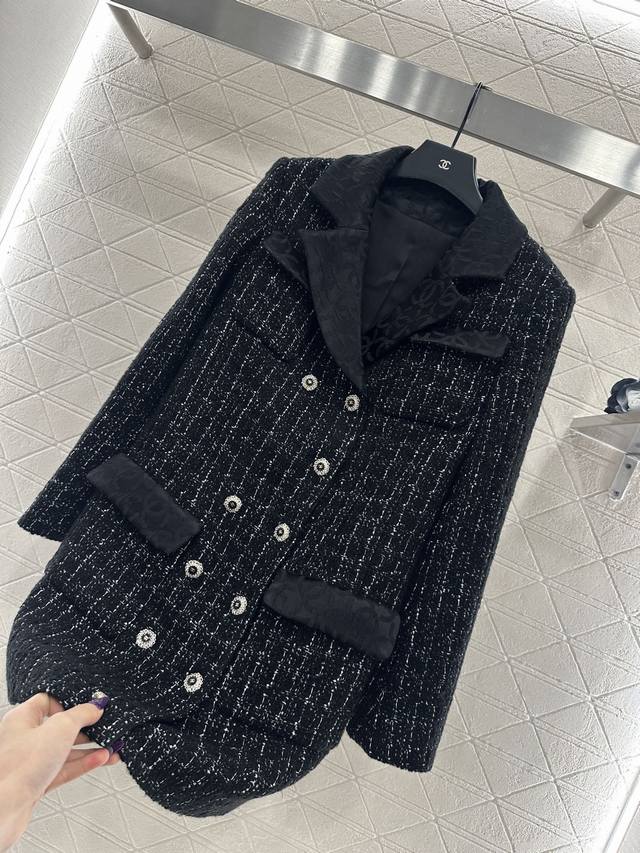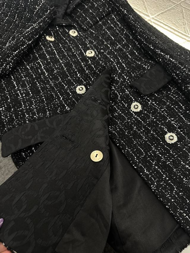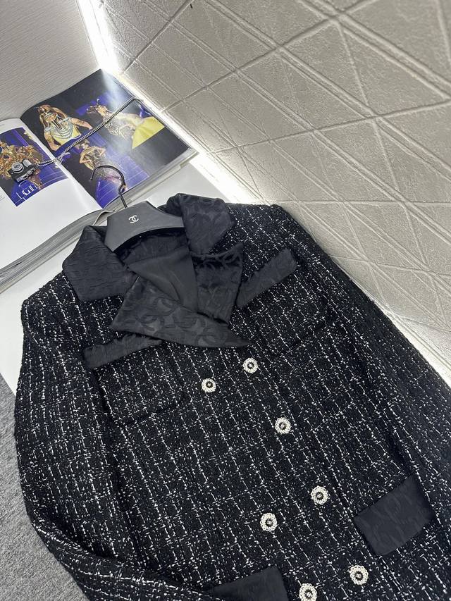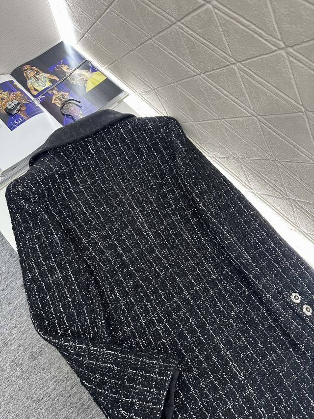 Chane*2025 New Arrival DDD Tweed Collared Dress Coat DDD Custom Yb Imported coarse cashmere wool material, with a distinct texture and superior quality. The tweed fabric creates a classic Chanel-inspired look. This mid-length dress coat with a lapel collar features a straight cut for greater versatility. The overall black and white interweaving design is elegant without being dull. The woven elements are luxurious and charming, complemented by silk double-C jacquard trim on the collar and pocket edges. The rhinestone letter double-breasted buttons echo the design, showcasing a high-class, sophisticated style. A top choice for autumn and winter transitional wear. Premium version with jacquard silk lining. Custom fabric and accessories. High-quality version 36 38 40. DDD