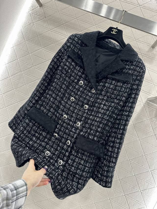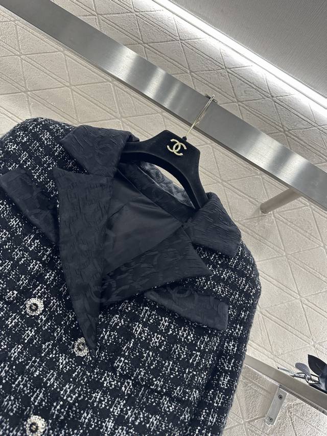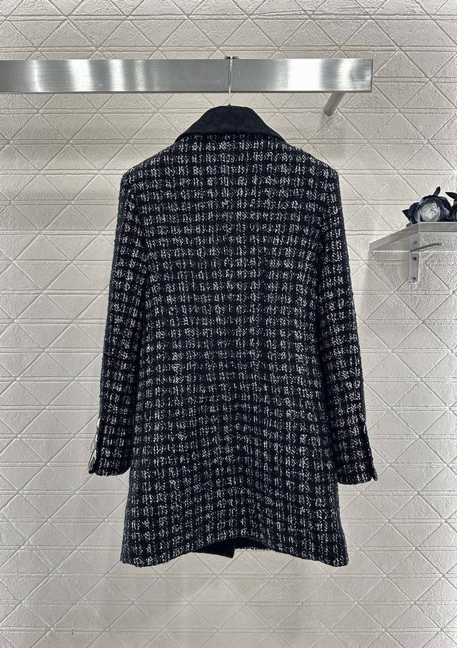 Chane*2025 New Arrival DDD Tweed Collared Dress Coat DDD Custom Yb Imported coarse cashmere wool fabric, with a distinct texture and superior quality. The tweed fabric creates a classic Chanel-inspired look. This mid-length dress coat with a lapel collar features a straight cut for greater versatility. The overall black and white interweaving design is elegant without being dull. The woven elements in the garment are luxurious and charming, complemented by silk double-C jacquard trim on the collar and pocket edges. The rhinestone letter double-breasted buttons echo the design, showcasing a high-class, sophisticated style. A top choice for autumn and winter transitional wear. Custom fabrics and accessories, please look for the high-quality version 36 38 40 DDD