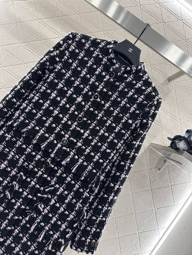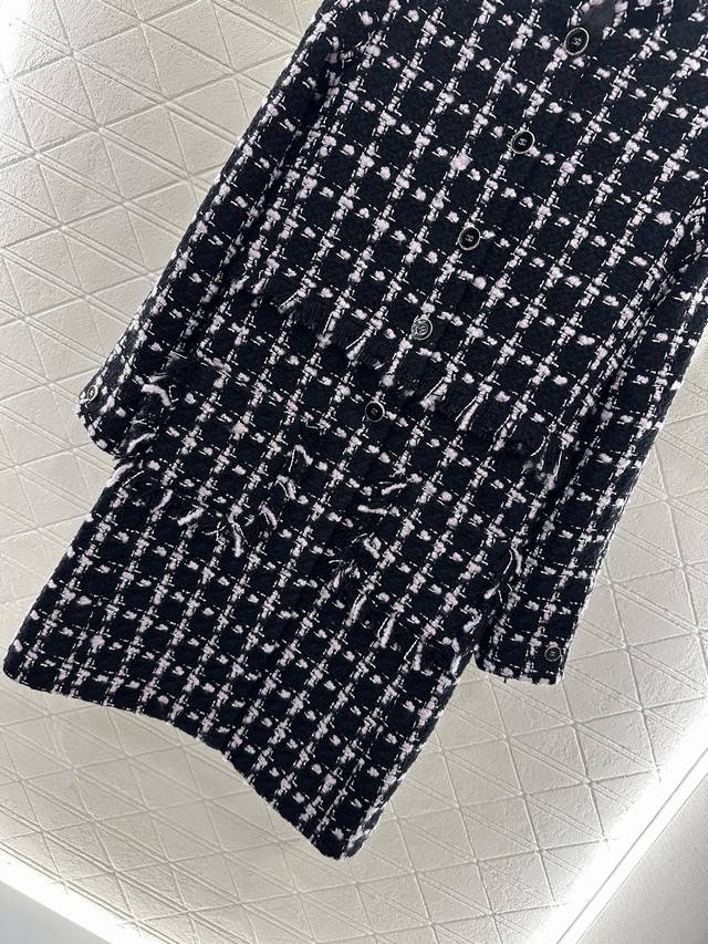 Braided Dress with Hemmed Long Coat Dress. Custom-made from imported Yb wool tweed, the texture is noticeable, and the premium, coarse, floral, and striped tweed creates a sophisticated, ladylike look. The midi-length design can be worn as a coat or dress. The front features a single row of printed buttons, intricately woven in pink and black. The hem features a luxurious, elegant slit at the back. Fur fringe trims at the waist and pockets create an elegant, layered design. This is the perfect choice for a stylish and sophisticated look. Custom-made fabrics and accessories are recommended, and look for the high-end versions (36, 38, 40).