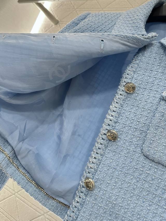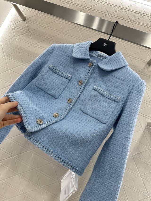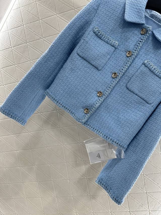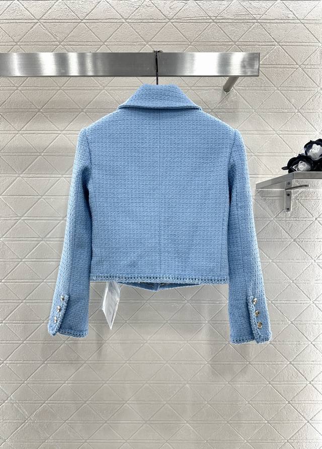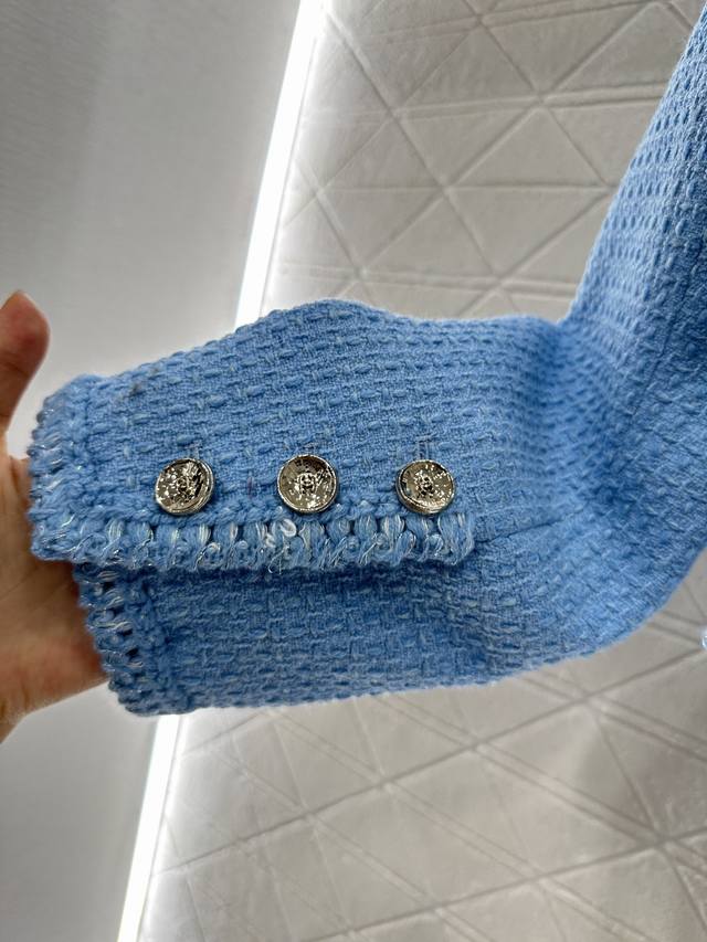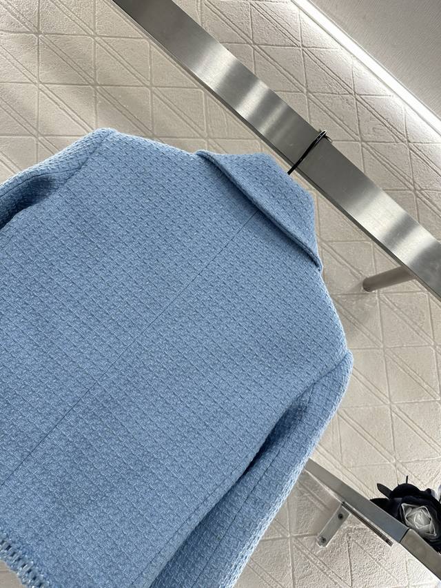 Braided Hem Dress Jacket. Made from imported YB wool, this jacket features a heavy check weave throughout, paired with a Klein blue base for a premium look. A single row of heavily engraved round buttons evokes a symmetrical, flap-over cufflinks, creating a lively yet elegant look that highlights the brand's refined aesthetic. The rich, layered design creates a stylish, modern look that flatters the skin. This is the top-tier version, featuring a silk jacquard lining and custom-made fabrics. Look for the high-end versions (36, 38, 40).
