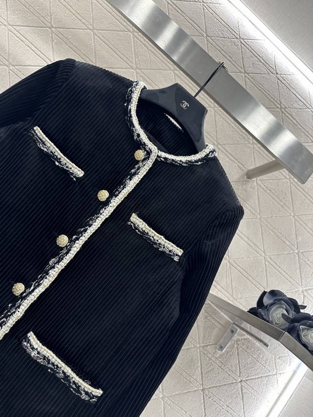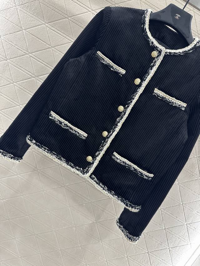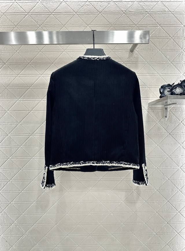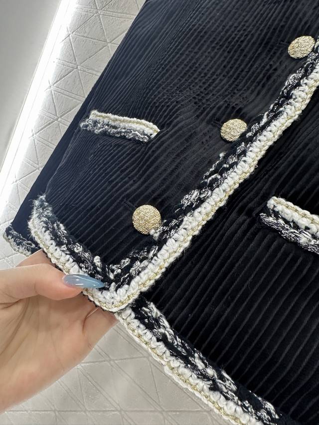 Custom Yb imported corduroy material, with a distinct texture and premium quality. The round neck and straight shoulders jacket style, the corduroy fabric creates an atypical Chanel style. The all-over hem is embellished with woven black and white contrasting three-dimensional binding, outlining the design and highlighting the sense of luxury and elegance. The plaid round buttons shine with elegance and charm, and the jacquard lining highlights the elegant style of a lady. A jacket suitable for various occasions, fashionable and elegant. For customized fabrics and accessories, look for the high version 36, 38, 40.