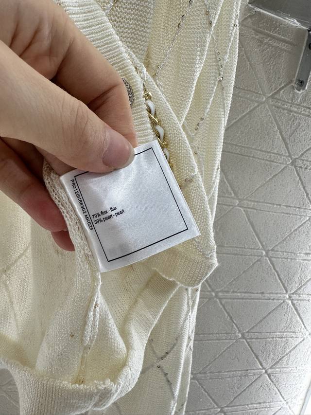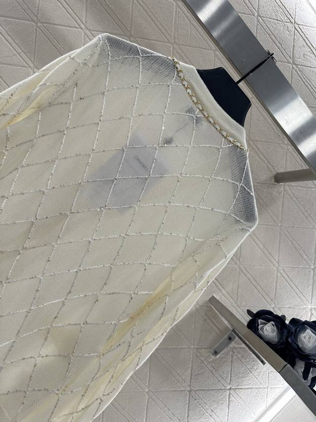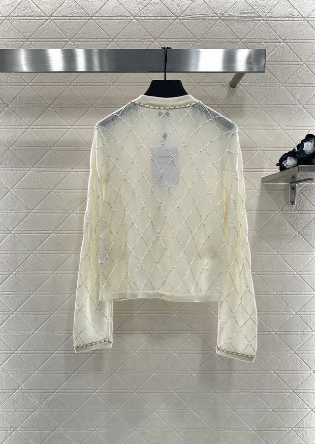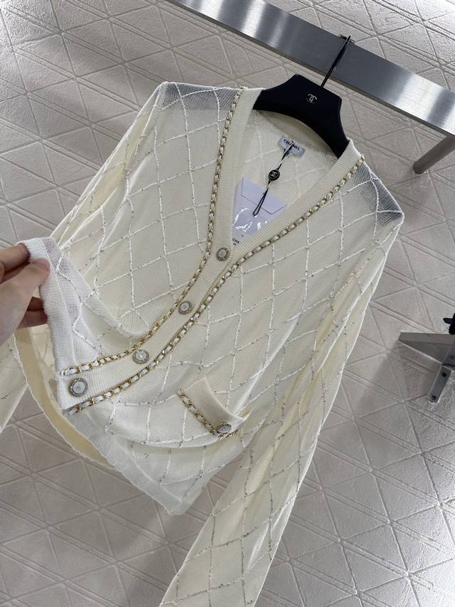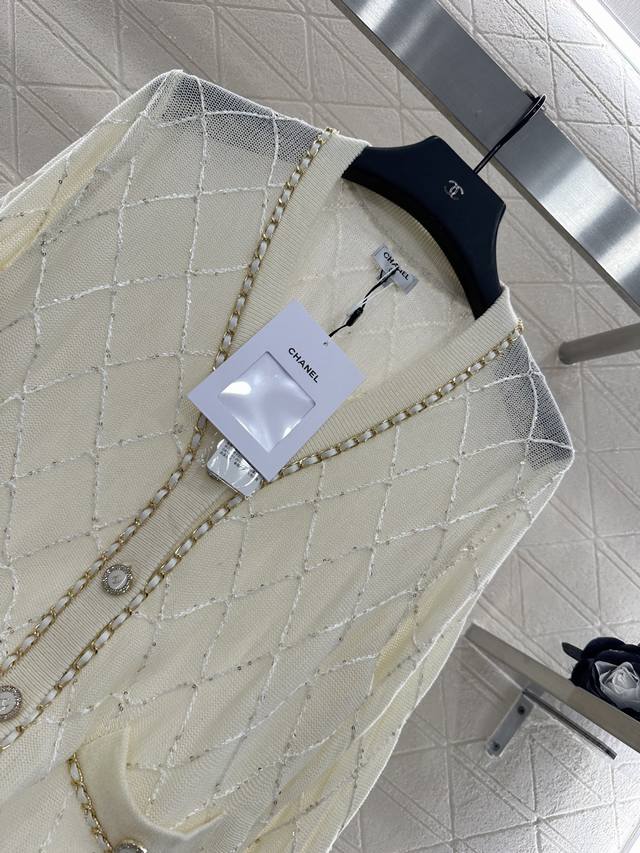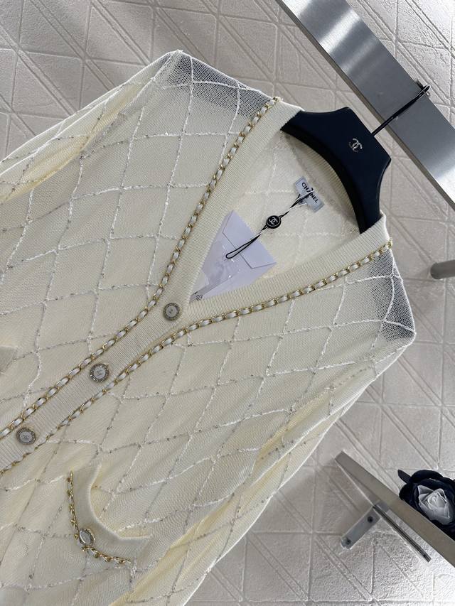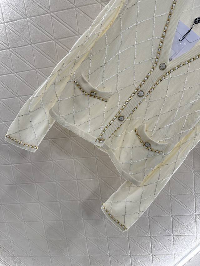 Heavy Chain Diamond-Quartz Knit Cardigan. Custom-made with imported Yb yarn for a premium look. Straight-shoulder knit cardigan cut for a slender, straight silhouette. Allover sequined silk thread creates a diamond-shaped pattern. The collar and cuffs extend to the front and hem, accented with a three-dimensional leather chain binding. Double-C-stamped buttons highlight the elegant, sophisticated look. Perfectly embodying the sensitivity and gentleness of a wealthy woman. Custom-made fabrics and accessories. Look for the high-quality version in two colors: 36, 38, 40.