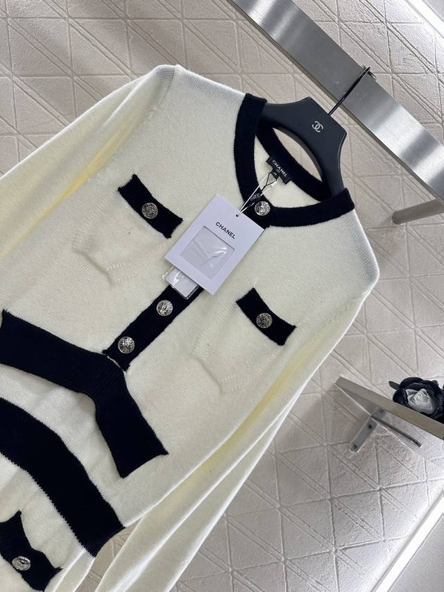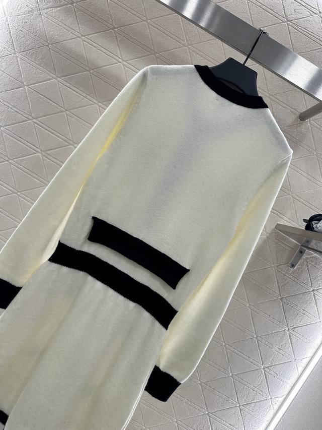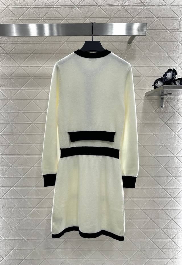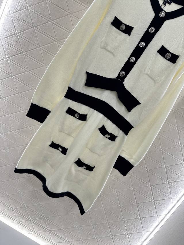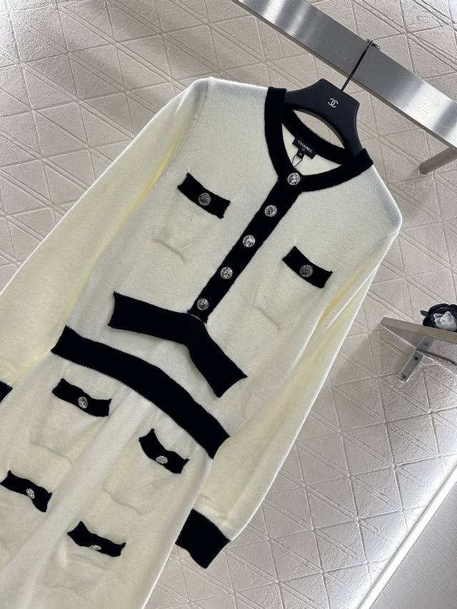 Knitted Long-Sleeved Dress. Custom-woven from Yb wool yarn, this comfortable, soft, and delicate knitted long-sleeved dress features symmetrical pockets for rich layering. The black and white silhouette on the top and bottom are offset with contrasting colors, echoing the brand's signature design. Both are embellished with Chanel's double-C printed buttons, highlighting the brand's signature design. This garment features a delicate, densely textured crocheted straight skirt with a hip-hugging, fitted silhouette and a loose, tight fit that accentuates proportions and showcases a refined, retro style. The top adds an elegant touch, a refined and stylish aesthetic, perfect for dating or commuting. Custom-made fabrics and accessories are available in two colors: 36, 38, and 40.
