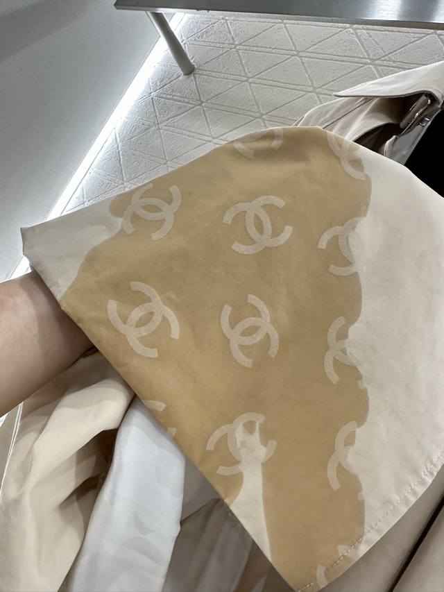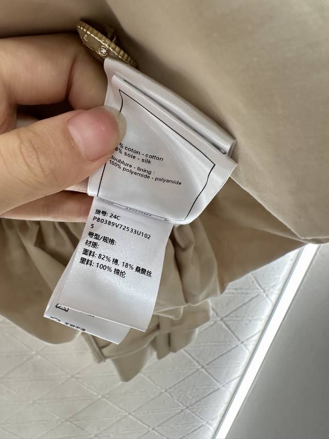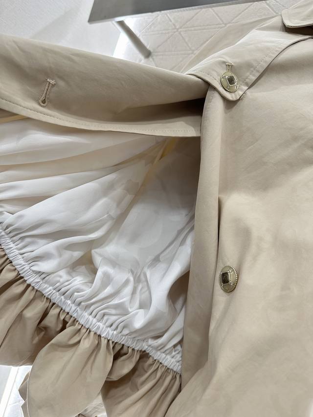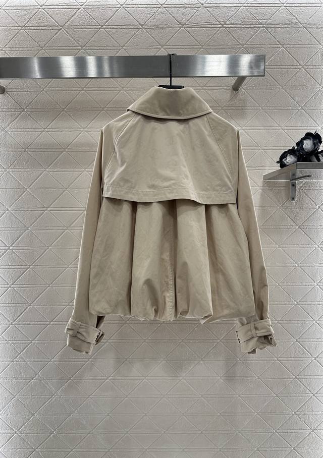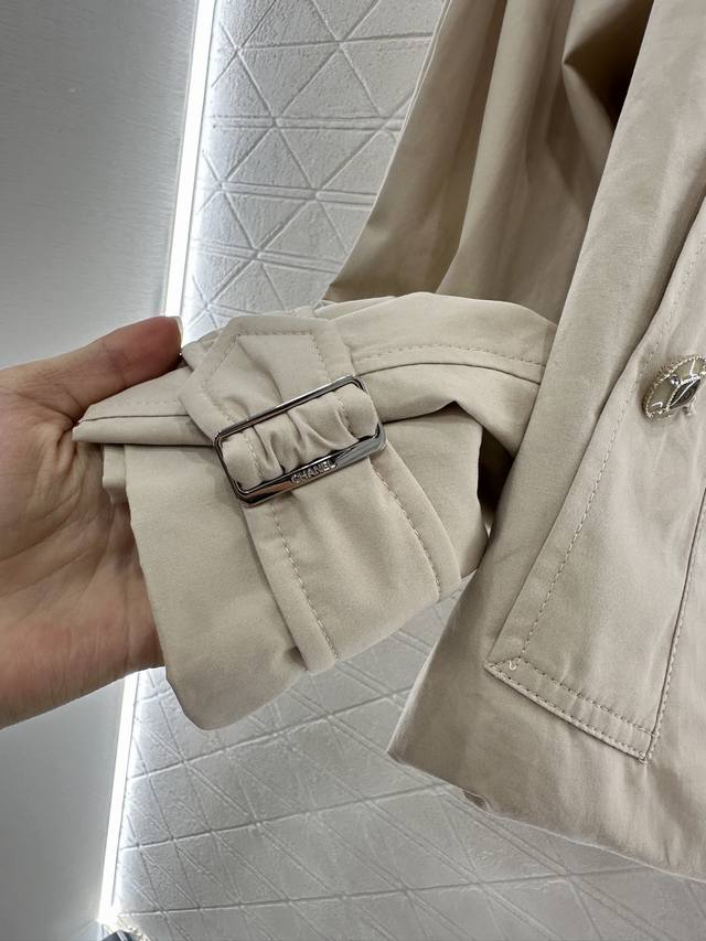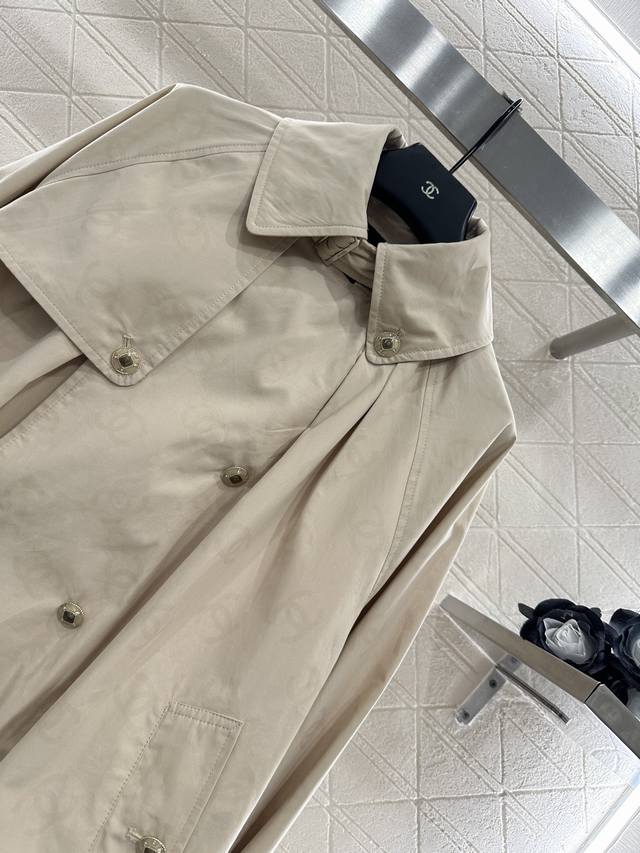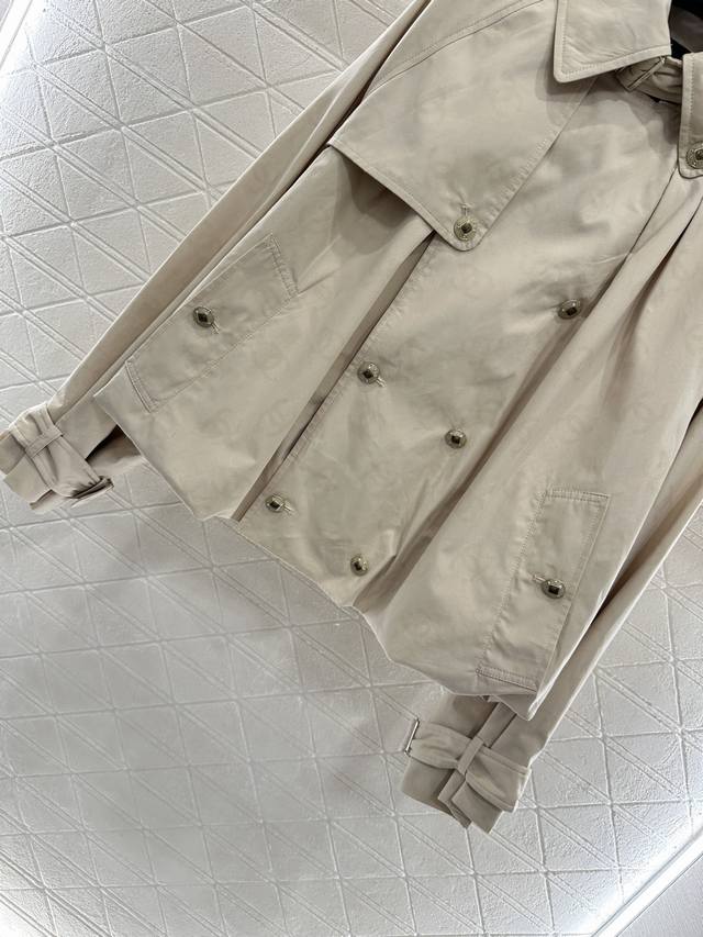 Short Trench Coat. Made from imported Yb jacquard silk cotton, this short trench coat features a slightly stretchy, comfortable, windproof, and lustrous design. The jacket maintains a loose, dropped shoulder design with slightly winged sleeves and a single cape for versatile wear, creating a deconstructed style. The design is both unique and stylish. The double-breasted buttoned front and the cuffs, with matching buckle detailing, offer a striking design. The silhouette is slimming and accommodating, making it stylish and comfortable for everyday wear. It's suitable for various occasions and is a Yb-developed jacquard pattern with a more pronounced double C when exposed to water. See the custom fabric and accessories pictured. Look for the higher-end versions (36, 38, 40).