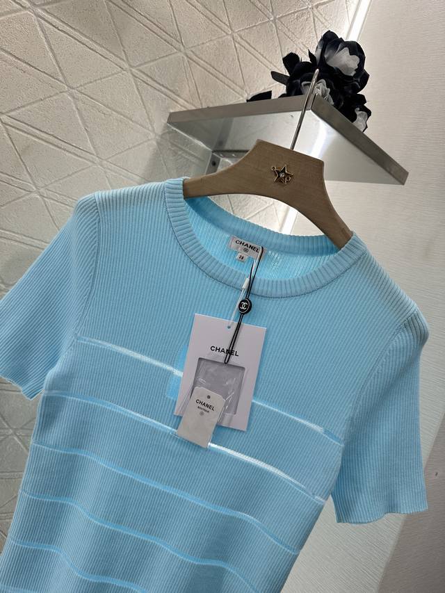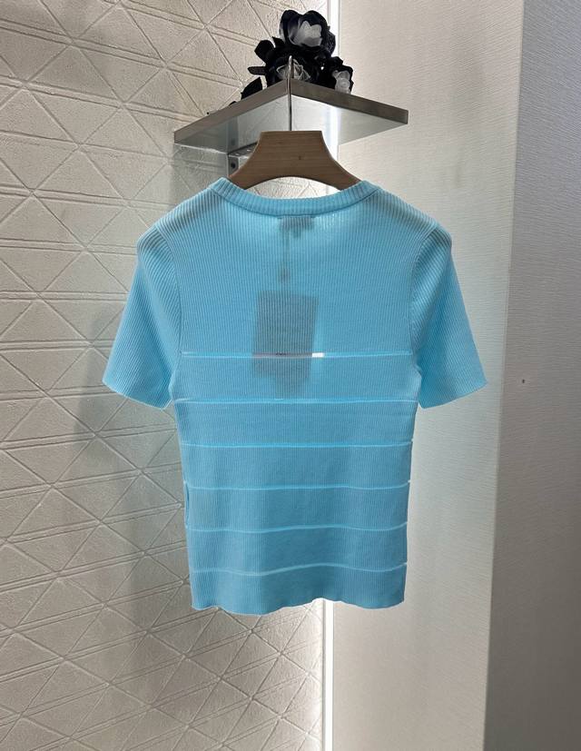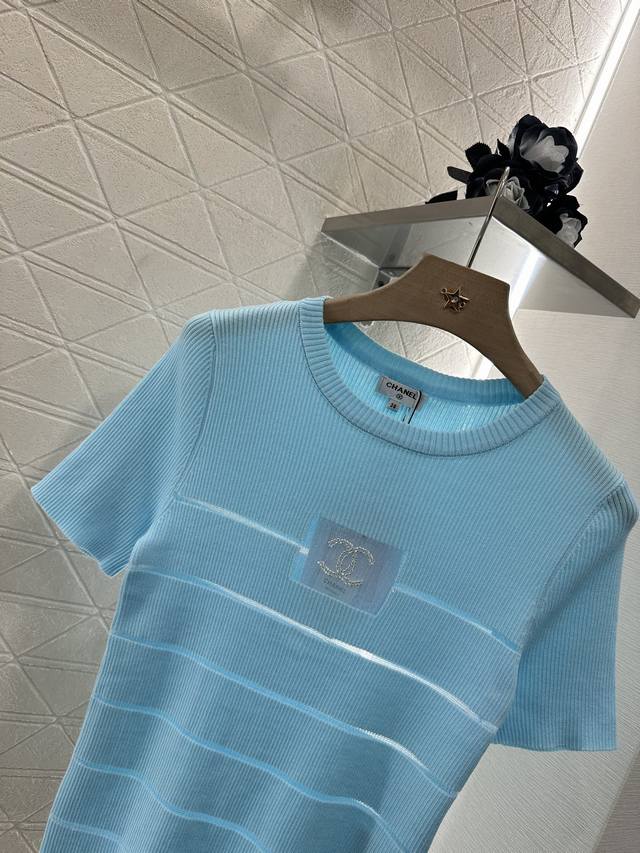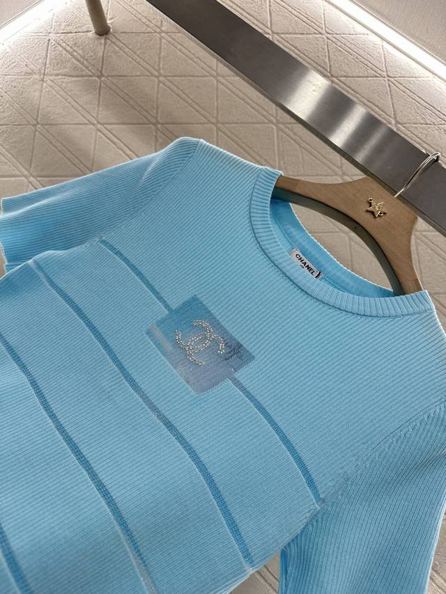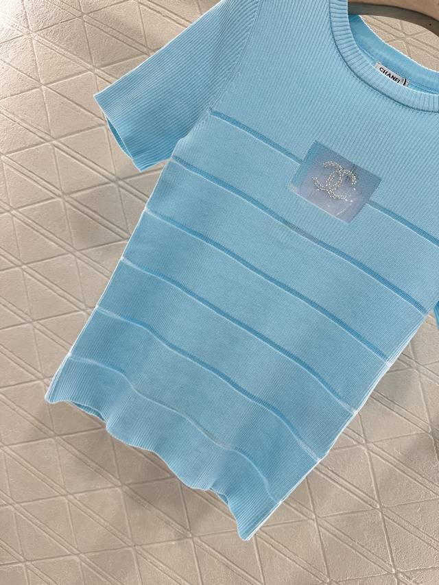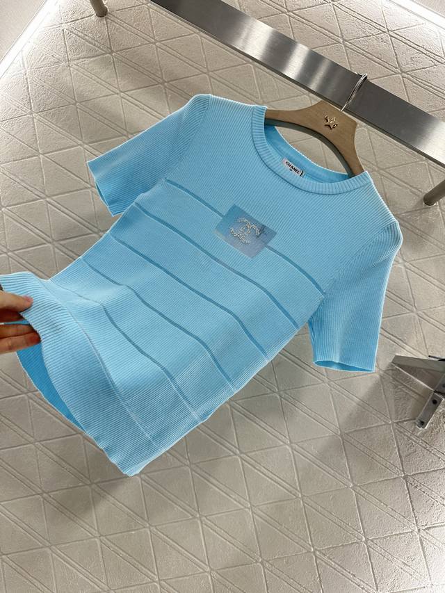 Customized Yb imported yarn woven elasticity comfortable breathable easy to wear knitted short sleeves tailored to beautify the head-shoulder ratio and make you look thinner. The chest see-through frame has beads and double C logo decoration. Retro style. Strong slim fit highlights the figure. The stripes below the chest are hollowed out and the style is light and age-reducing. The first choice for daily wear is age-reducing and fashionable. Customized surface and accessories are recognized for the high version. 3 colors 36 38 40.