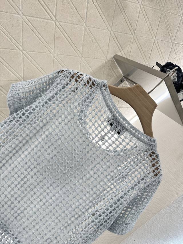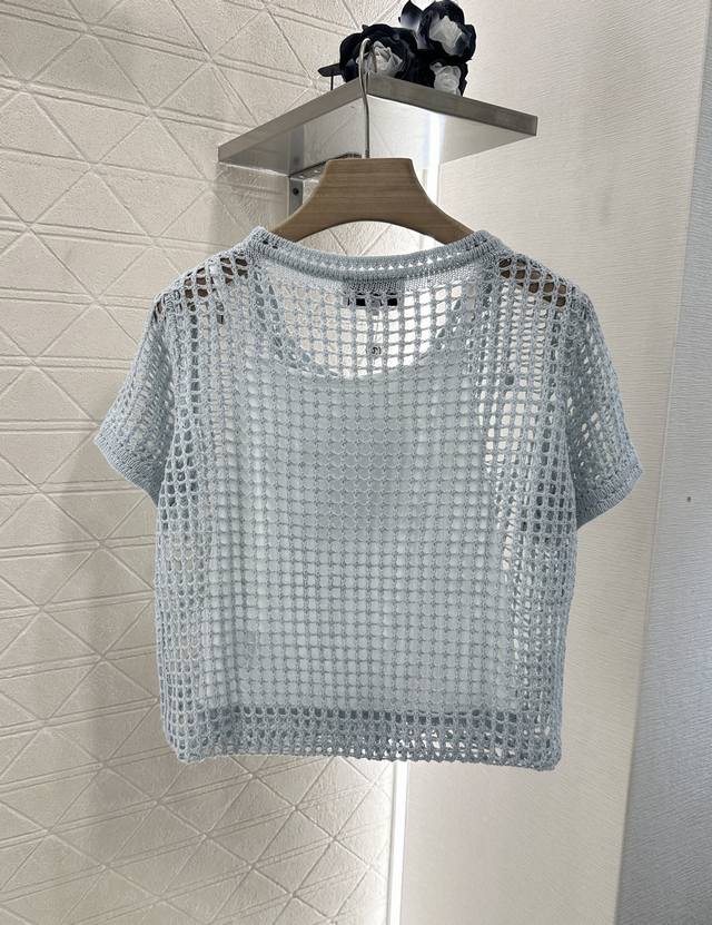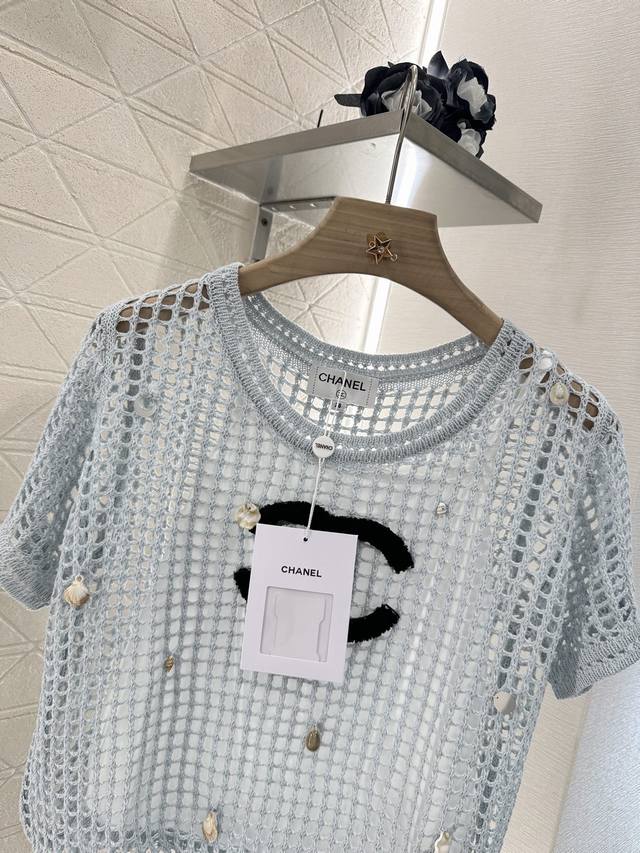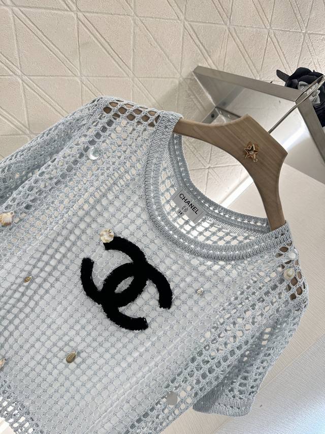 Customized Yb wool yarn Original cotton woven texture High-end and comfortable Two-piece set Short sleeves Tailored inner layer with the same color suspenders and outer layer with hollow mesh round neck short sleeves Presenting a layered effect Fashionable and individual The iconic double C logo pattern on the chest highlights the brand personality Highlights the high-end sense of wear The looming texture makes the simple style wear out personality The irregularly distributed sequins refract light and make it more refined The wear shows a relaxed tone The first choice for fashion wear in all seasons Customized fabrics and accessories Look for the high version 2 colors 36 38 40 "