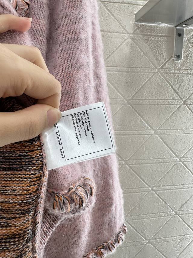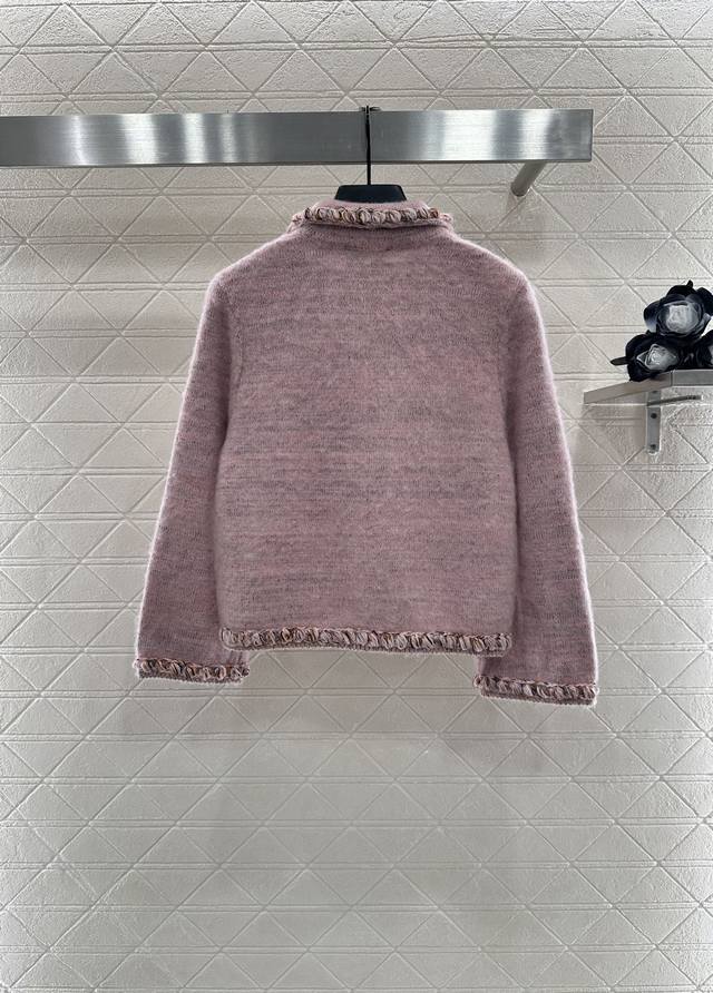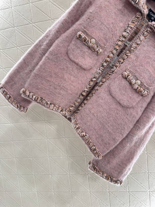 Woven-Hemmed Cardigan. Custom-made from Yb cashmere and wool yarn, this comfortable, soft, and delicate cardigan features a lapel collar. The collar extends to the front placket, and the contrasting woven hem matches the pocket tops and cuffs for a harmonious, unified look. The double-C printed rhinestone buckle highlights the brand's signature design. The delicate, dense texture of the garment, crocheted, adds an elegant touch, and the details echo the refined, modern aesthetic, showcasing a refined, modern feel. Perfect for dating or commuting, this custom-made cardigan features custom fabrics and trims. Includes a delicate lace-up dust bag. Look for the high-end versions (36, 38, 40).