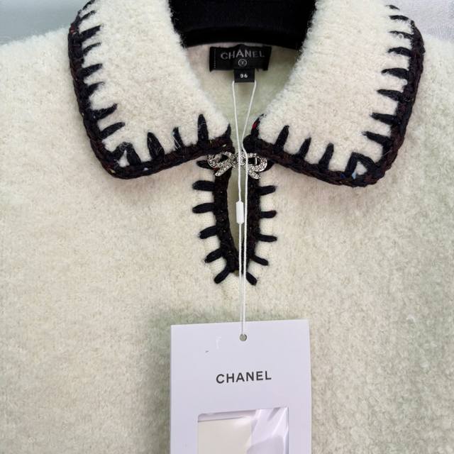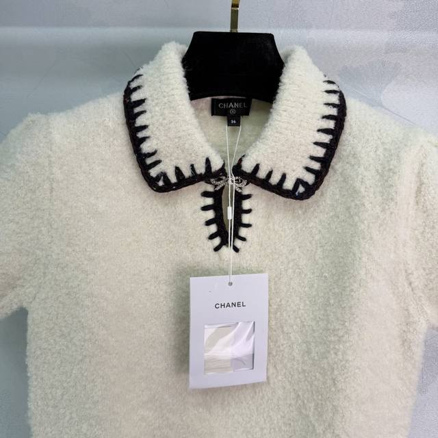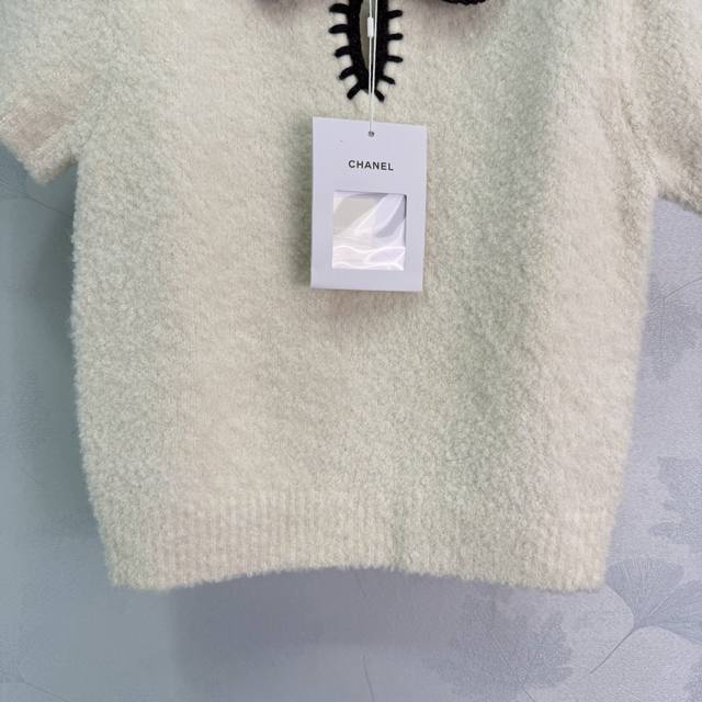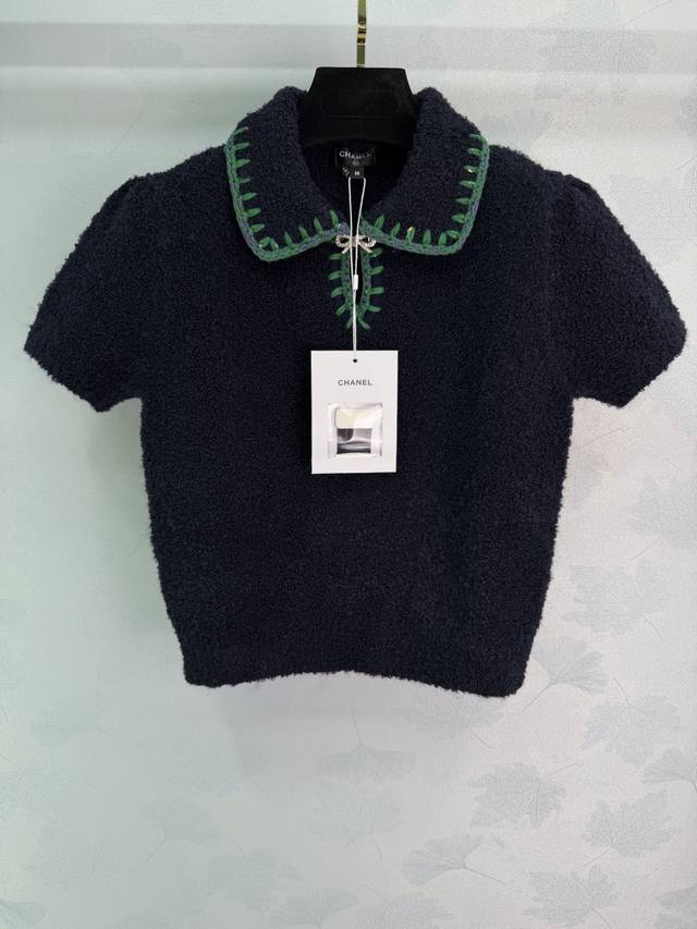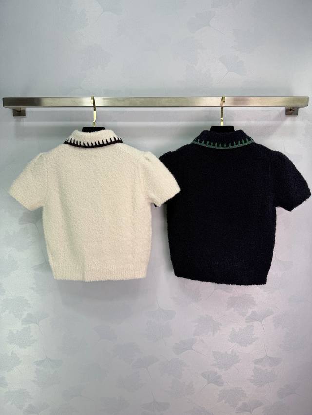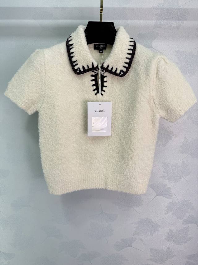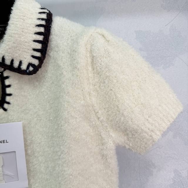 Chane*2026 Early Spring New Collared Color-Blocked Knit Short-Sleeve Sleeve 25Coco Skiing Series # Custom Yb cashmere yarn, high-quality texture, comfortable and soft. Features a collared knit short-sleeve cut, contrasting color stitching at the collar, a half-open placket design, and a rhinestone bow connecting the two ends. The entire sleeve has a fine crochet texture with a rich, grainy feel. Available in blue and white, stylish and versatile. Elastic edging easily highlights the perfect details and texture, exquisite and stylish, perfect for a fashionable and chic look! 2 colors, 3 sizes: Sml T226B. DDD
