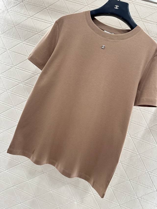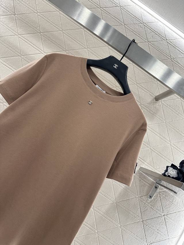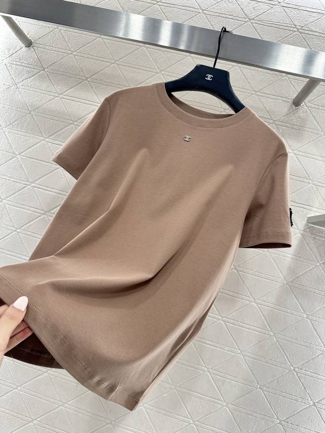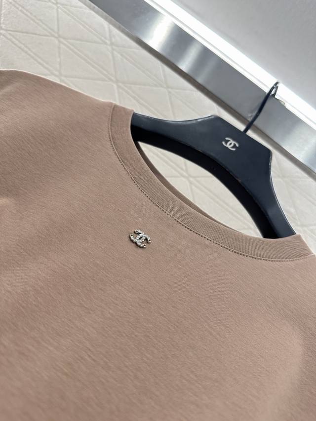 Chane*2026 New Arrival Ddd Crew Neck Beaded Logo Ddd Custom Yb Mercerized Cotton Material, Delicate Texture, Comfortable and Breathable, Regular Short Sleeve T-Shirt Cut, Beading Technique Recreates the 3D Double C Logo Pattern on the Outer Cuff of One Arm, Light Reflection Exudes Luxury, Echoing the Rhinestone Double C on the Neckline, Highlighting Brand Style, Regular Fit, Slimming and Stylish. Custom Fabrics and Accessories, High-Version, White, Black, Khaki, 3 Colors, Sizes 36, 38, 40 DDD