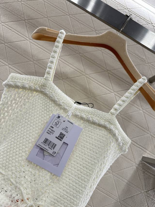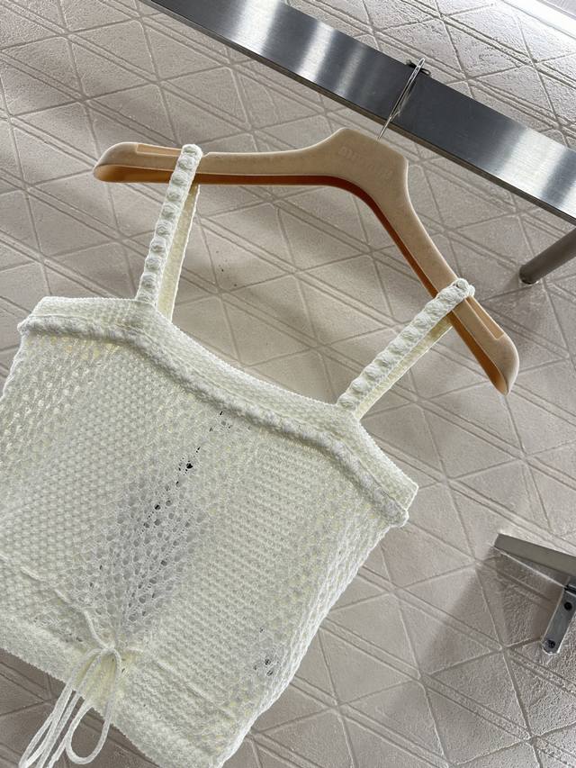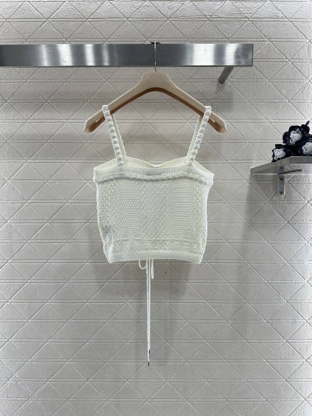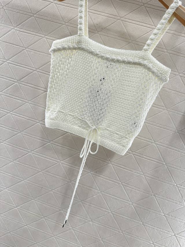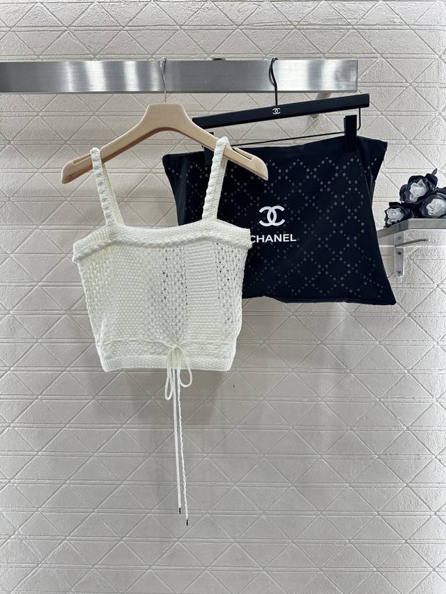 Chane*2026 New Arrival: Ddd Hollow-out Drawstring Knit Camisole. Made with custom Yb cotton yarn, this camisole offers a comfortable, soft, and stretchy feel. The flat neckline features 3D crochet trim that echoes the texture of the thin shoulder straps. The contrasting crochet textures on the body create a cool and stylish look. The drawstring hem allows for adjustable fit to accentuate a slim waist, and the rhinestones at the drawstring ends add a touch of glamour, showcasing the brand's style and giving this simple design a sexy and individualistic, luxurious feel. Comes with a delicate diamond-patterned dust bag. High-quality custom fabrics and accessories are available. Available in black and white. Sizes: 36, 38, 40. DDD