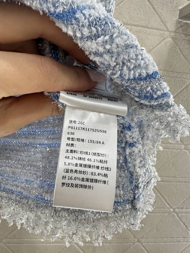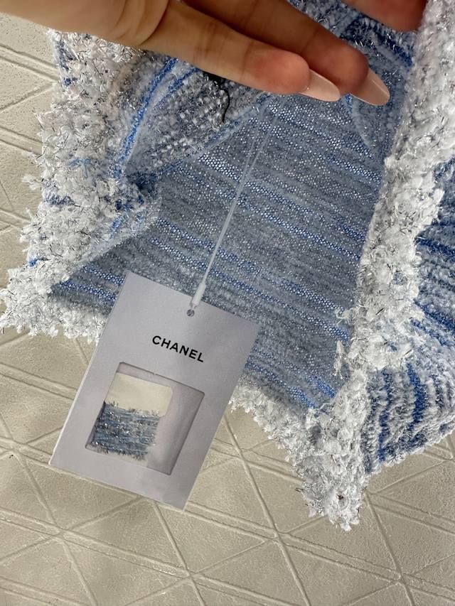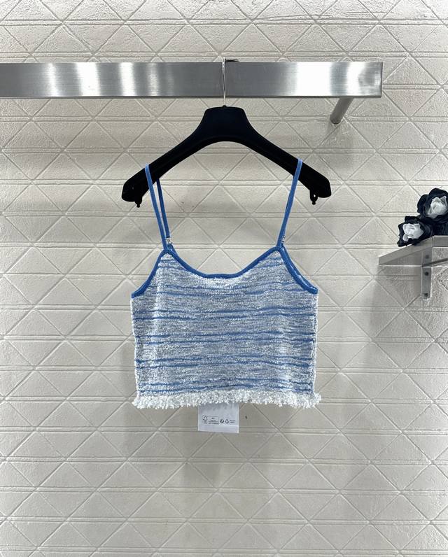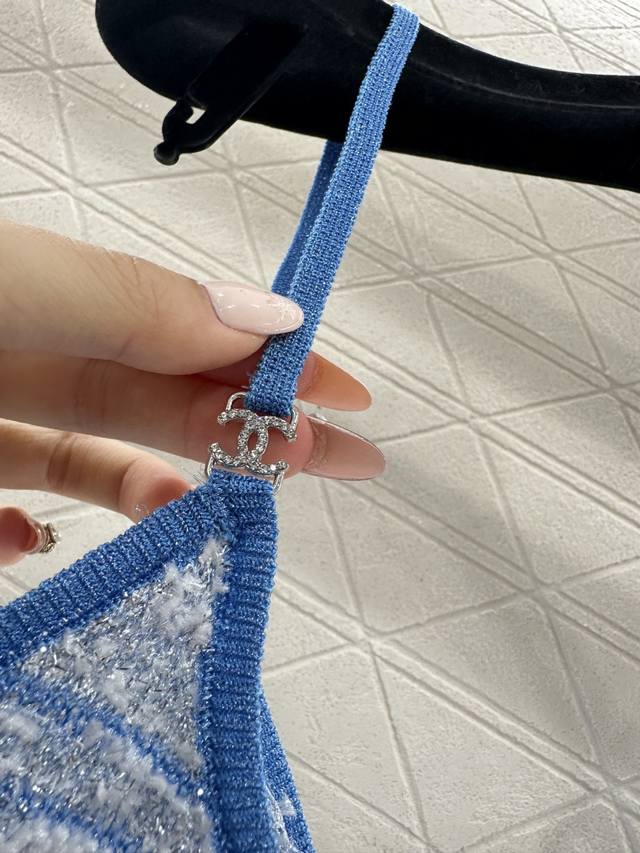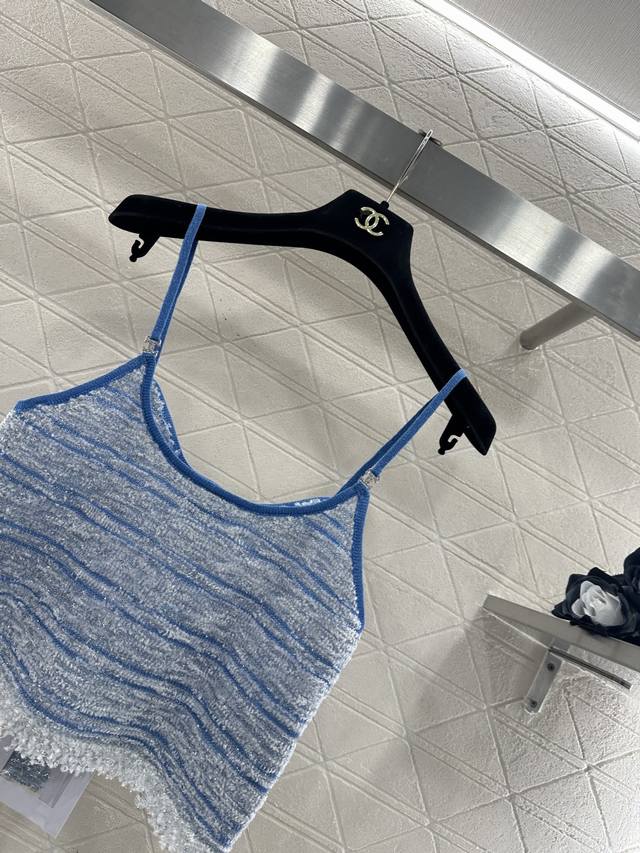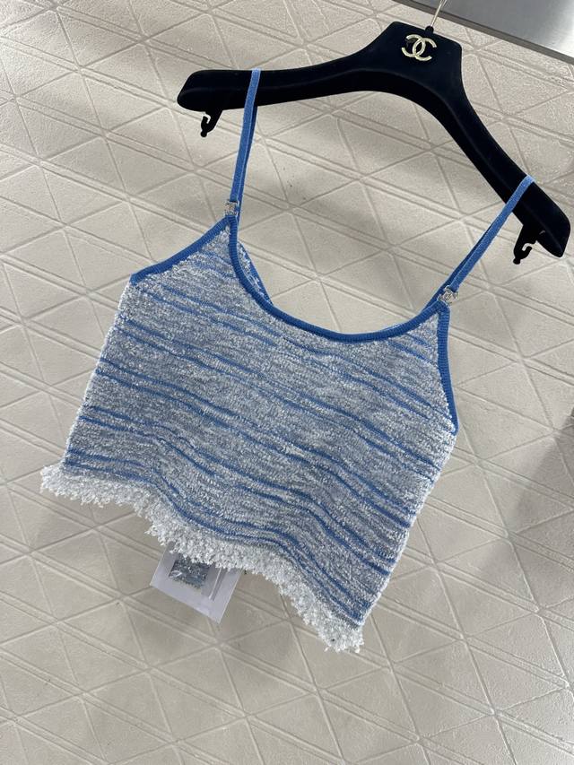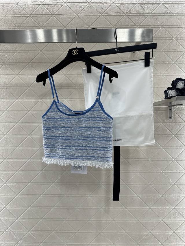 Chane*2026 New Arrival: Ddd Tassel Knit Camisole. Made with custom Yb cotton yarn, this high-quality camisole boasts a sophisticated and stylish look. The strapless neckline is adorned with double-C rhinestones, highlighting the brand's style. The hem is decorated with knitted tassels, adding a light and delicate touch. The body features a two-tone yarn weave, with a matching dark blue outlining the silhouette for a chic and sophisticated look that breaks away from monotony. Comes with a delicate drawstring dust bag. Custom fabric and accessories are available. High-quality blue, sizes 36, 38, and 40. DDD