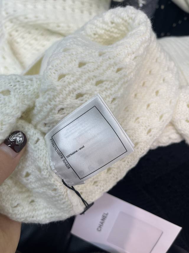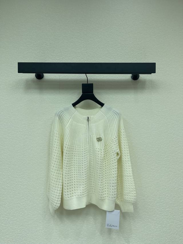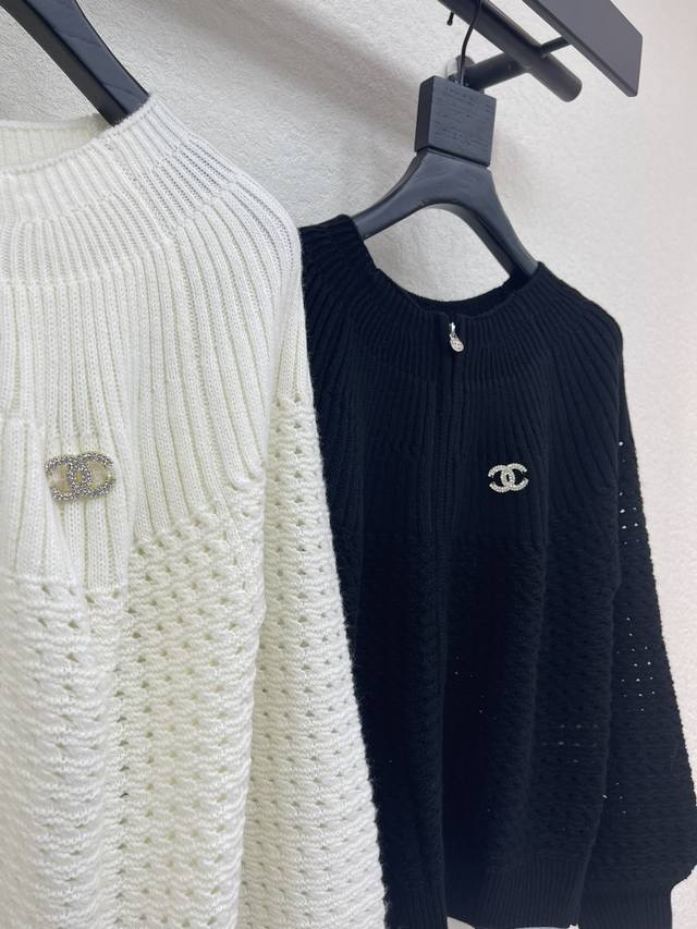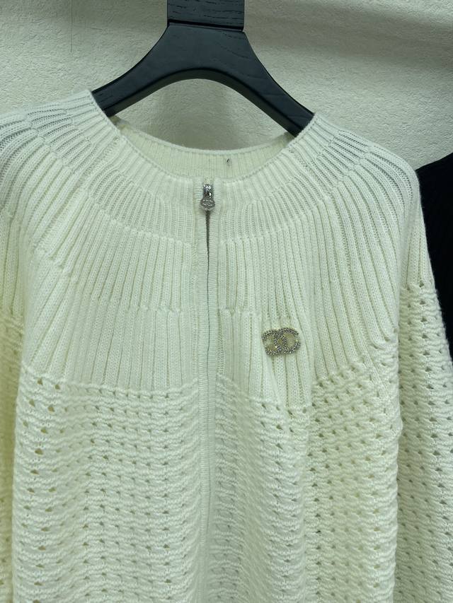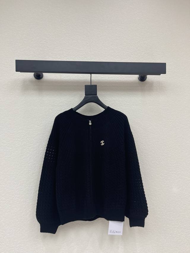 Chane*26 Early Spring New Solid Color Crew Neck Long Sleeve Knit Cardigan! Crafted from custom wool yarn, it offers a comfortable and stylish feel. The crew neck knit cardigan has a relaxed yet fashionable texture, featuring elastic ribbed trim throughout, vertically distributed crochet patterns, a glossy engraved logo on the front zipper, and double C letter hardware on the chest, showcasing the brand's charm. Versatile black, simple yet sophisticated! Sml Aa. DDD