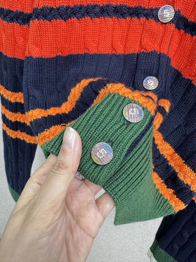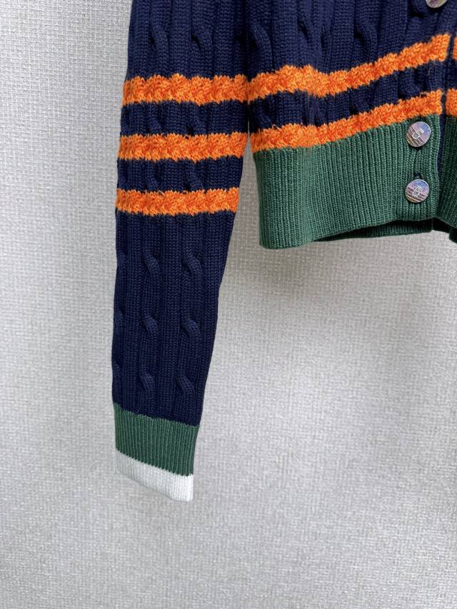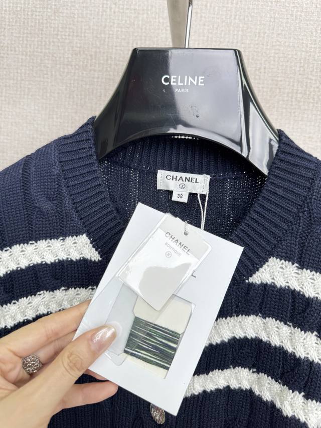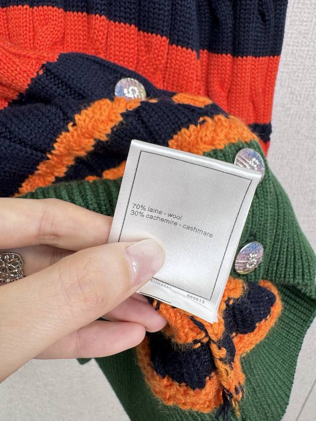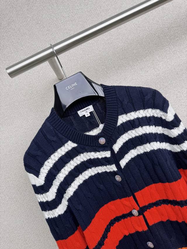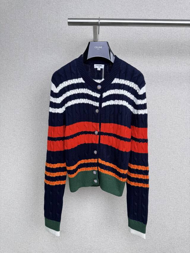 Chanel 2025 Autumn/Winter new round-neck striped knitted cardigan. My dears, today I must share with you a super cute and age-reducing colorful striped sweater cardigan. The bright colors are intertwined, the red is warm, the yellow is lively, and the blue is fresh. It is like wearing a rainbow on your body. Each stripe is a mark of youth. It is playful and cute, and instantly makes you look more than ten years younger. The soft material gives you a warm hug, like a caring little friend. Whether paired with a short skirt, showing a sweet and cute style, or with casual pants, showing a casual and comfortable style, it is super good-looking. Wearing this colorful striped sweater, you are an elf in a fairy tale, full of vitality and energy. Come and experience this cute and age-reducing charm together. Size Sml