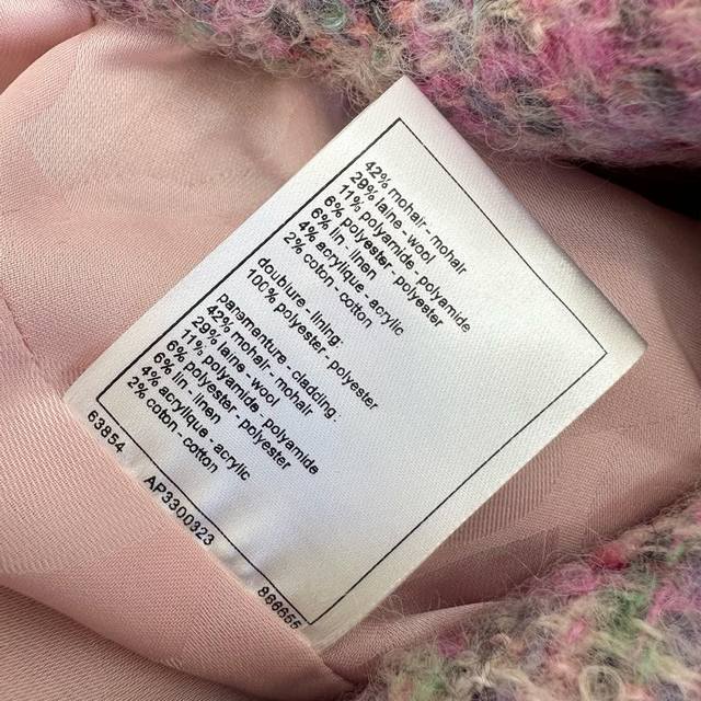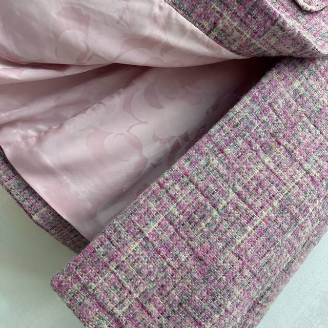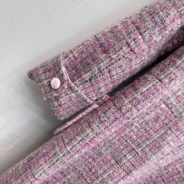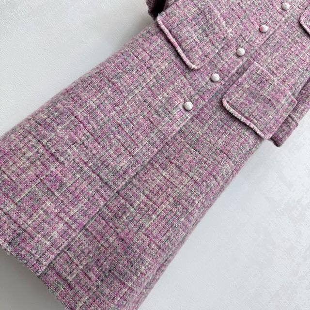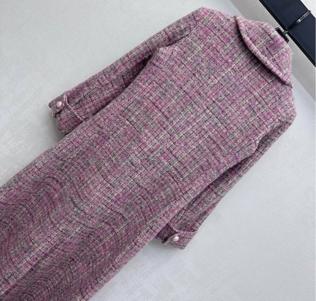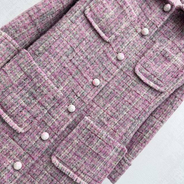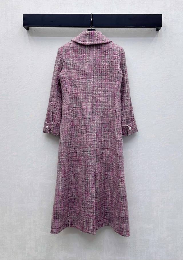 Chanel 2025 New Arrival: Checkered Tweed Dress Coat, Custom Made. Made with imported coarse wool fabric, featuring a delicate and distinct texture, this high-quality tweed coat embodies the classic Chanel style. The entire coat is woven with pink, white, and black threads, complemented by symmetrical pocket decorations that highlight the brand's character. The open front features a double C logo, round buttons, and an all-over subtle jacquard pattern. The lining echoes the brand's design. Features include a lapel, long coat cut, perfect for autumn and winter wear. High-quality version available in sizes 36, 38, and 40.