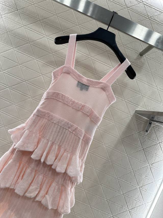 Custom Yb Imported Silk and Wool Yarn, Soft and Skin-Friendly, Comfortable and Stylish. The slip dress features a strapless, off-the-shoulder cut, subtly revealing skin to flatter the head and shoulders, creating a slimming effect. The dress features a multi-layered, horizontal cake skirt design from the chest down, adorned with elastic pleats, ruffled trim, and bow embellishments for added dimension. A three-dimensional rhinestone double C logo embellishment adorns the waist. The dress exudes a strong sense of elegance and princess style. The fitted silhouette accentuates the figure, creating a playful, youthful, and flattering look. A top choice for parties. Custom fabric and accessories come with an exquisite drawstring dust bag. High-quality version available in 2 colors, sizes 36, 38, and 40.