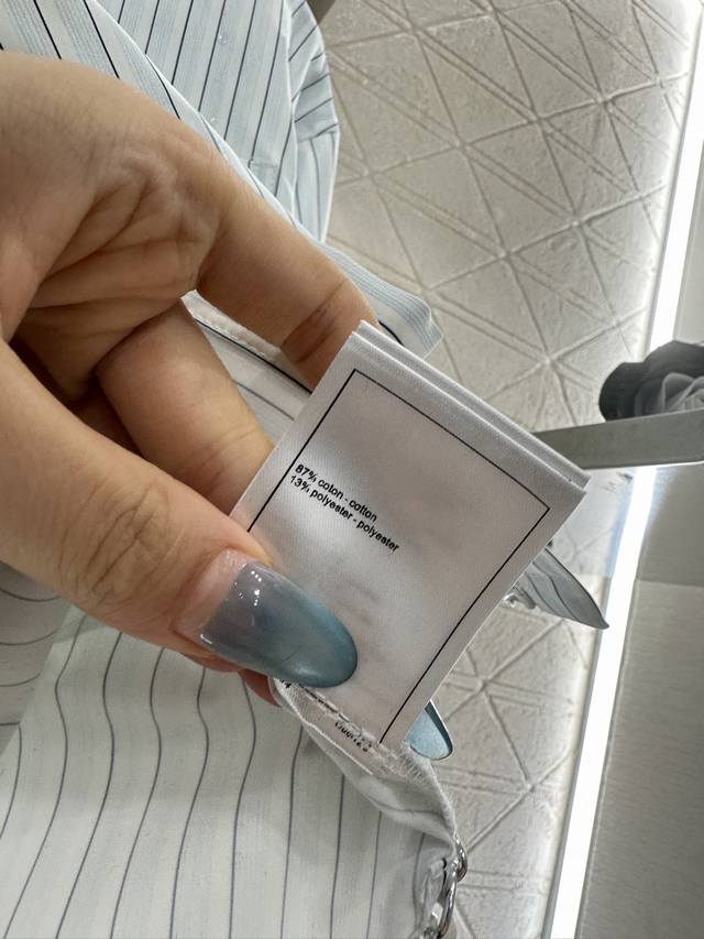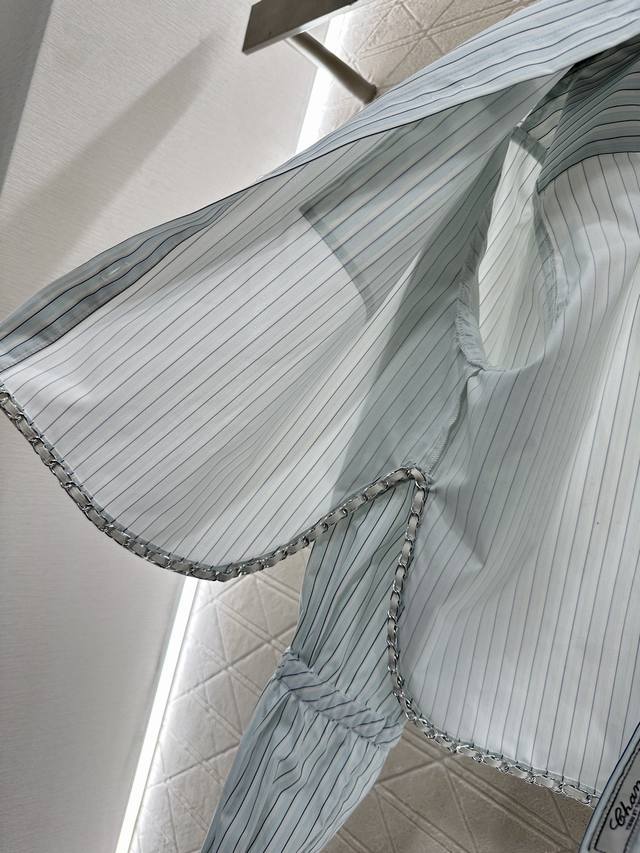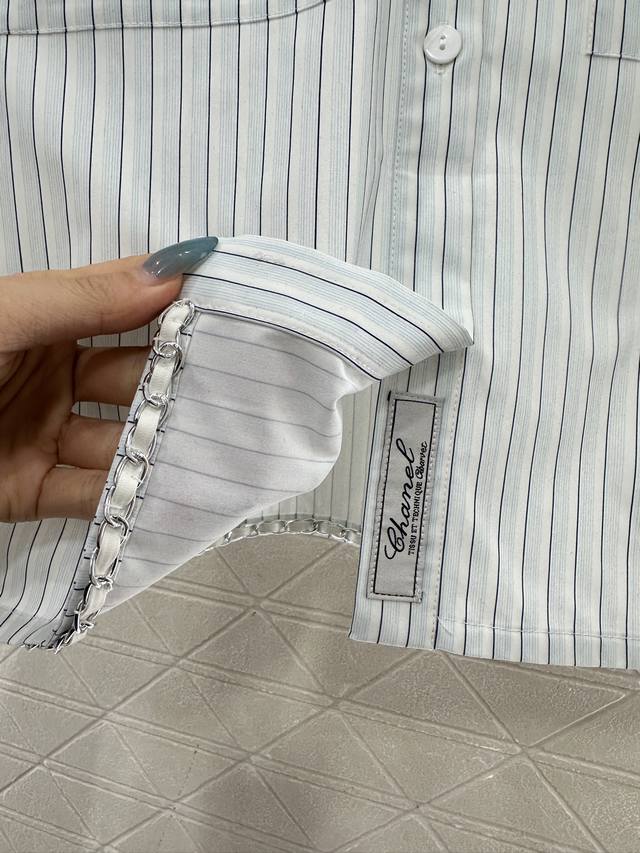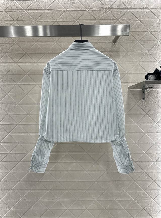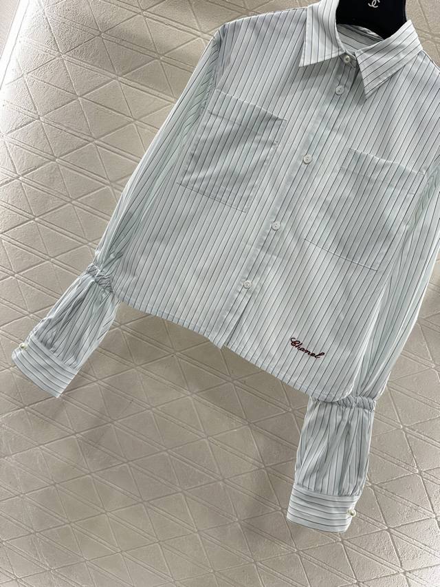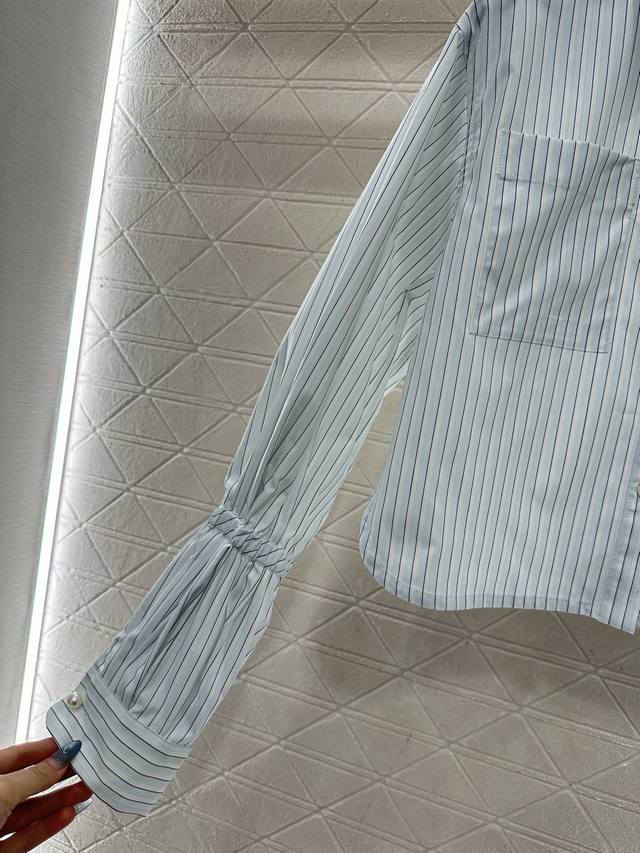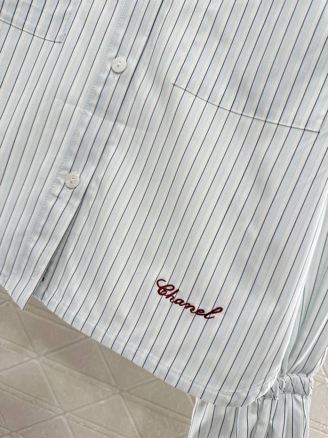 Custom Yb twill cotton, comfortable and delicate texture, collared short shirt cut, versatile vertical stripes, fresh color scheme, symmetrical gathered sleeves at the forearms, and chain patch logo decoration on the inside of the front placket, echoing the embroidery on the hem, layered design showcasing the brand's style, exuding a relaxed and fashionable vibe, easily paired with a skirt or pants for instant sophistication, a basic shirt suitable for daily commutes and vacations, effortlessly creating a chic look. Custom fabric and accessories, look for high-quality version 36 38 40.