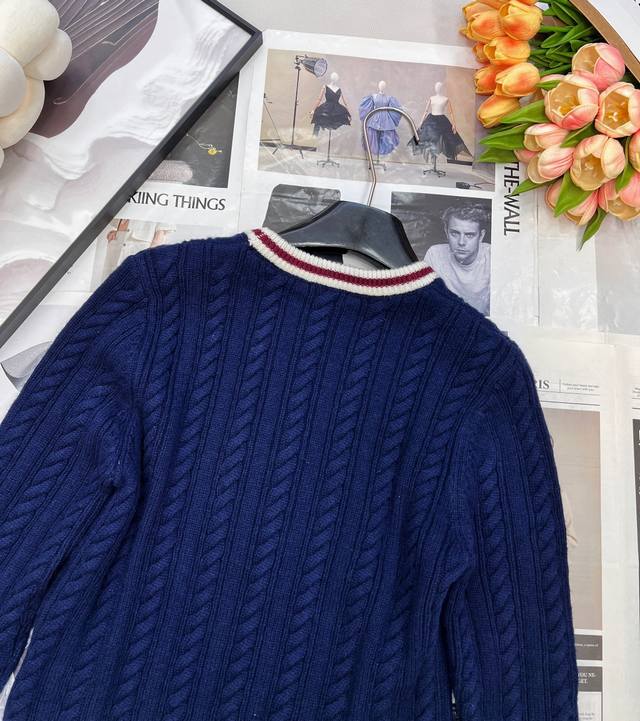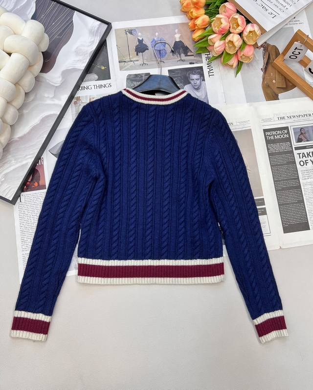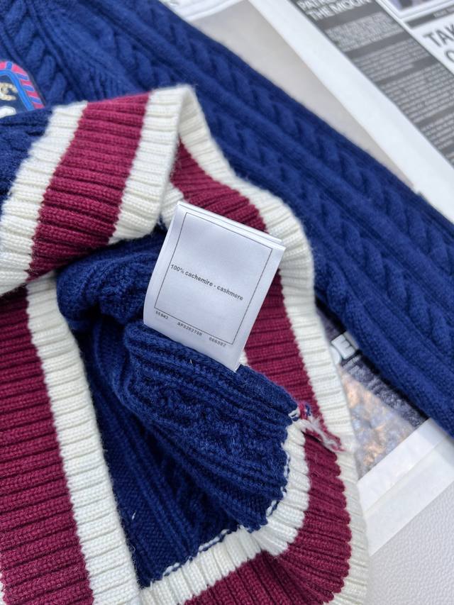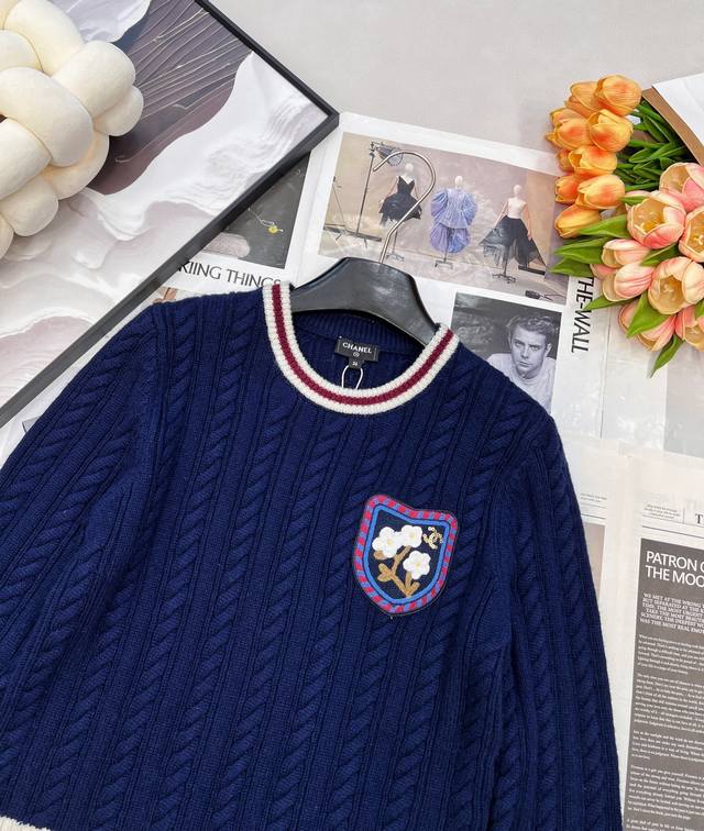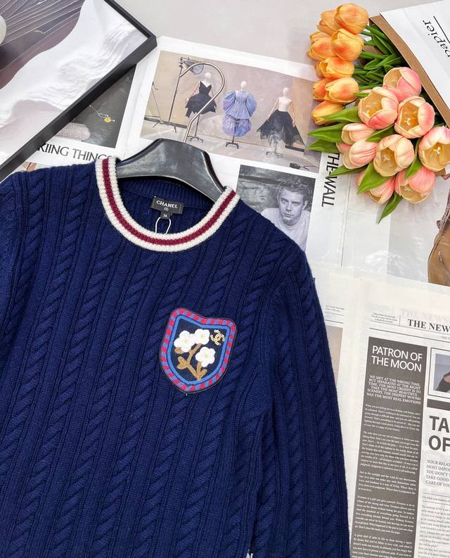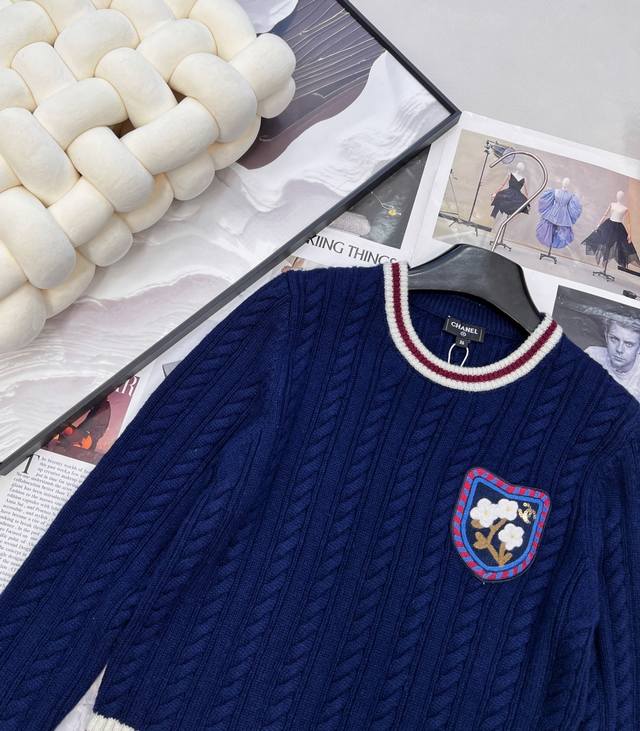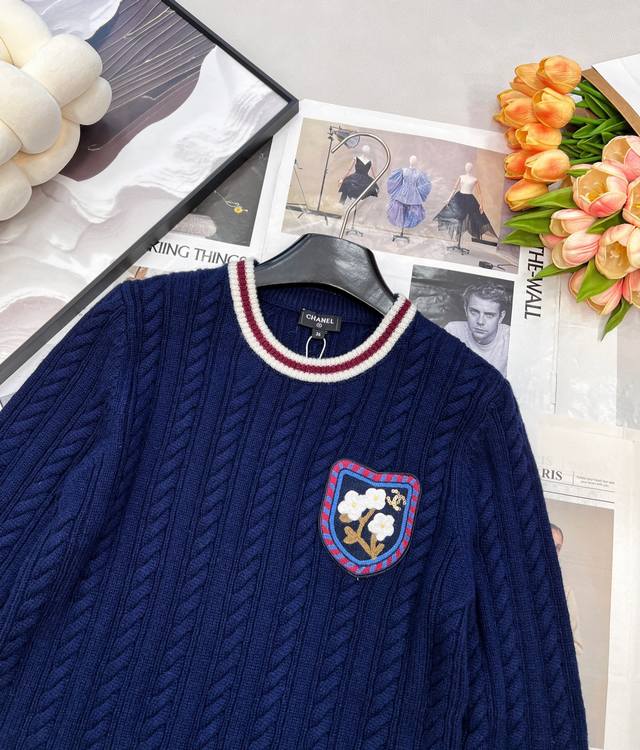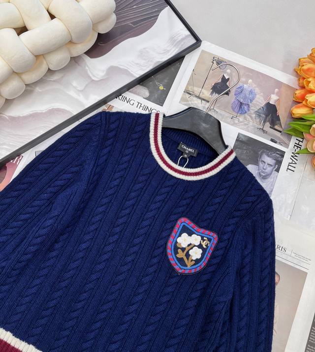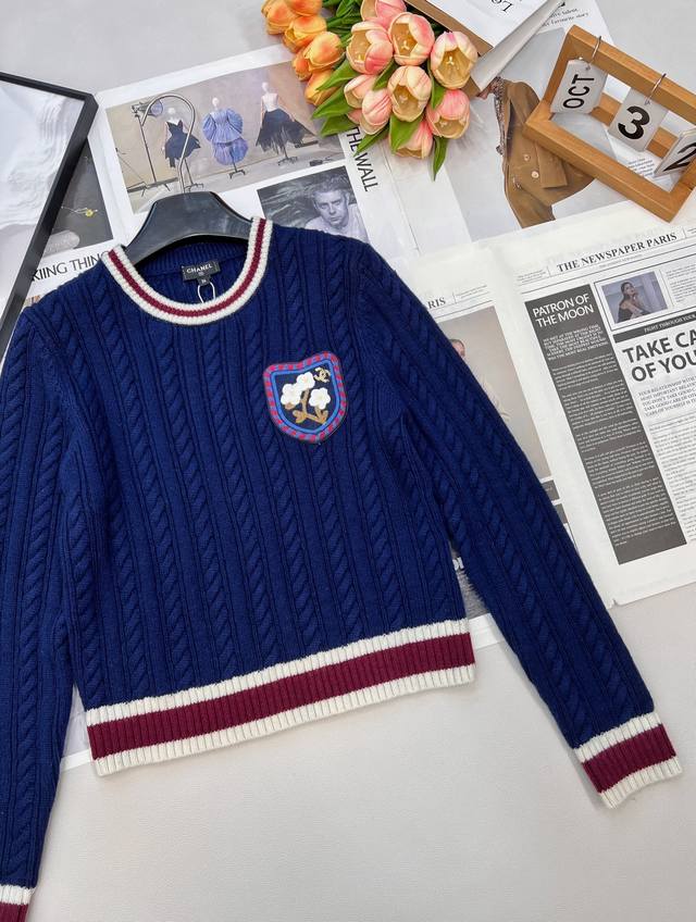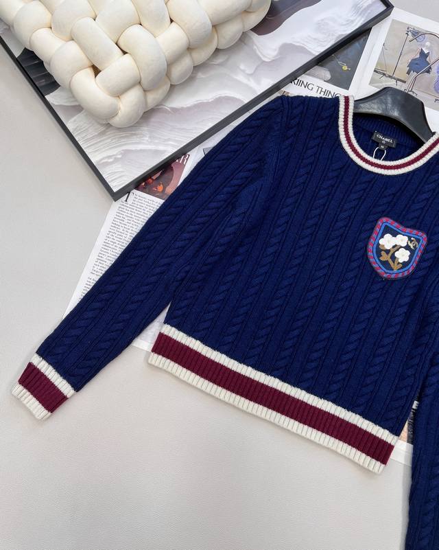 Chanel 2025 New Crew Neck Cable Knit Color-Blocked Pullover Sweater. Made with custom Yb cashmere yarn, it boasts a lustrous texture, is soft and skin-friendly, and features a crew neck pullover cut with alternating vertical cable knit patterns for a slimming and stylish look. The neckline is accented with contrasting colors, while the cuffs and hem echo the details. Elastic ribbed trim ensures a better fit. A camellia embroidered logo adorns the chest, showcasing the brand's playful and youthful style. The overall dark color scheme creates a relaxed and effortless look, perfect for layering in autumn and winter. Custom fabrics and accessories, all tags included. Bulk orders are available. Sizes: S, M, L, DDD. Code: H, DDD.