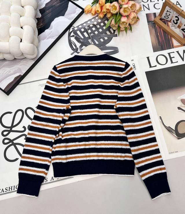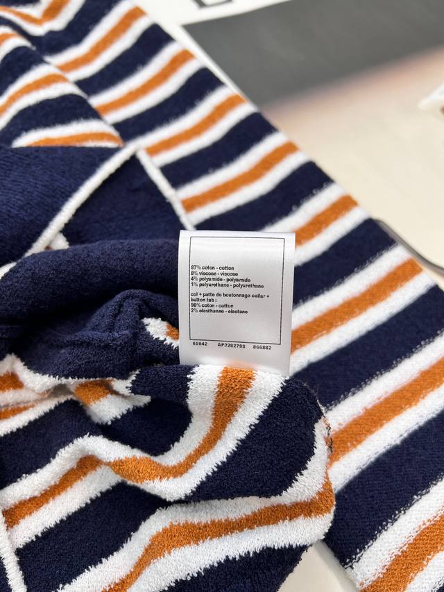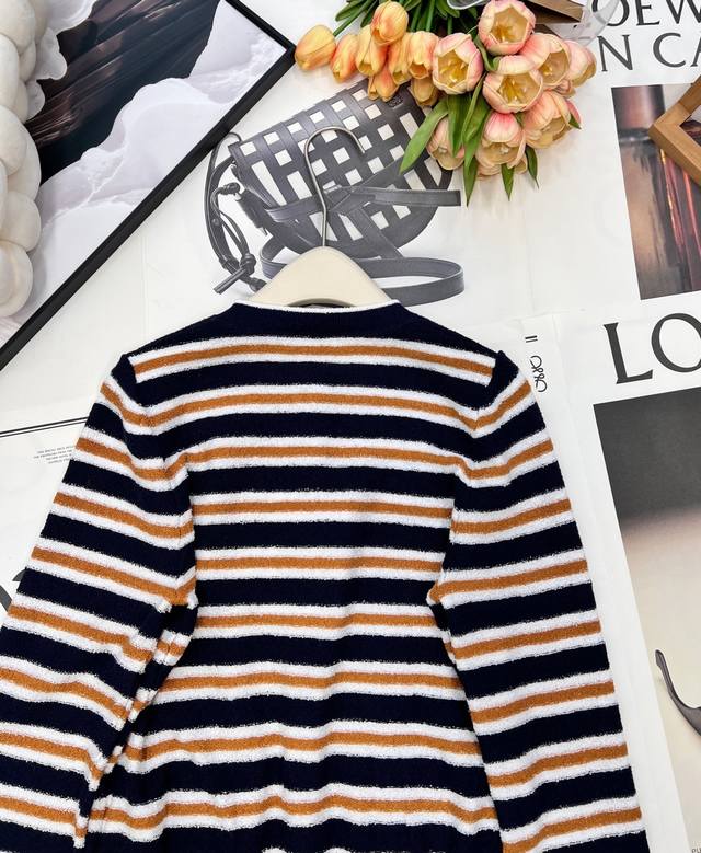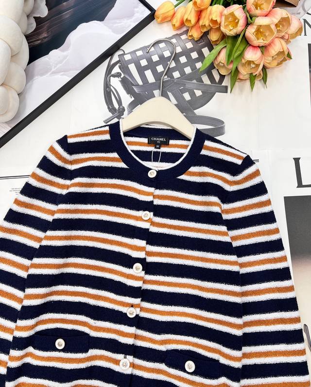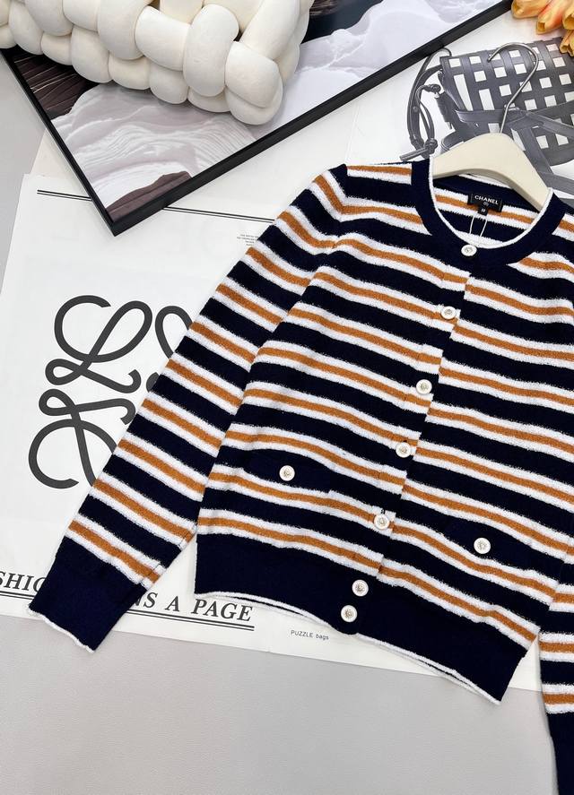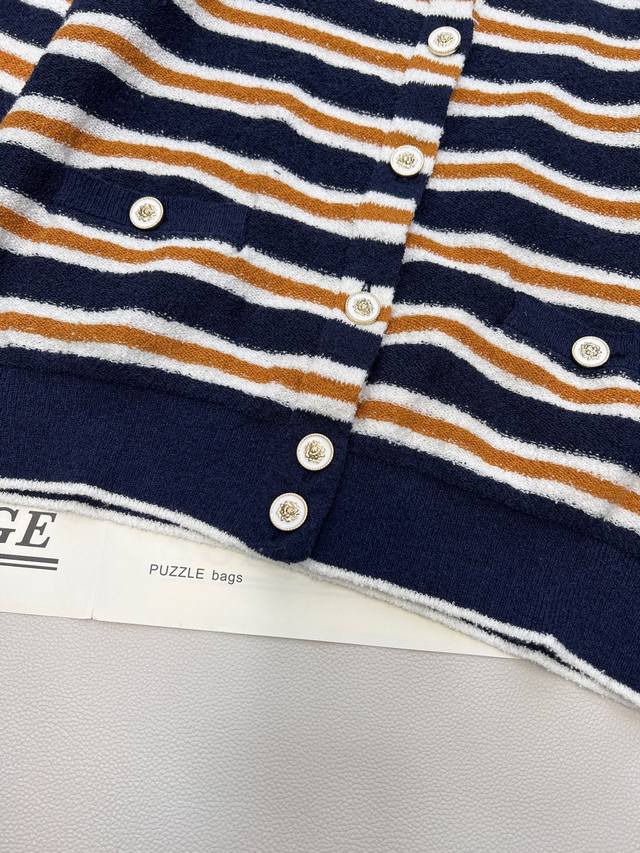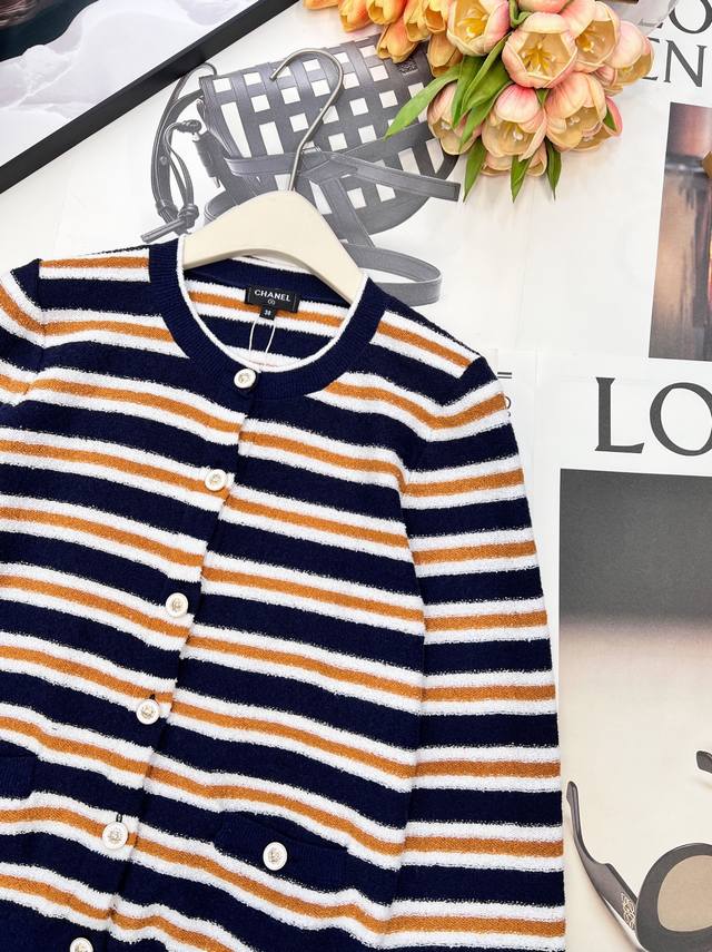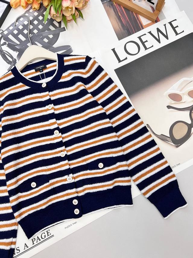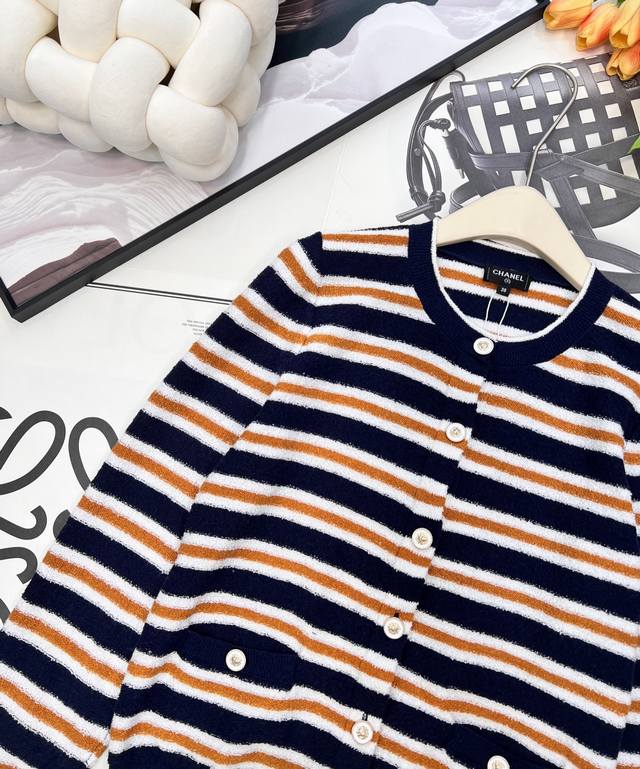 Chanel 2025 New Crew Neck Striped Knit Cardigan, made with custom Yb cotton yarn, soft and delicate, comfortable to the touch. The crew neck design features a camellia logo printed on the front buttons, showcasing the brand's style. The overall design features two-tone horizontal stripes with solid-color ribbed trim, enriching the visual effect and adding a touch of fashion. The elastic fabric with a rich wool texture conforms to the body, giving a simple yet sophisticated and chic look. Custom fabric and accessories, complete with tags. Available in two colors in bulk. Sizes: S, M, L, D, D. Code: H, D. D.