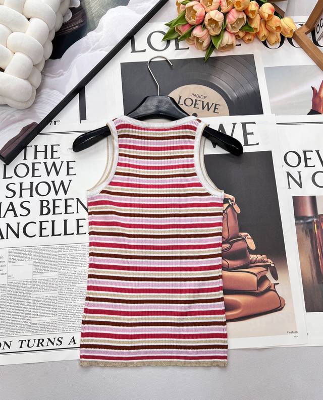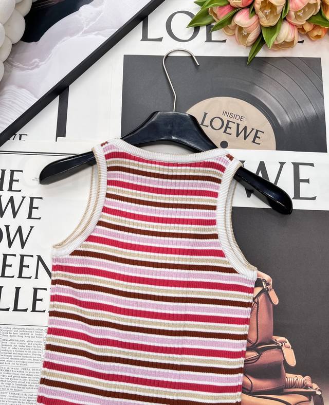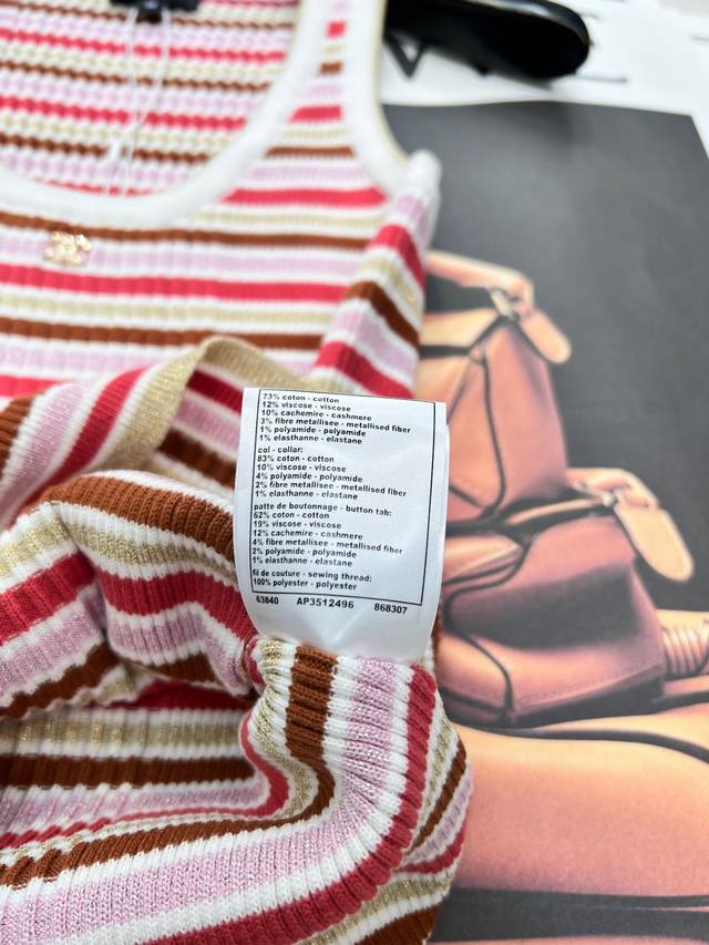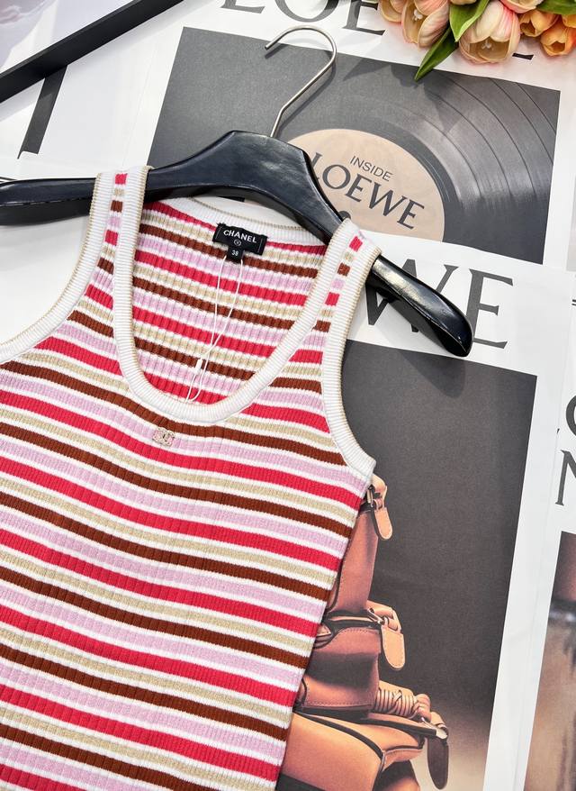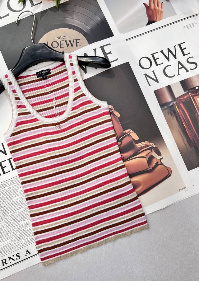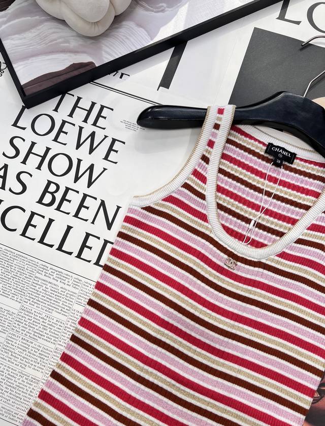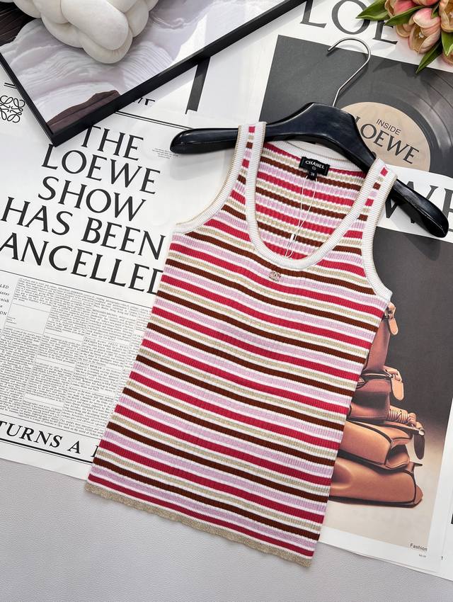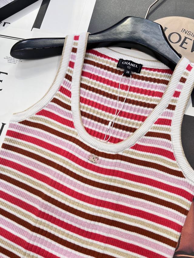 Chanel 2025 New Striped Knit Vest, made with custom Yb cotton yarn, high-quality texture, stretchy and comfortable. The round neck knit vest features striking red and white stripes throughout, and is adorned with rhinestone double C-button embellishments on the front, highlighting the brand's refined style. It's versatile enough to be worn alone or layered in autumn and winter, exuding a luxurious feel. Comes with a drawstring dust bag, custom fabric and accessories, and all three labels are complete. Bulk order, sizes S, M, L, D, D, code H, D, D, D.