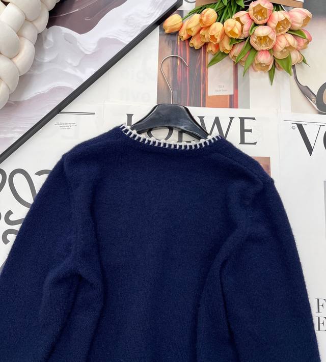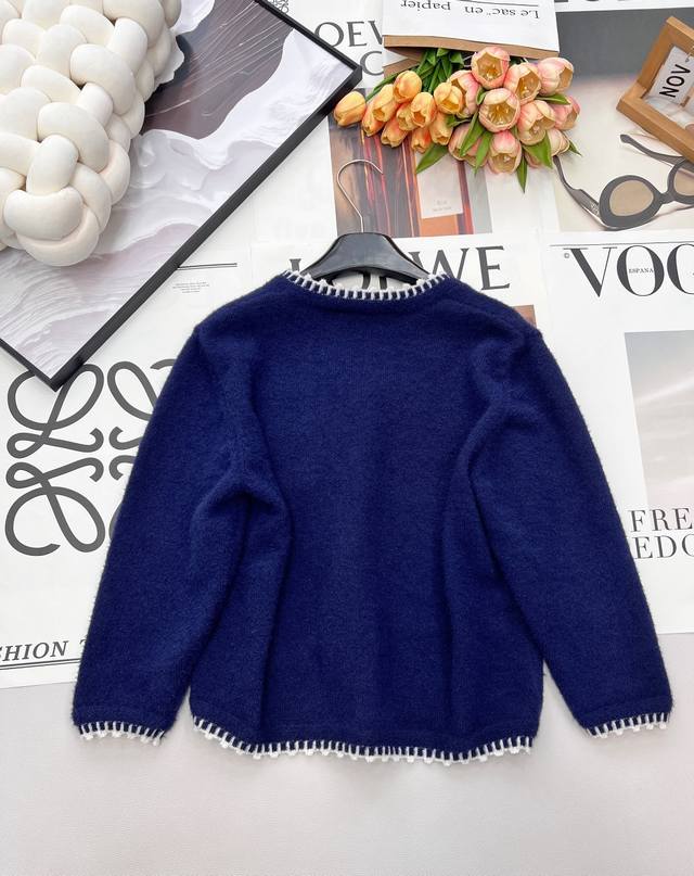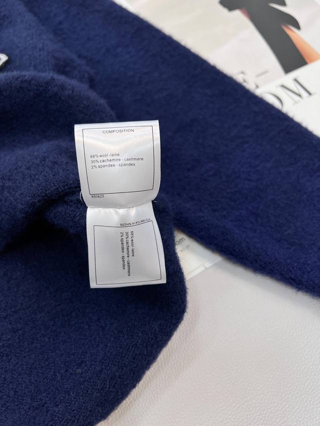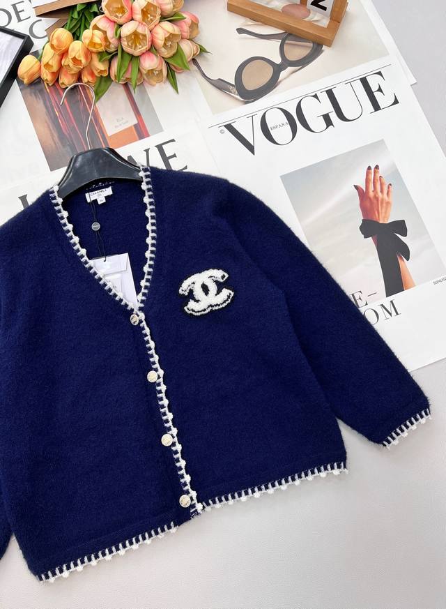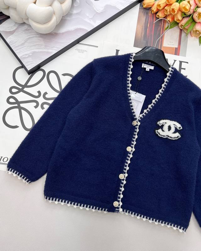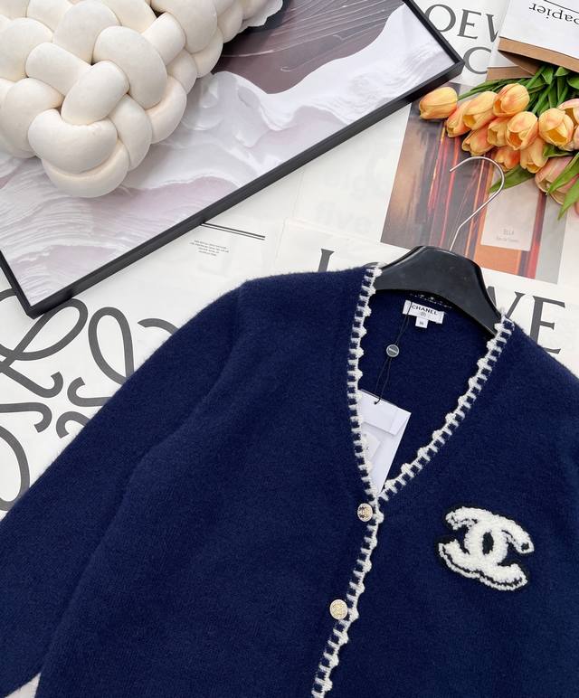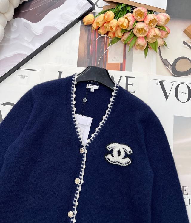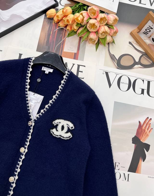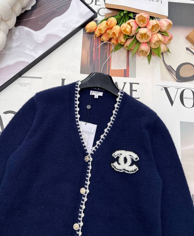 Chanel 2026 New Navy Blue V-Neck Knit Cardigan, a perfect interpretation of French elegance. The navy blue base makes the skin tone even more radiant, while the contrasting white tassel trim along the V-neck, placket, and hem creates a dynamic layered look. The soft and supple knit feels incredibly gentle. The classic V-neck flatters the neckline, and the double C embroidered logo and metal buttons add a touch of exquisite detail. It can be worn alone or layered to create a relaxed yet sophisticated look. The H-line cut is flattering and slimming, a must-have for any woman looking elegant and sophisticated! Classic is always fashionable, the fit is excellent, and the elegant and casual style is universally flattering. The logo pattern buttons exude a fashionable and delicate charm. This cardigan is so high-quality, both in terms of fit and fabric. It makes you look like a wealthy heiress. All three labels are included. Bulk orders available. Sizes S, M, L, C. Code H.