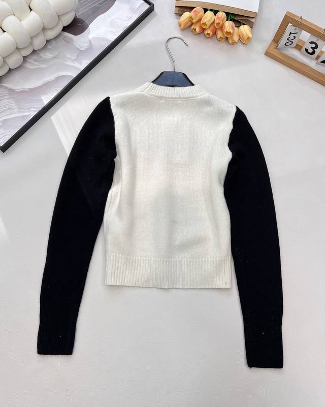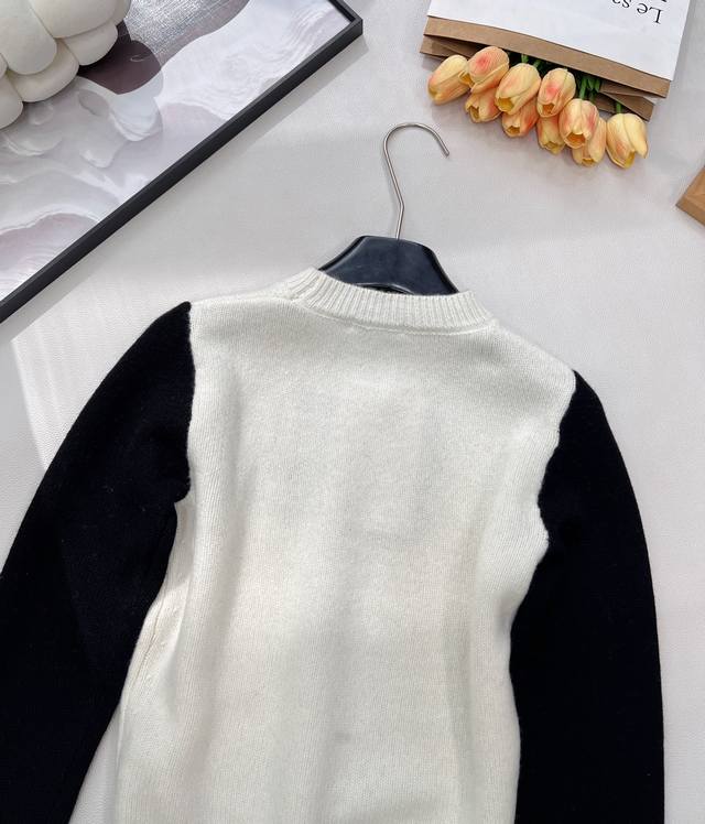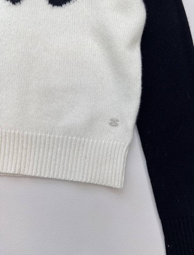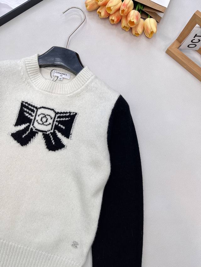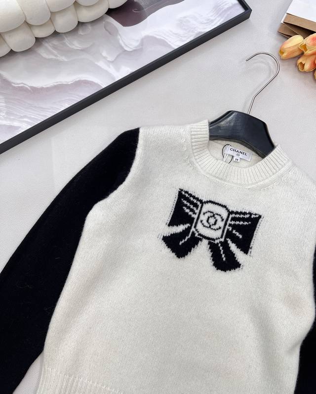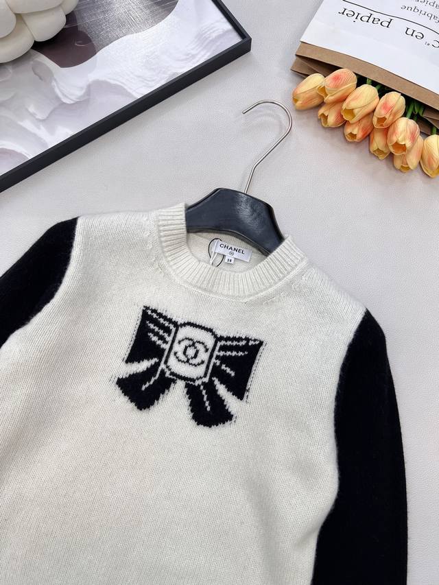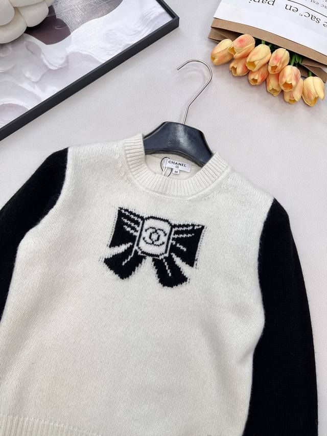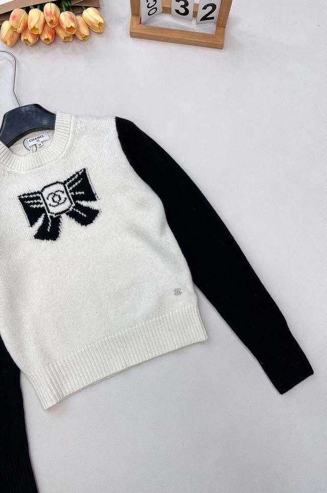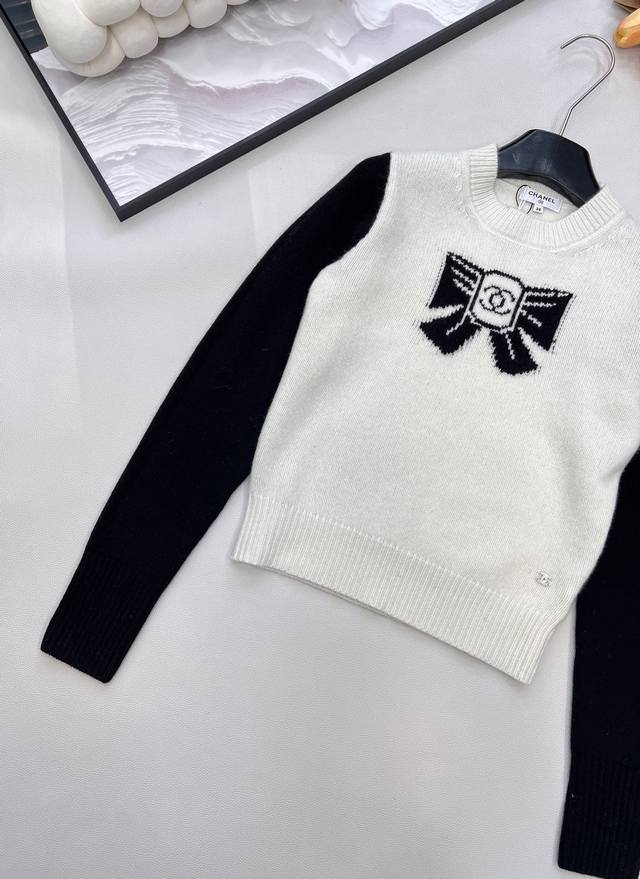 Chanel 25N New Ski Season Collection Double C Bow Knit Sweater | Exclusive Yb Development! High-Quality Production! Made from select soft knit fabric, combining a skin-friendly feel with autumn/winter warmth. The sweater features a black and white contrasting 3D bow pattern at the center, with the classic double C logo embedded in the center. The off-white base is paired with black long sleeves. The round neck and slightly loose fit flatter various body types, exuding a sophisticated yet relaxed style! All tags are complete. Bulk orders are available. Sizes S, M, L, DDD. Code H, DDD.