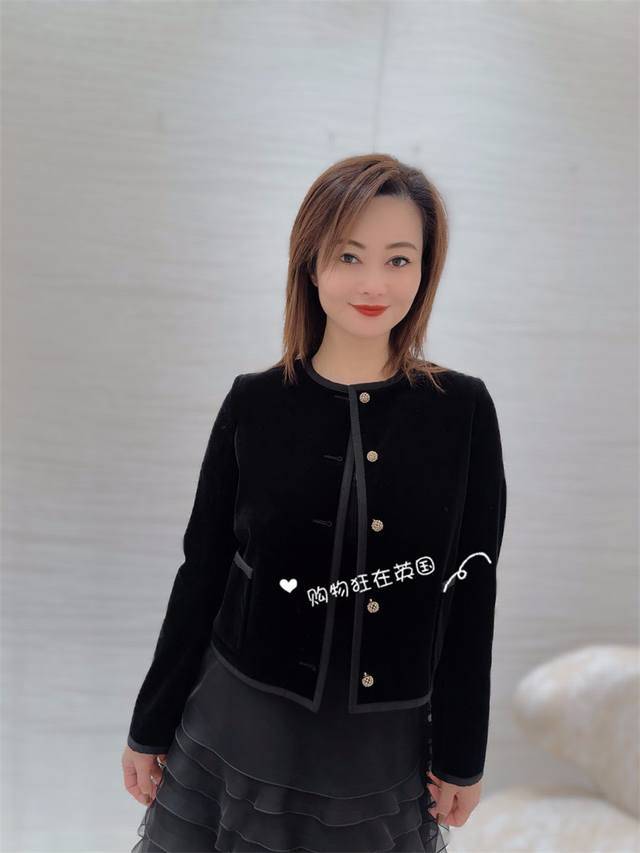 Chane*L New Arrival, Official Website Release: High-end Custom Imported Gold Velvet Short Plush Fabric, Classic D Brand Cd Rhinestone Beaded Small Gold Buckle Webbing Trim Button-down Placket Round Neck Short Velvet Jacket! Premium Black, Sizes 36-38-40-42. Size 38: Shoulder width 37cm with shoulder pads, Bust 94cm, Sleeve length 59cm, Jacket length 52cm.