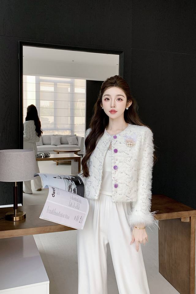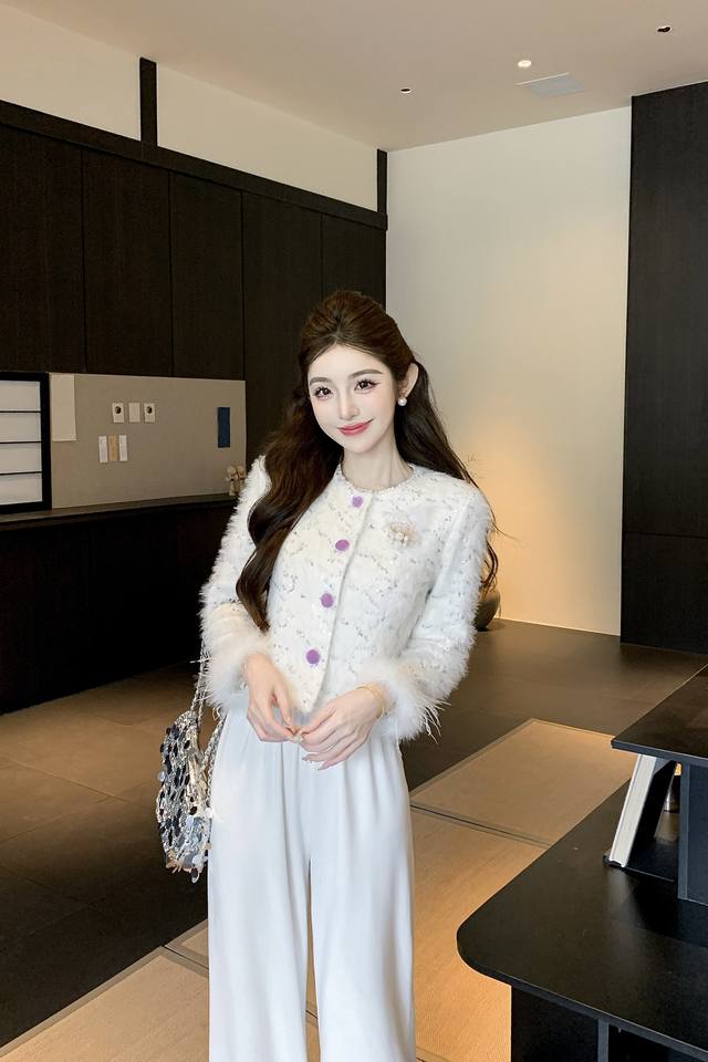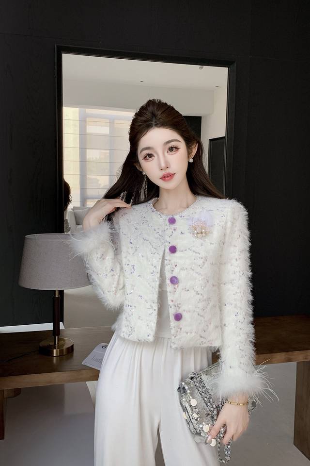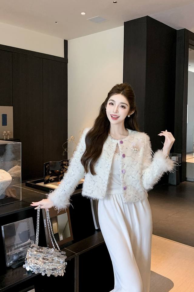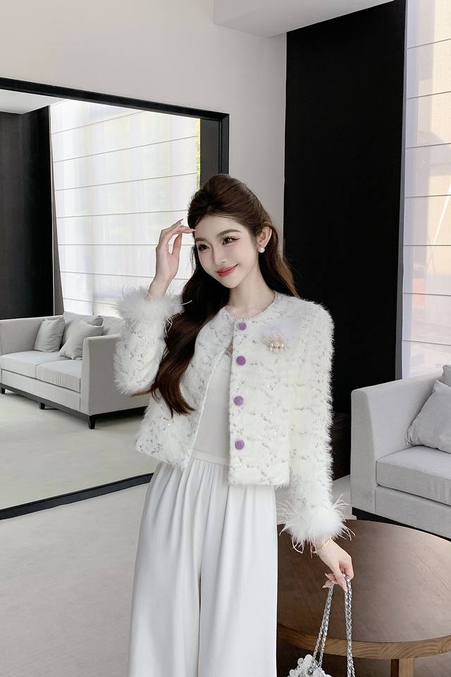 Chane*L New High-End Custom Heavy-Duty Sequined Plush Blend Jacket with Pearl Tr