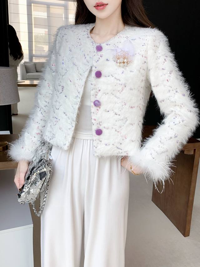 Chane*L New High-End Custom Heavy-Duty Sequined Plush Blend Jacket with Pearl Trim at the Neckline - Short, Elegant Chanel-Style Jacket! Size M: Bust 94cm, Sleeve Length 54cm, Length 47cm (DDD)