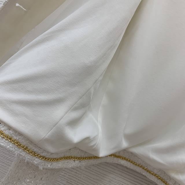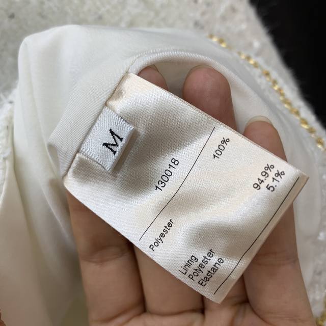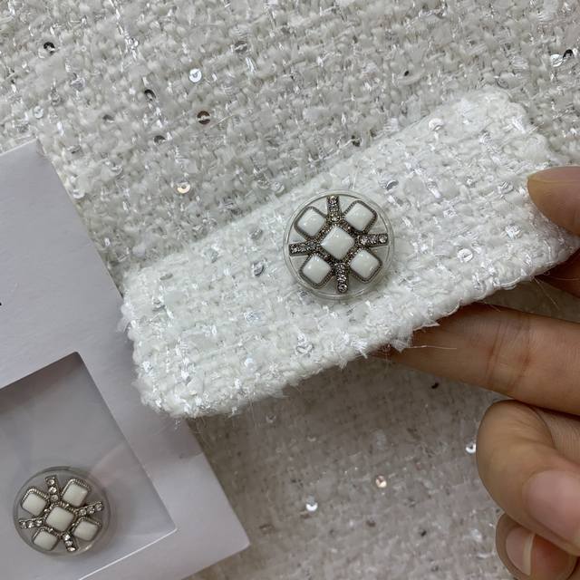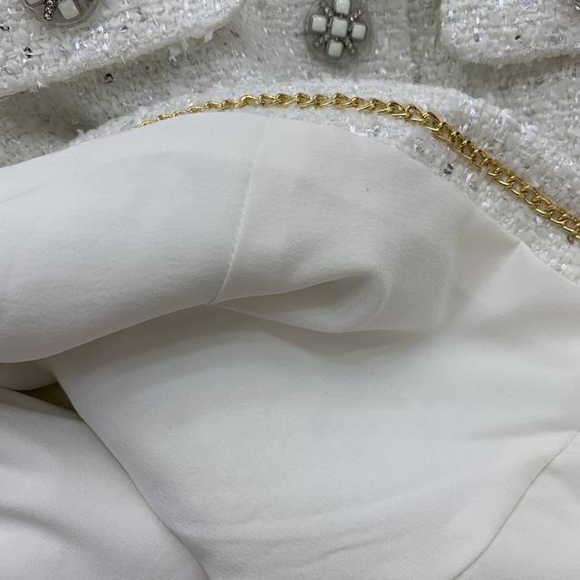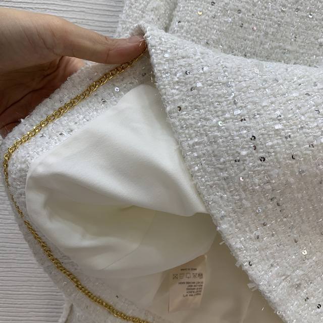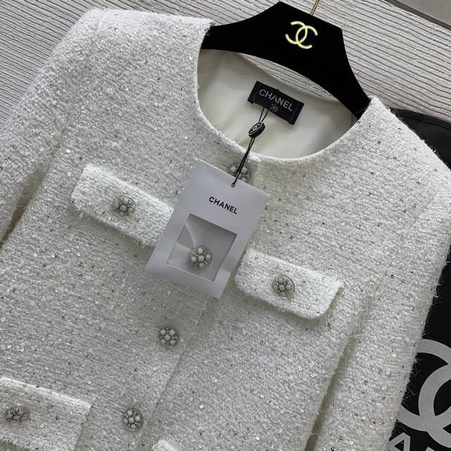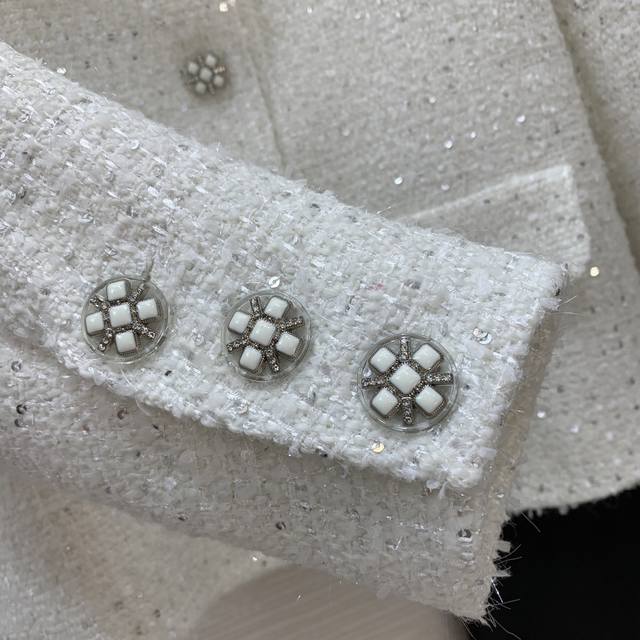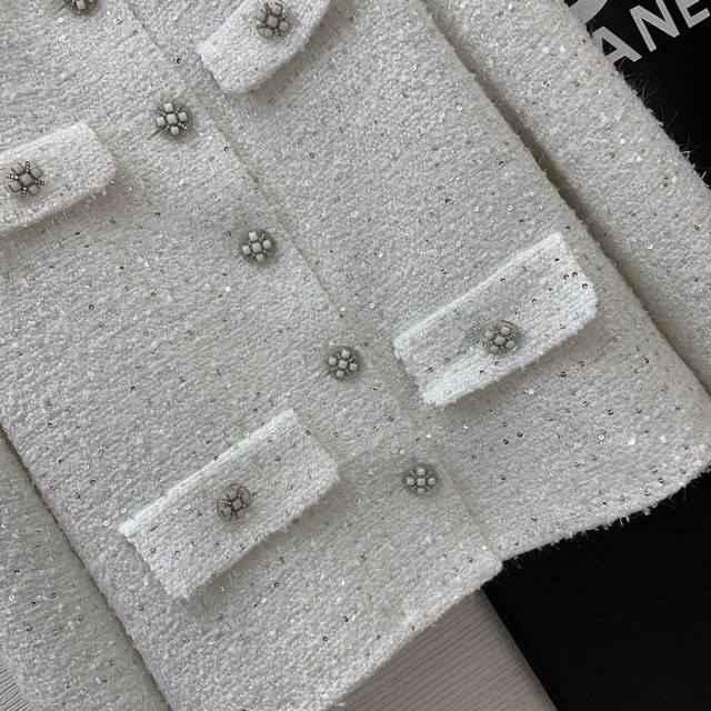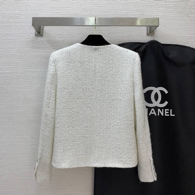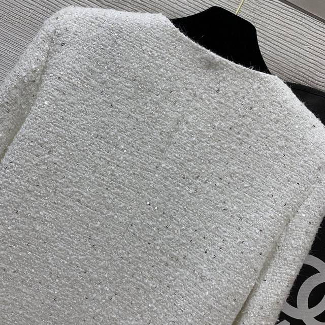 Chanel* New high-end custom-made jacket with metal chain stitching on the inside of the hem, draped and stylish, with silver sequins for a high-end, sparkling look. Short, Chanel-style round neck long-sleeved tweed jacket! Price: P (excluding dust bag). Size M: Shoulder width 38cm (with shoulder pads), Bust 94cm, Sleeve length 59cm, Length 54cm. (