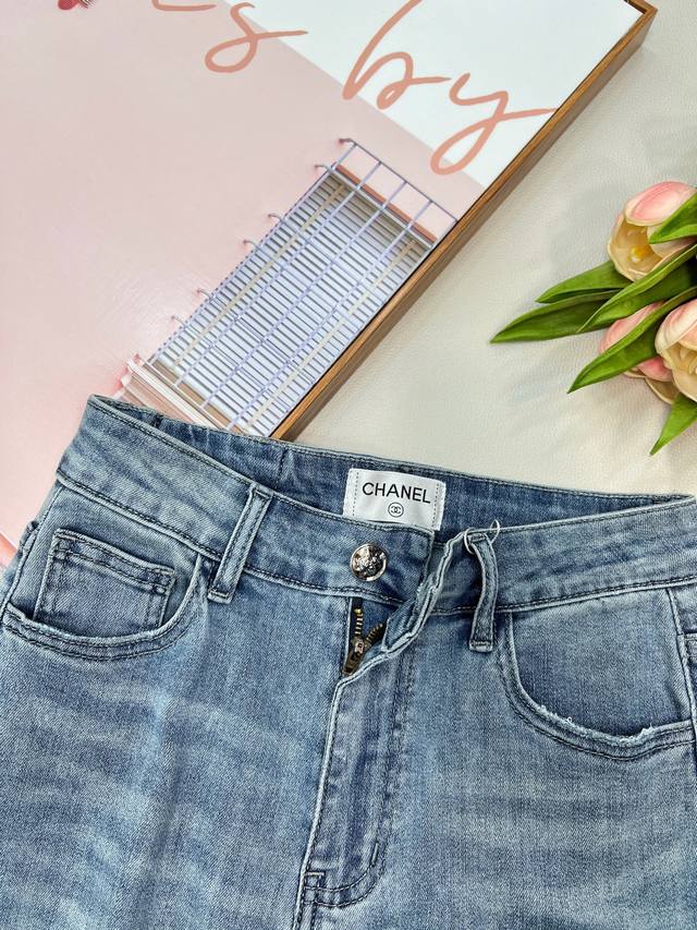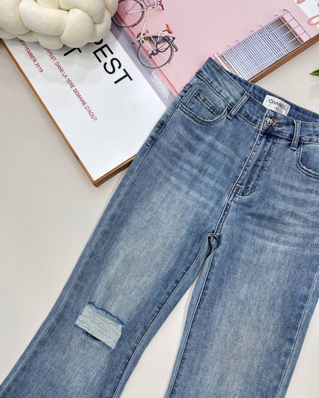 Chanel Xiaoxiangjia*25 new summer style double C sequined elastic flared pants with back pockets! Exclusive opening, autumn and winter hot style, front hole design plus back pocket sequins, unique texture, customized imported denim washed denim cotton elastic fabric, high elastic fabric, hip lifting and abdomen tightening, flared design shows body curves, elongates perfect body proportions, can be controlled by any body shape, customized accessories, fine workmanship~, three labels are complete, large goods are shipped