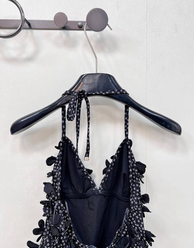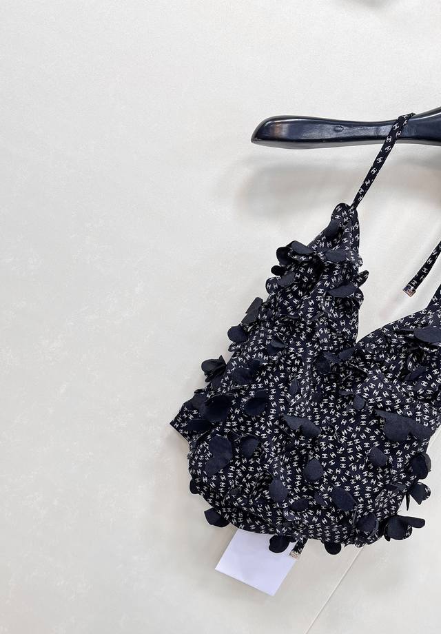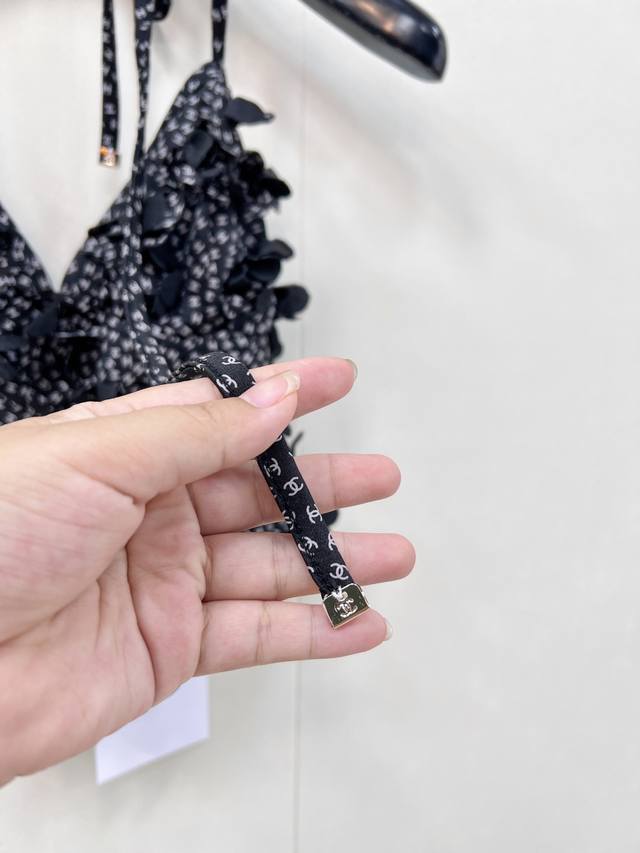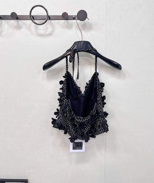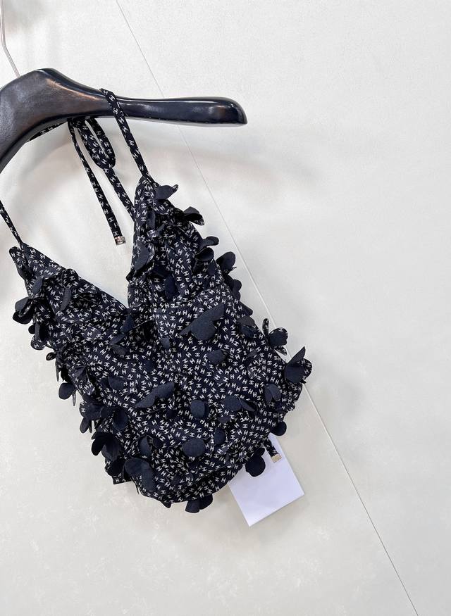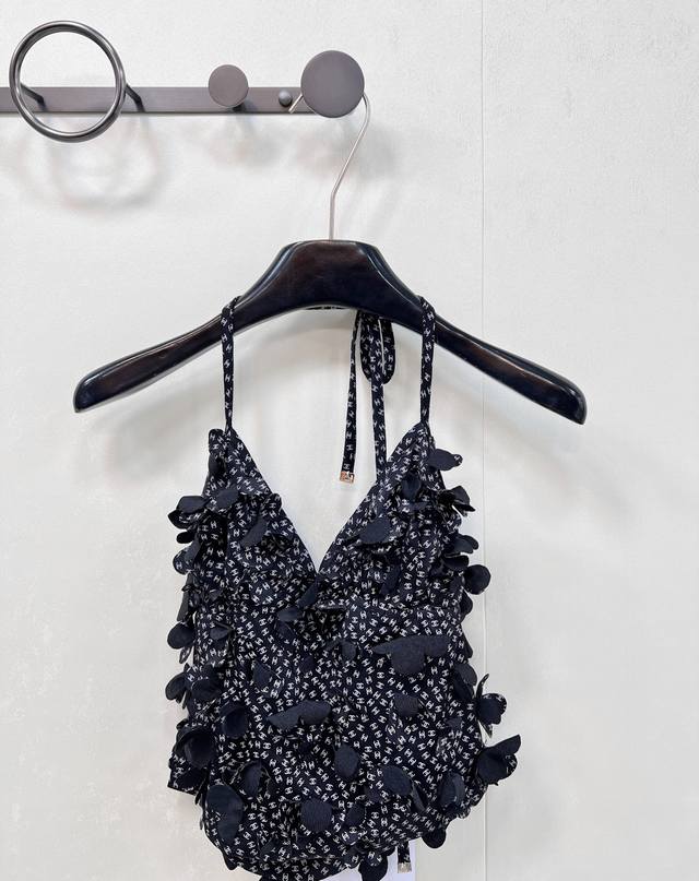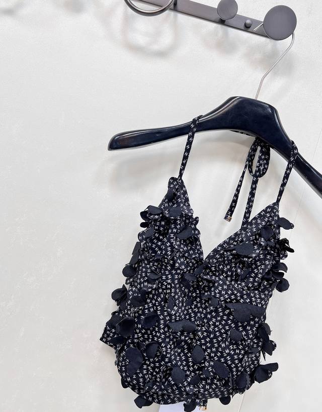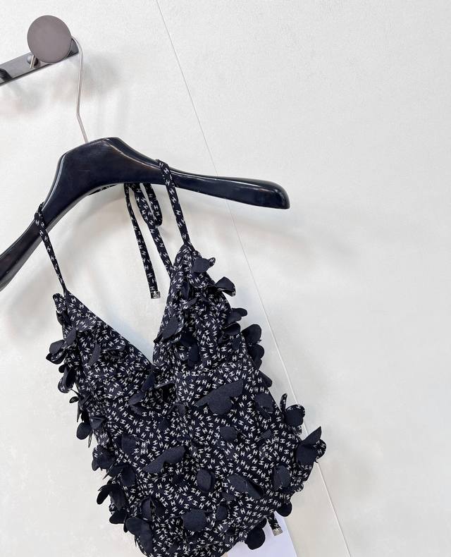Chanel2025 new halter neck camisole, customized Yb imported material texture glossy high-end comfortable halter neck camisole, the whole body is available in black and white, the whole body is embellished with double C letter logo and the three-dimensional petal shape is full of fragrance. The luxurious and gorgeous style lace-up halter neck camisole modifies the shoulder and neck lines, which is cute and sexy. The appearance is high-end and full of texture. Paired with a waist belt and a short skirt, the detailed texture design echoes and easily becomes the visual focus. The whole set is more charming and the first choice for vacation dates. Three complete labels, large goods are available in