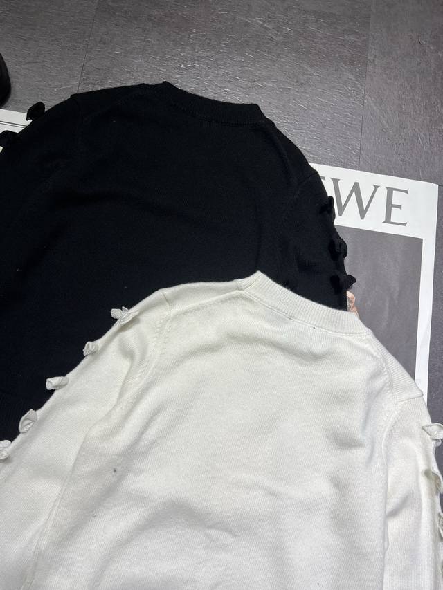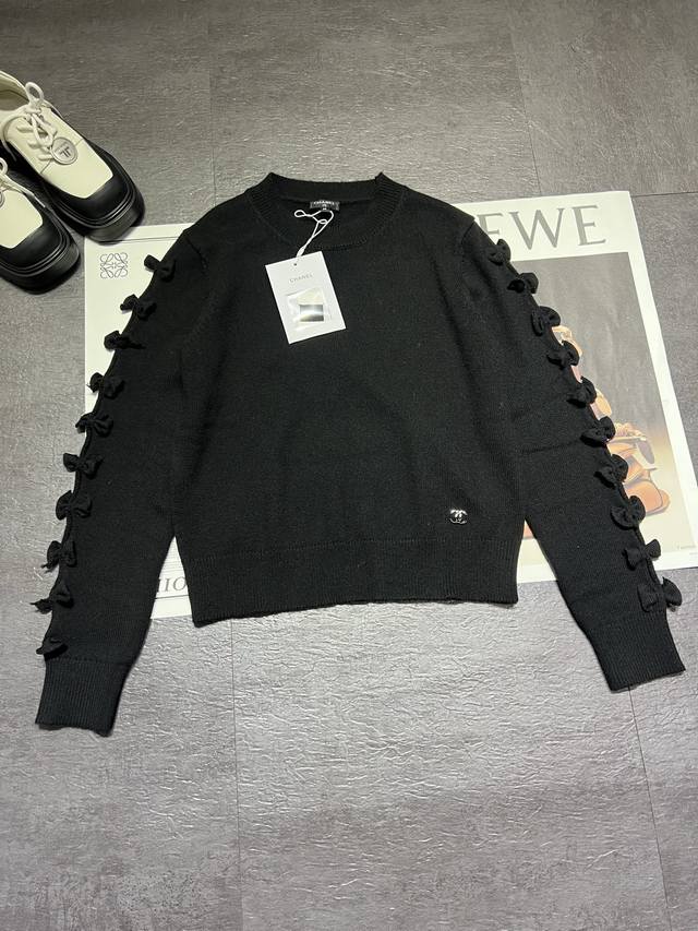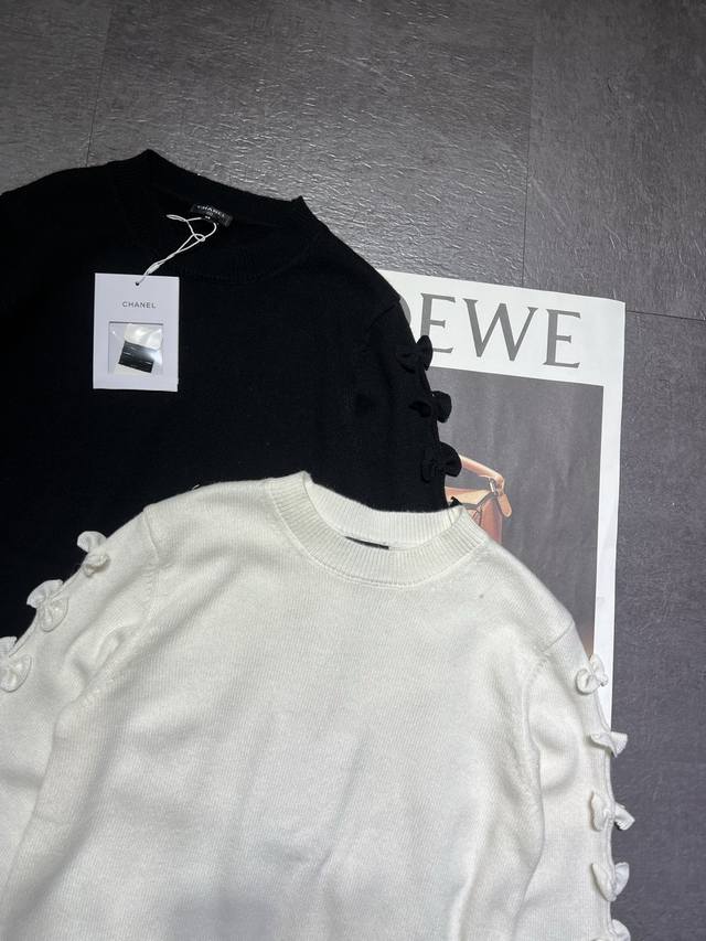 Chanel*25K Autumn/Winter New Bow Series Crew Neck Sweater, custom wool yarn, custom hand-knitted bows on the cuffs, classic black and white, simple and elegant, showcasing a high-end fashion sense. Available in S, M, D, and D colors.