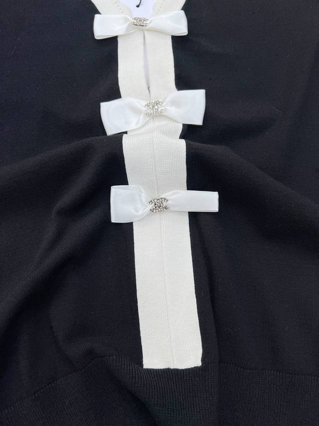 Classic black and white contrast, V-neck + lace design, with a gentle filter~ Three bows are scattered and embellished, exquisite and playful The knitted fabric is soft and skin-friendly, refreshing and breathable in summer, daily outings, dates, afternoon tea, just put it on and you will feel noble and relaxed. It is a proper "Human Chanel" dressing template. Put it on and you will become an exquisite lady in seconds. Two colors and three standards are complete!
