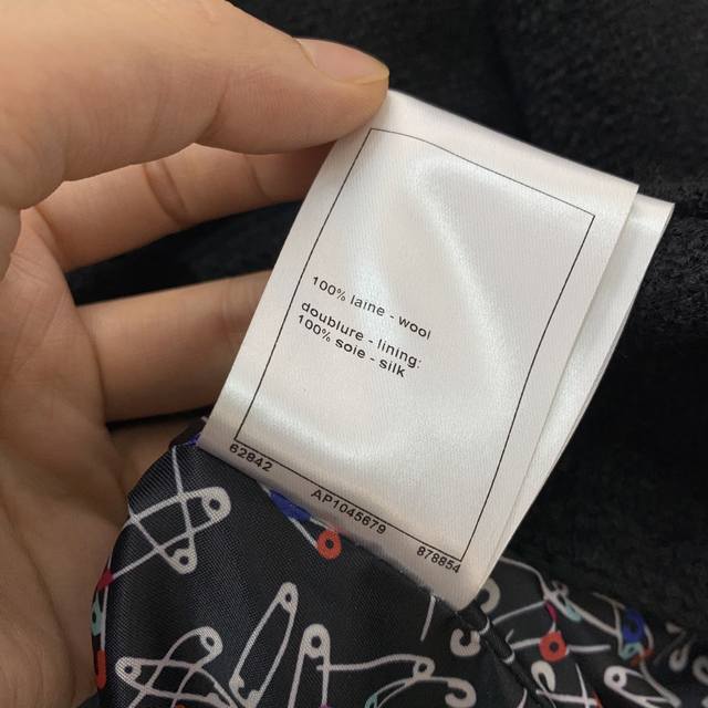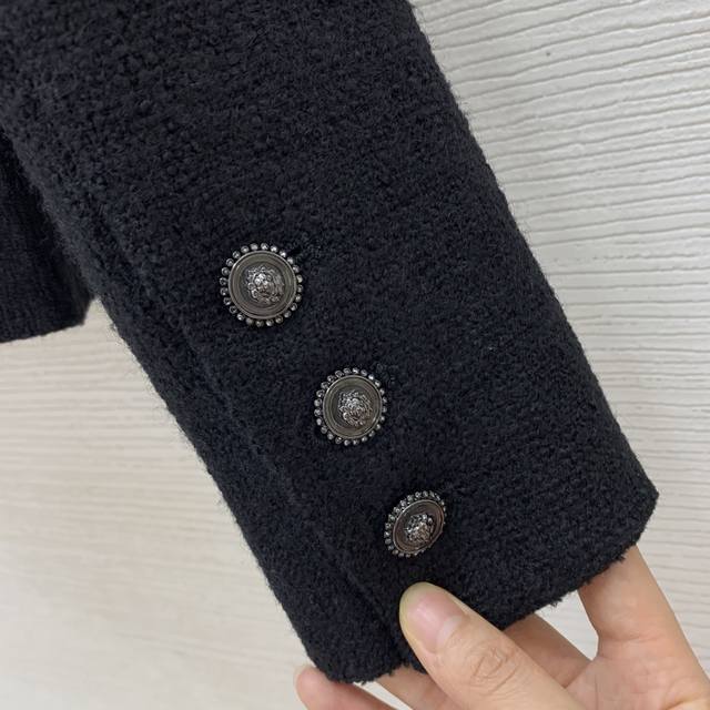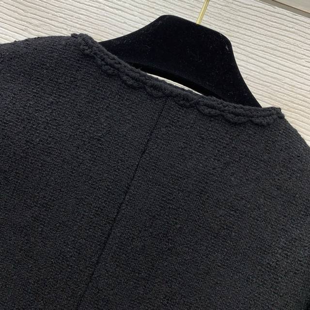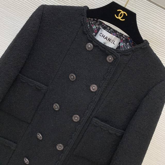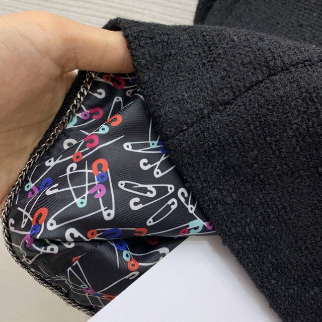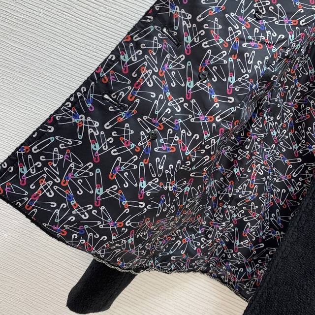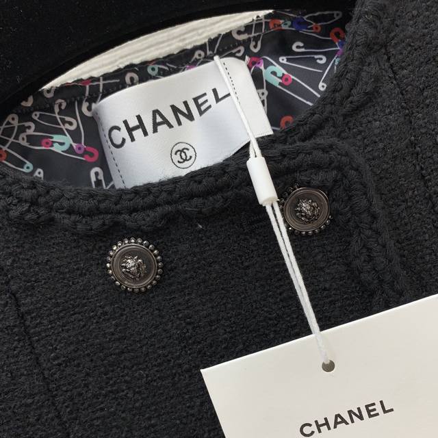 Chane*'s newest Chanel jacket features a custom-made colorful safety pin print lining and a metal chain sewn inside the hem for a stylish drape! This double-breasted, hand-woven, cable-trimmed tweed jacket is a short, long-sleeved, round-neck Chanel-style jacket! Black, Size L: Shoulder 37cm, Chest 94cm, Sleeve 60cm, Length 58cm