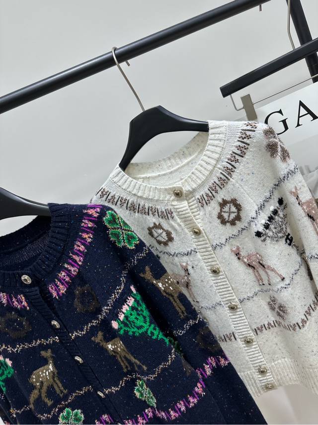 Double C Snowflake Four-Leaf Clover Single-Breasted Cardigan DDD, Fabric: Wool and Cashmere Blend DDD Colors: White, Navy DDD Chanel 25N Ski Collection Deer Knit Cardigan DDD Fair Isle Jacquard Technique DDD Retro Elements such as Snowflakes, Deer, and Animal Footprints DDD Super atmospheric cashmere blend with fine silver shimmer, excellent texture DDD Soft and comfortable to the touch, loose fit with metal buttons DDD Stylish for layering or wearing alone DDD Easily suitable for Christmas parties and winter outings DDD A representative piece from Victoria's Secret's last ski collection, with extremely high collectible value DDD Flat Size: DDD S: Raglan sleeves, Bust 92 (elastic), Length 57, Shoulder/Sleeve Length 75 DDD M: Raglan sleeves, Bust 96 (elastic), Length 58, Shoulder/Sleeve Length 76 DDD L: Raglan sleeves, Bust 100 (elastic), Length 59, Shoulder/Sleeve Length 77 DDD Manual measurements may have an error of 2-3 cm, which is within the normal range.