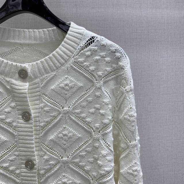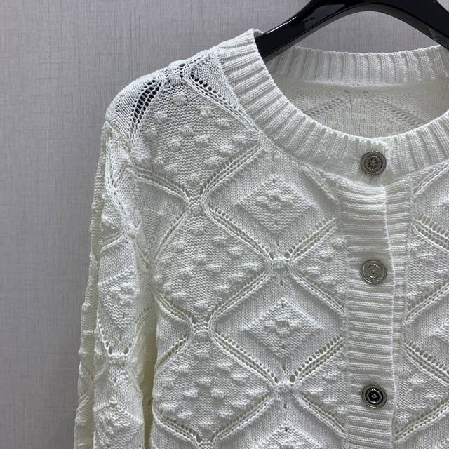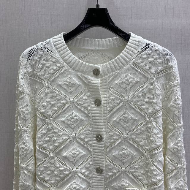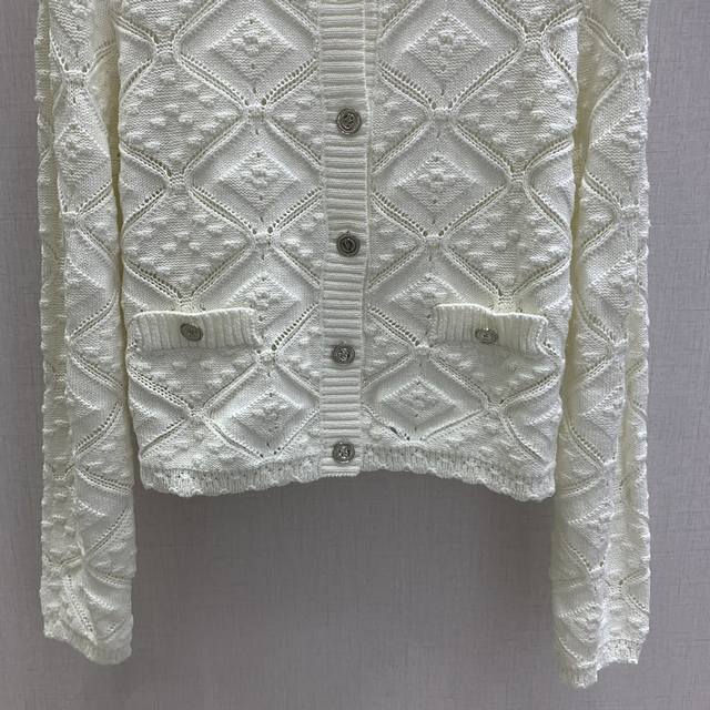 Highly recommend Chane*'s 2025 new diamond-patterned knit cardigan, featuring an exquisite openwork pattern. This round-neck button-down cardigan is soft and comfortable. It pairs beautifully with skirts or pants, creating an effortlessly elegant look. Available in one color, sizes S, M, L, and